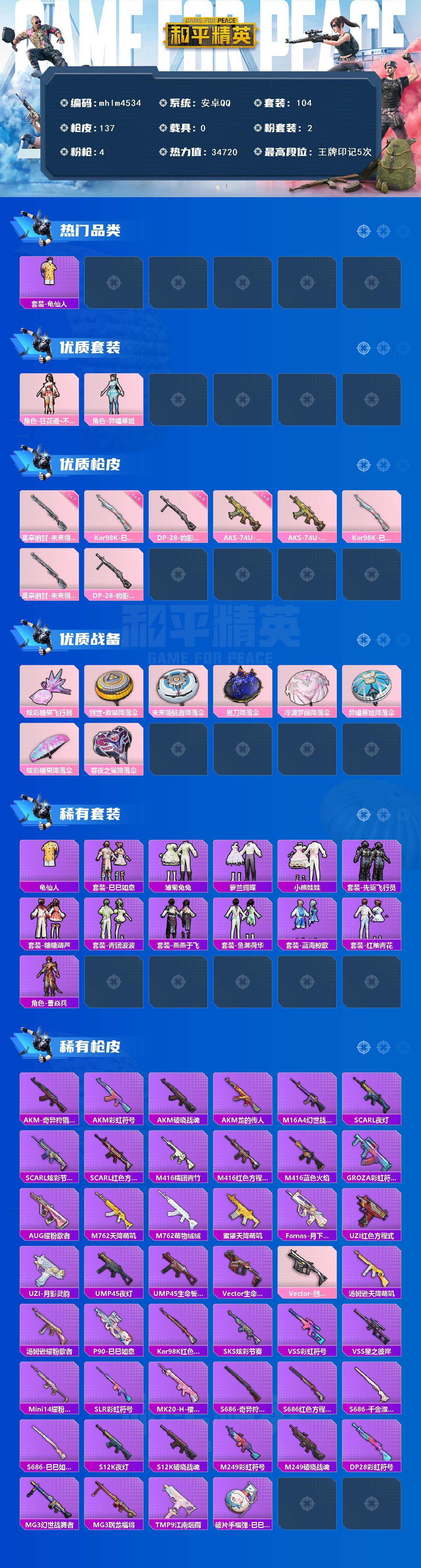【mhlm4534】安卓 手Q-2粉装-4特效枪-0载具-1粉色飞行器-34720热力值-5王牌印记-104套装-137枪皮