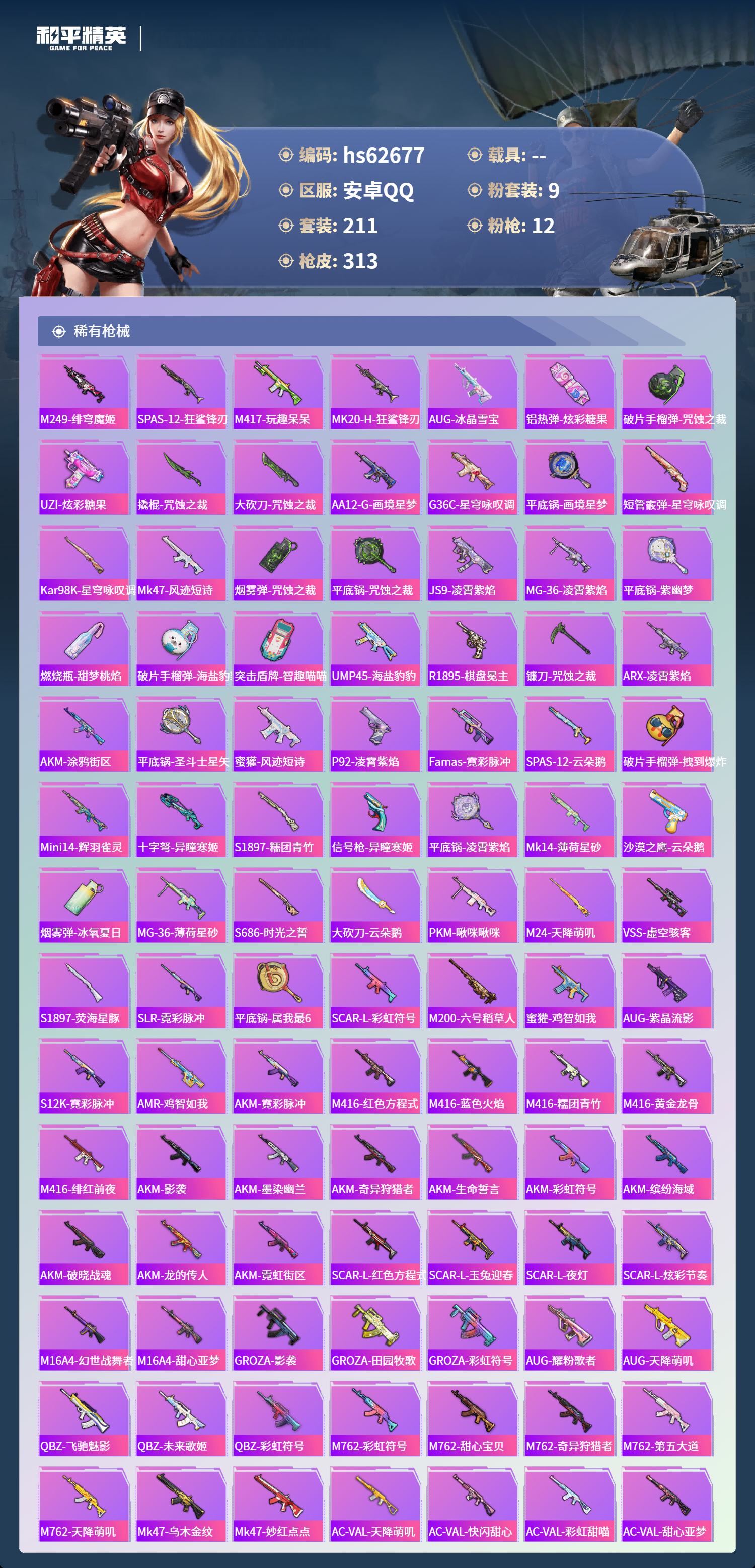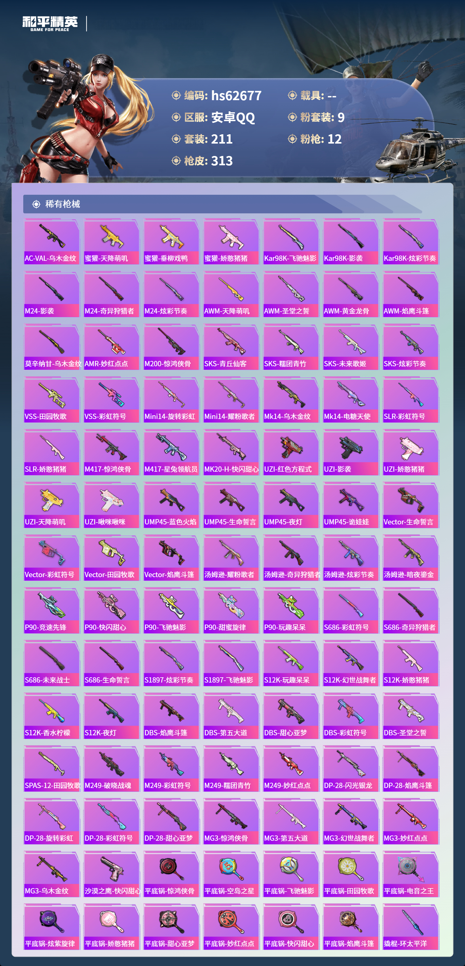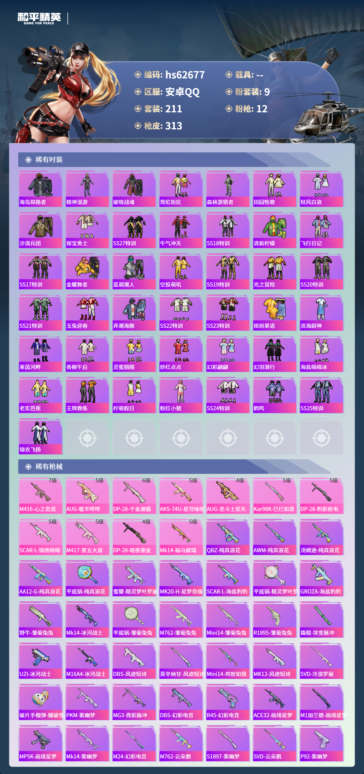 hs62677 安卓手Q-18王牌印记-9粉装-12特效枪-92413热力值-211套装-313枪皮-8卓越印记-3传奇印记