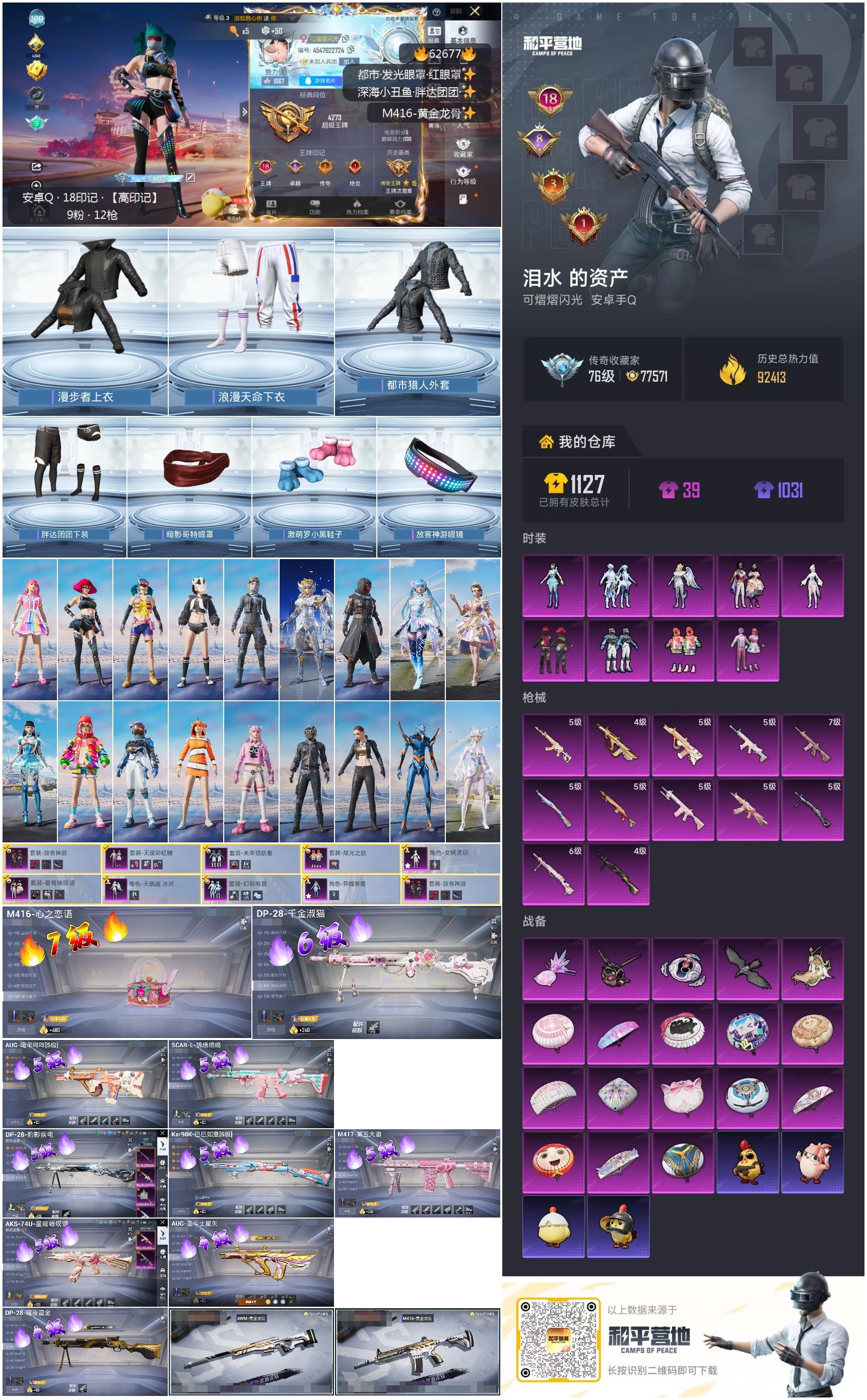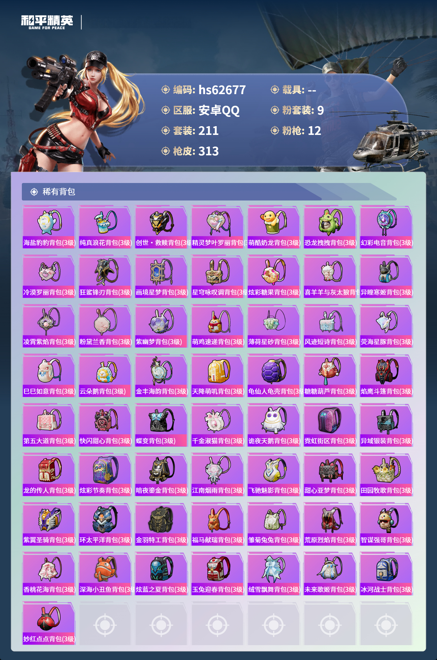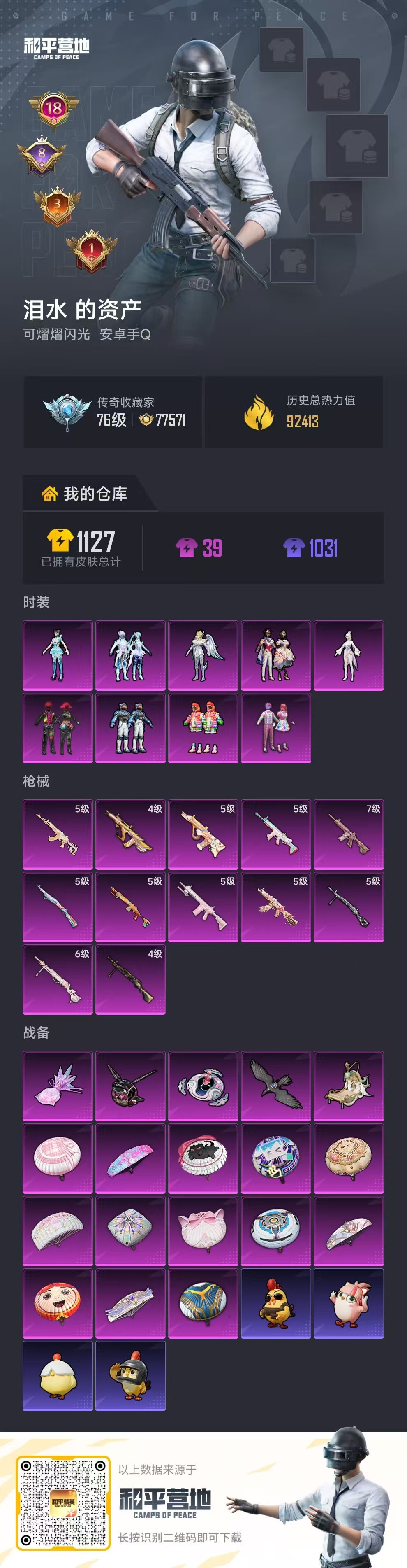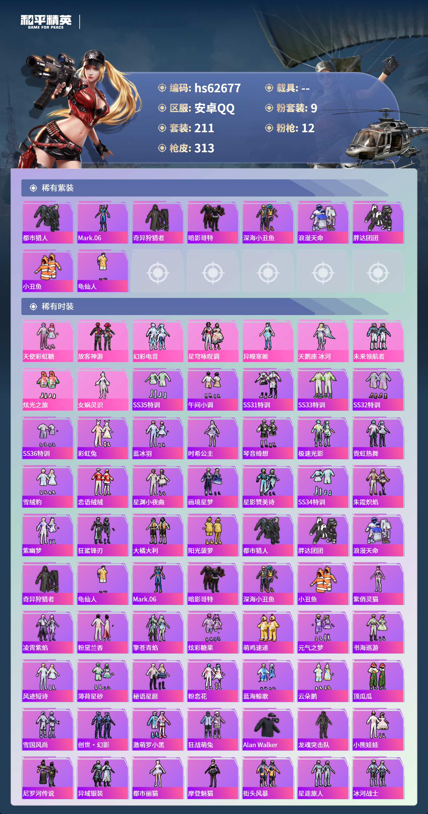 hs62677 安卓手Q-18王牌印记-9粉装-12特效枪-92413热力值-211套装-313枪皮-8卓越印记-3传奇印记