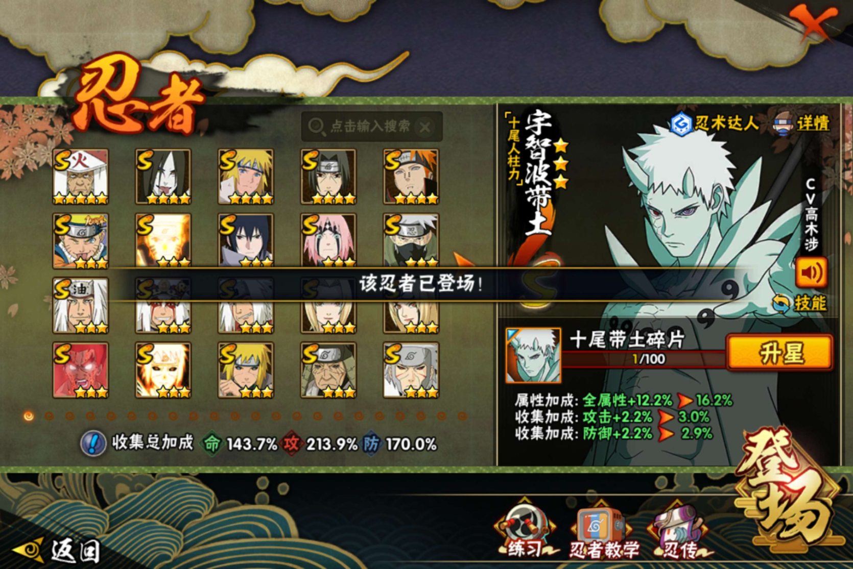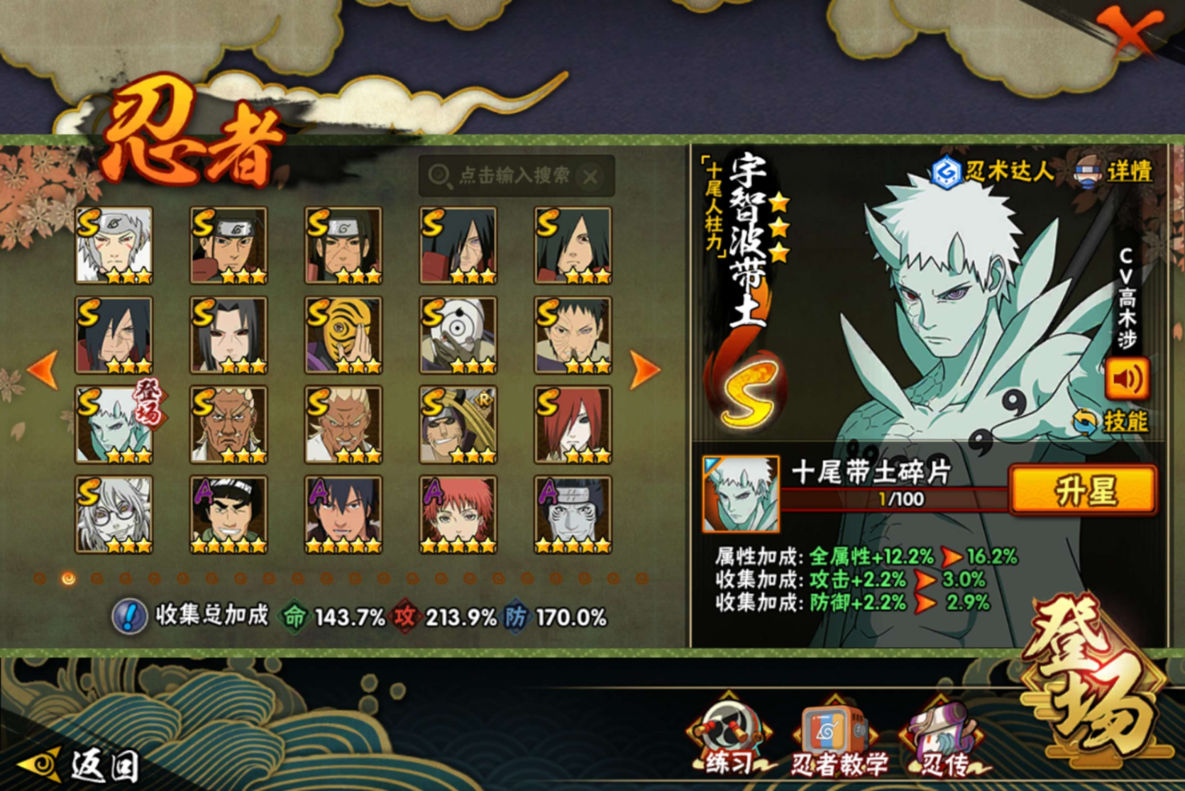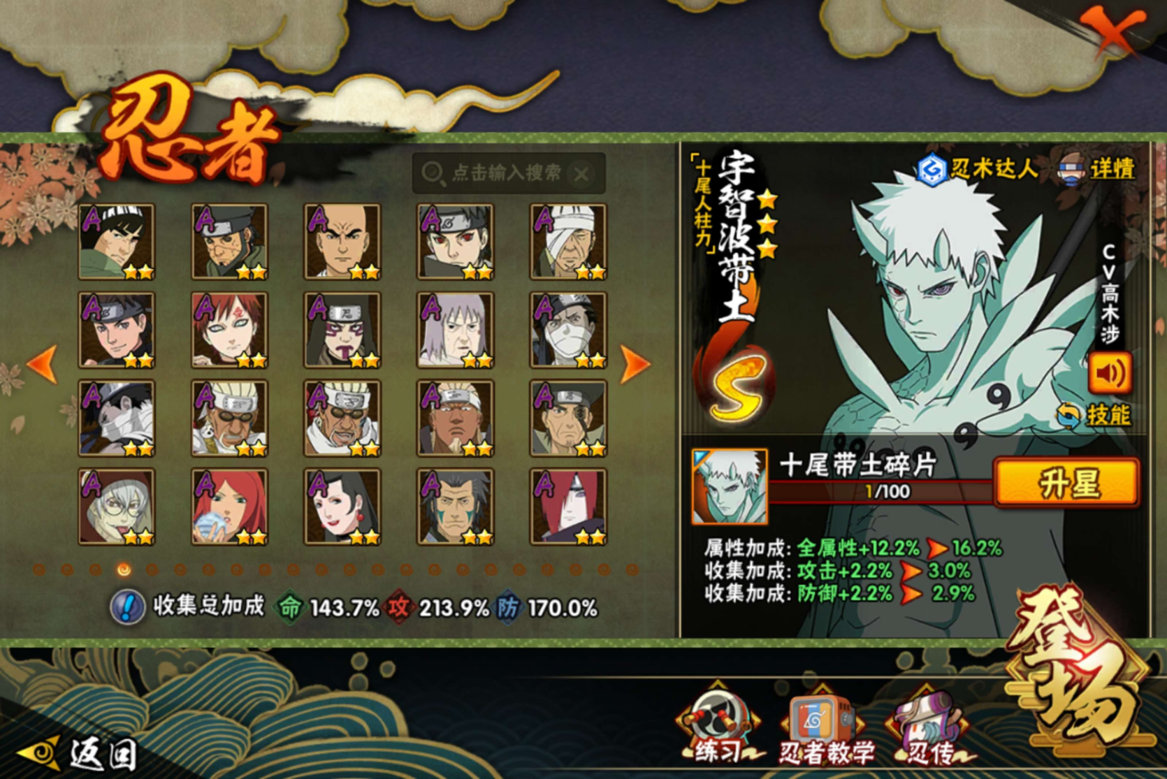 【S级忍者】宇智波带土「忍界大战」(3星),迈特凯「死门」(3星),旗木卡卡西「须佐能乎」(3星),自来也「传说中的三忍」(3星),宇智波斑「秽土转生·解」(3星),宇智波佐助「永恒万花筒」(3星),艾「忍界大战」(3星),春野樱「忍界大战」(3星),千手柱间「秽土转生」(3星),长门