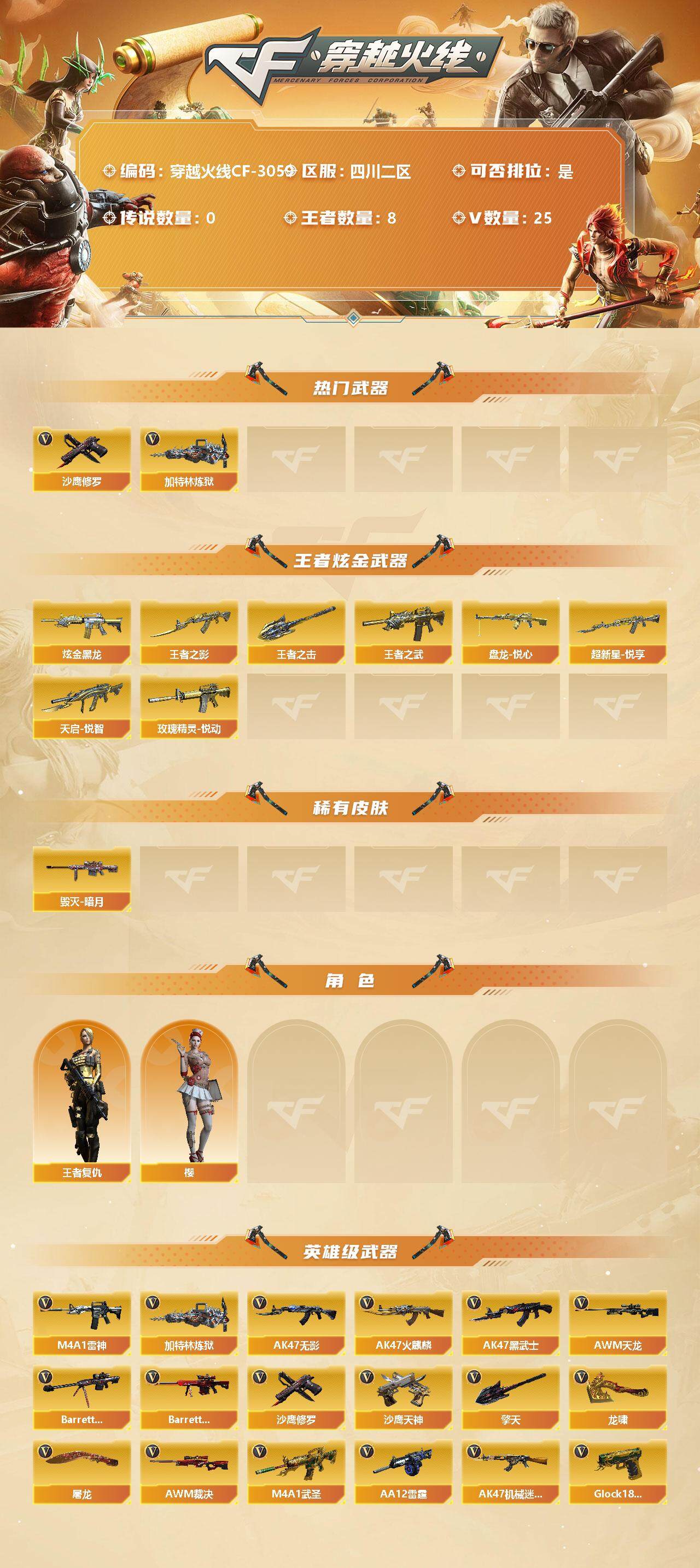 四川二区-25V-8王者-1炫金【热门武器】:加特林-炼狱*4,沙鹰-修罗*