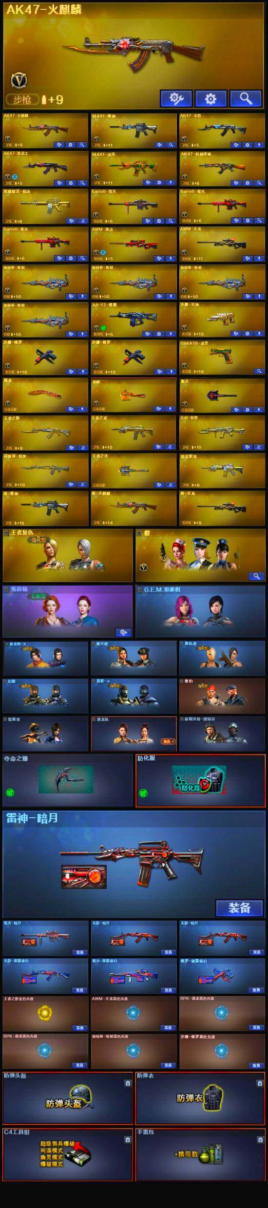 【英雄级武器】:AK47-火麒麟*2,M4A1-雷神,AK47-无影,AK47-黑武士,M4A1-武圣,AK47-机械迷城,AWM-天龙,Barrett-