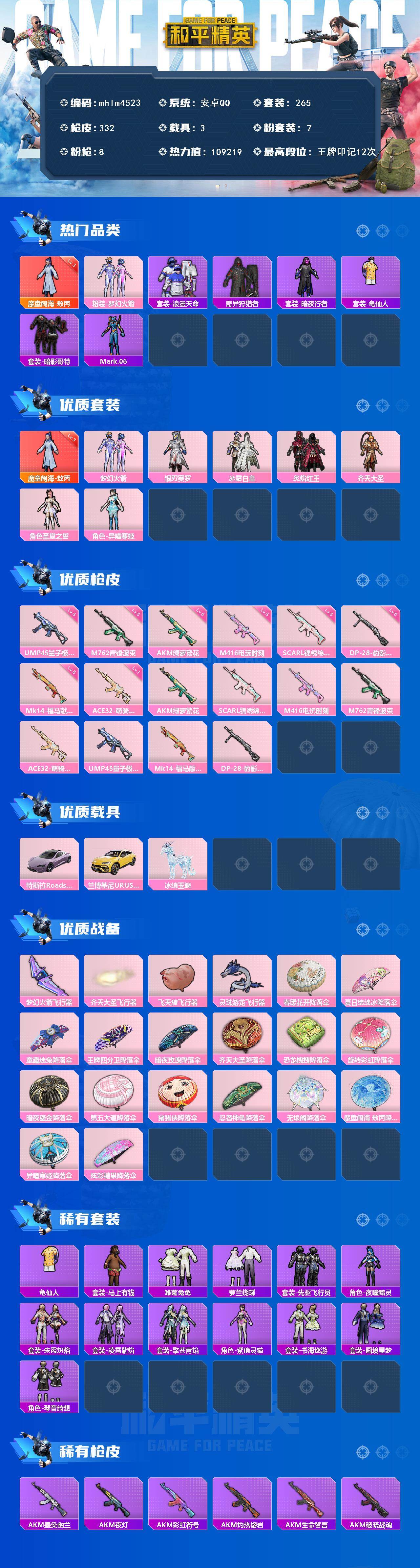 安卓 手Q-1神装-7粉装-8特效枪-3载具-5粉色飞行器-109219热力值-12王牌印记-265套装-332枪皮
