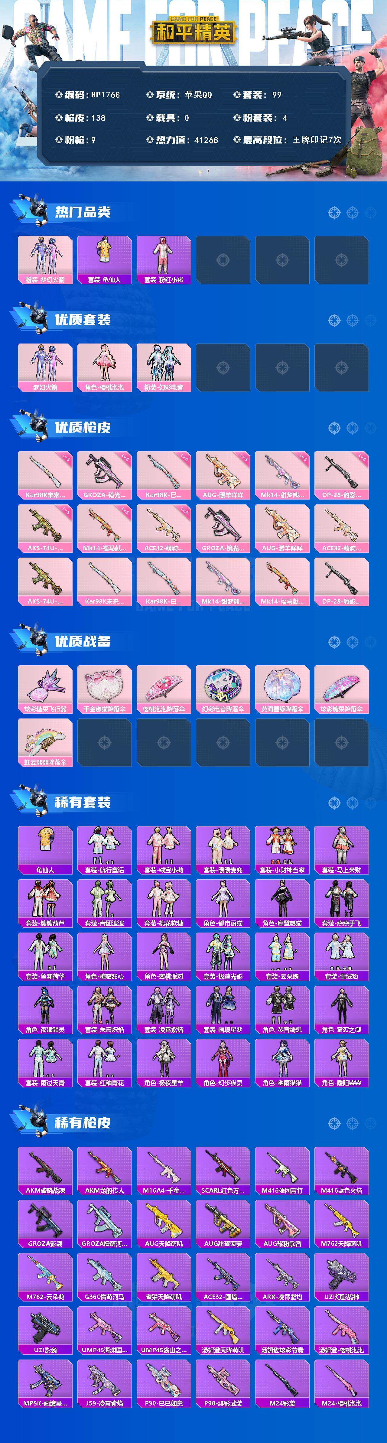 【HP1768】99套装/枪械9/装备140/战备91/王牌印记7/热力值41268/五级GROZA-镜光银凌/五级AUG-暖羊咩咩/五级ACE32-萌骑漫游/五级AKS-74U-森灵之息/五级Kar98K-未来歌姬/五级Kar98K-巳巳如意/五级Mk14-甜梦熊击/五级Mk14-福马献瑞/五级DP-28-豹影疾电/粉装-梦幻火箭/套装-龟仙人/套装-粉红小猪/角色-樱桃泡泡/粉装-幻彩电音/GROZA-镜光银凌/AUG-暖羊咩咩/ACE32-萌骑漫游/AKS-74U-森灵之息/Kar98K-