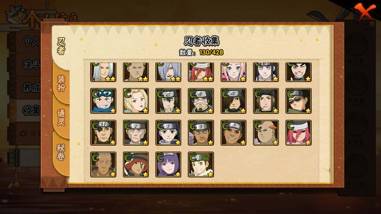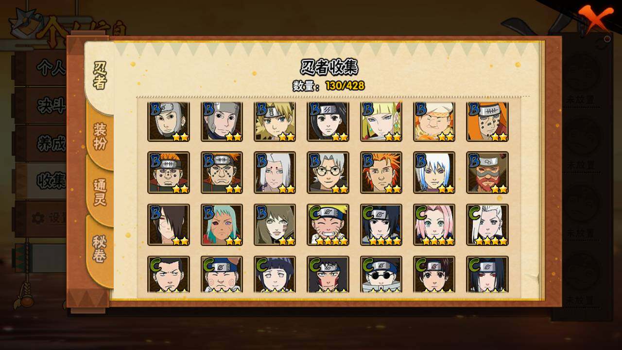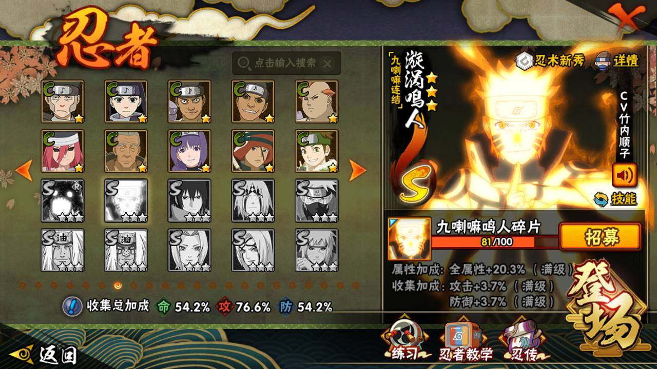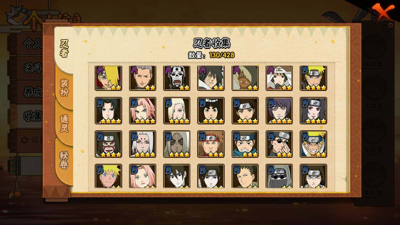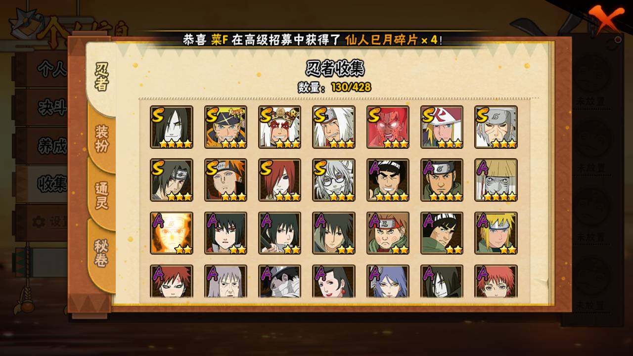 【S级忍者】:长门「秽土转生」(3星),千手扉间「秽土转生」(3星),宇智波鼬「须佐能乎」(3星),自来也「舞之豪杰」(3星),大蛇丸(4星),自来也「传说中的三忍」(3星),波风水门(3星),药师兜「仙人模式」(3星),迈特凯「死门」(3星),佩恩「天道」(3星),漩涡鸣人·宇智波佐助(3星)
