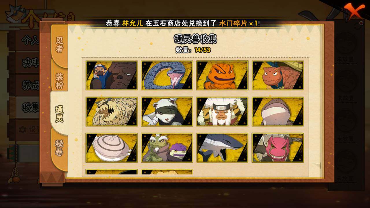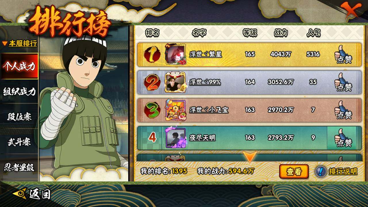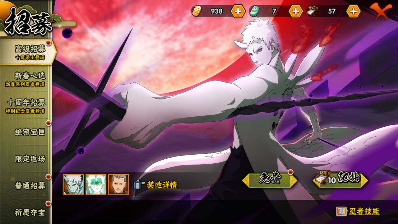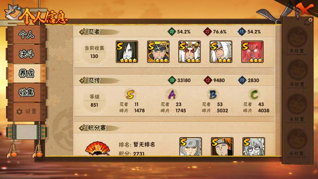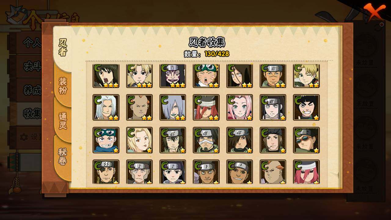 【S级忍者】:长门「秽土转生」(3星),千手扉间「秽土转生」(3星),宇智波鼬「须佐能乎」(3星),自来也「舞之豪杰」(3星),大蛇丸(4星),自来也「传说中的三忍」(3星),波风水门(3星),药师兜「仙人模式」(3星),迈特凯「死门」(3星),佩恩「天道」(3星),漩涡鸣人·宇智波佐助(3星)