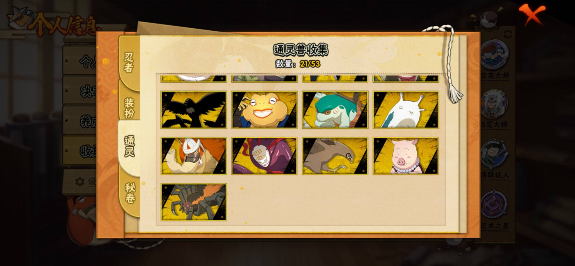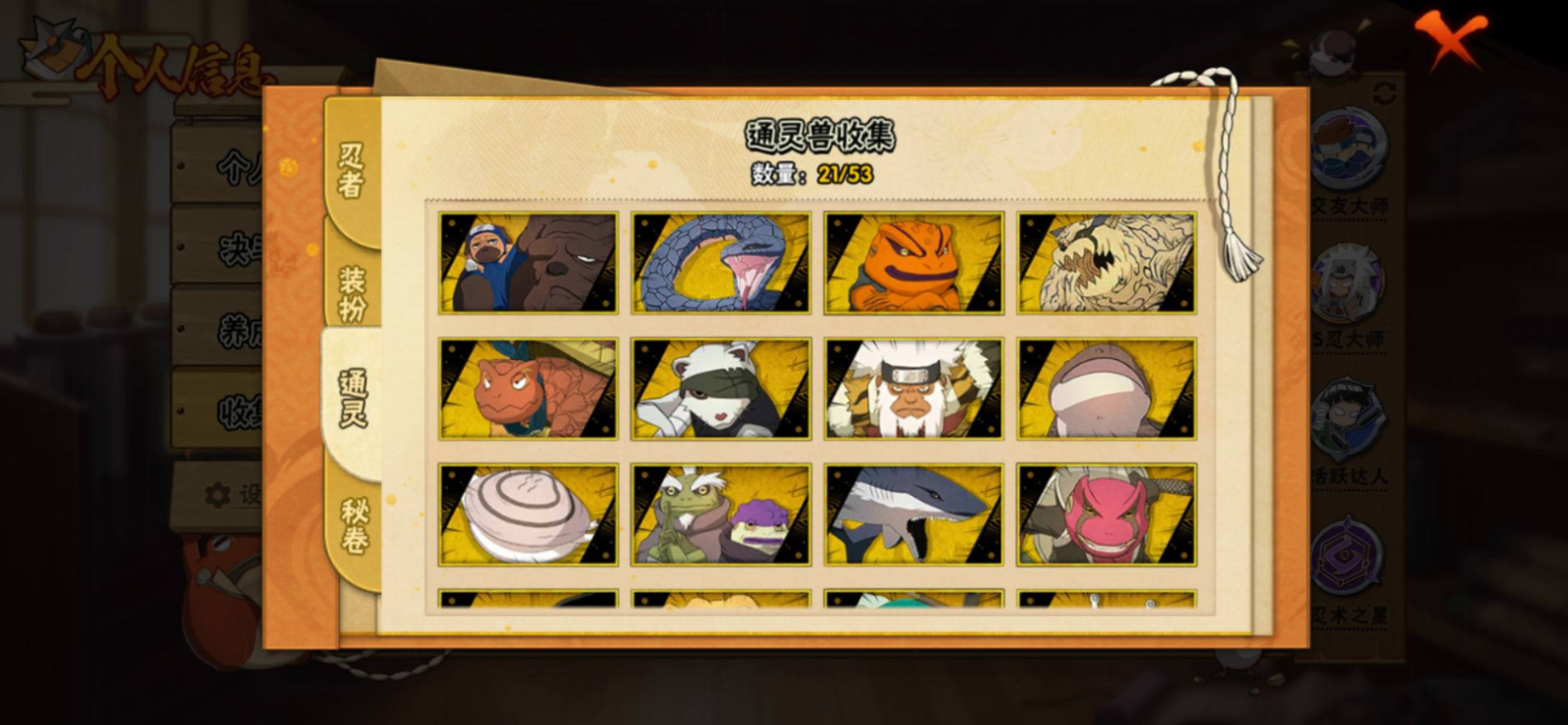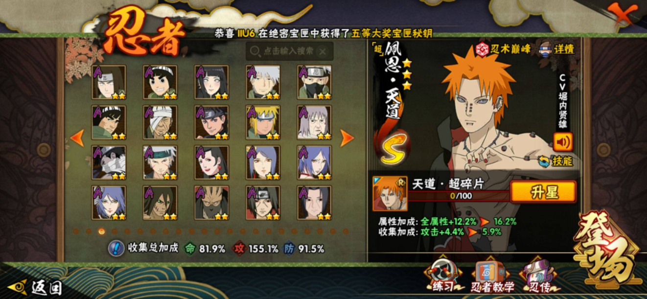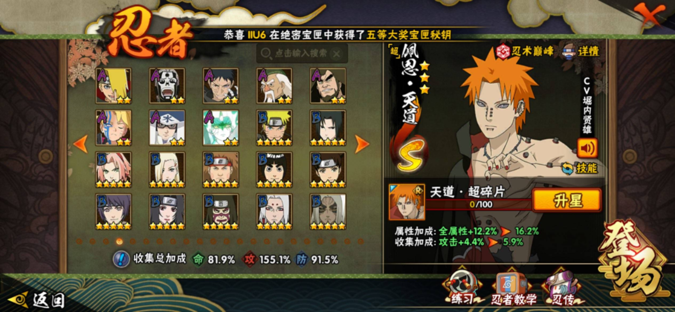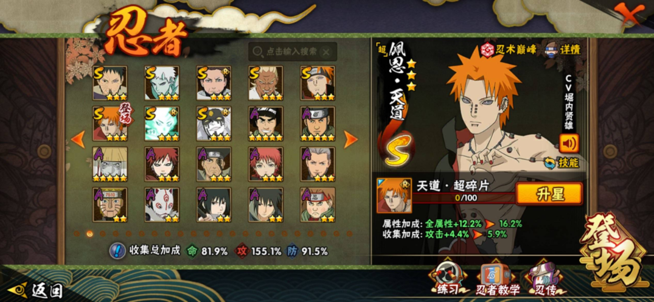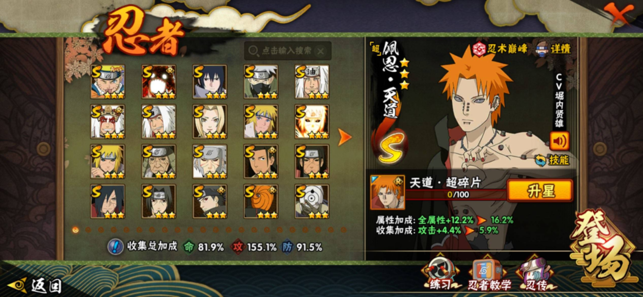 【S级忍者】宇智波带土「忍界大战」(3星),旗木卡卡西「须佐能乎」(3星),自来也「传说中的三忍」(3星),大筒木舍人「最终章」(3星),漩涡鸣人「暴怒·第六尾」(3星),烈斗「初代目风影」(3星),宇智波斑「秽土转生·解」(3星),宇智波佐助「永恒万花筒」(3星),大筒木桃式(3星),艾「