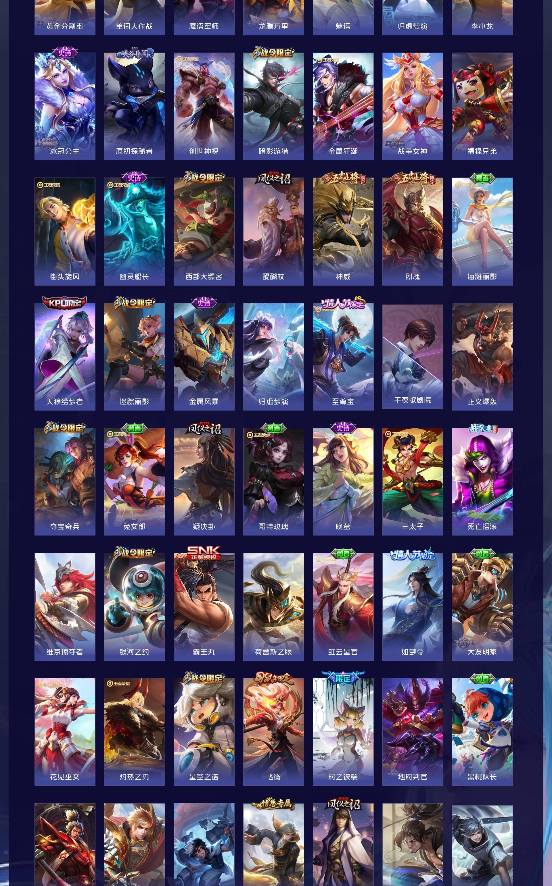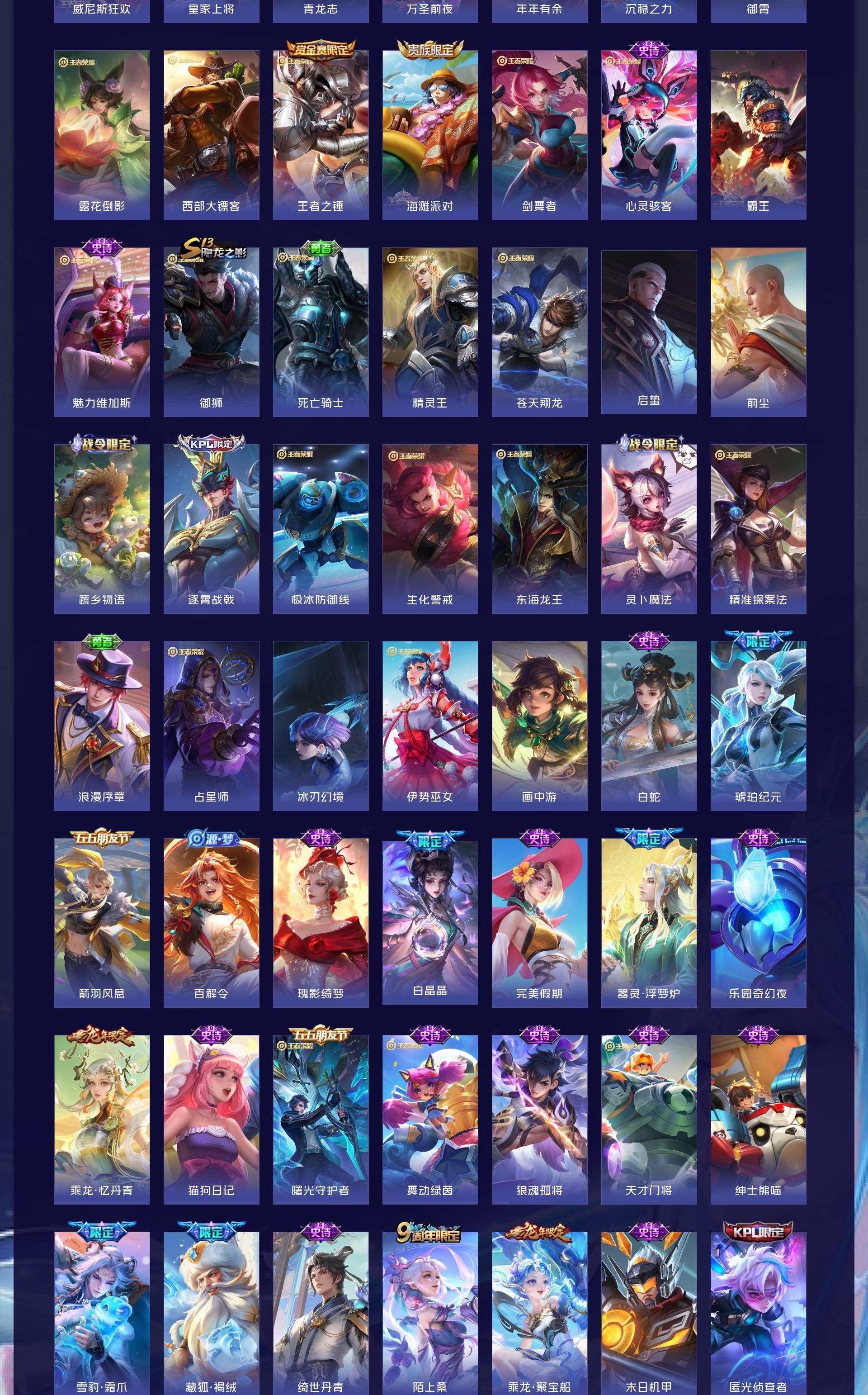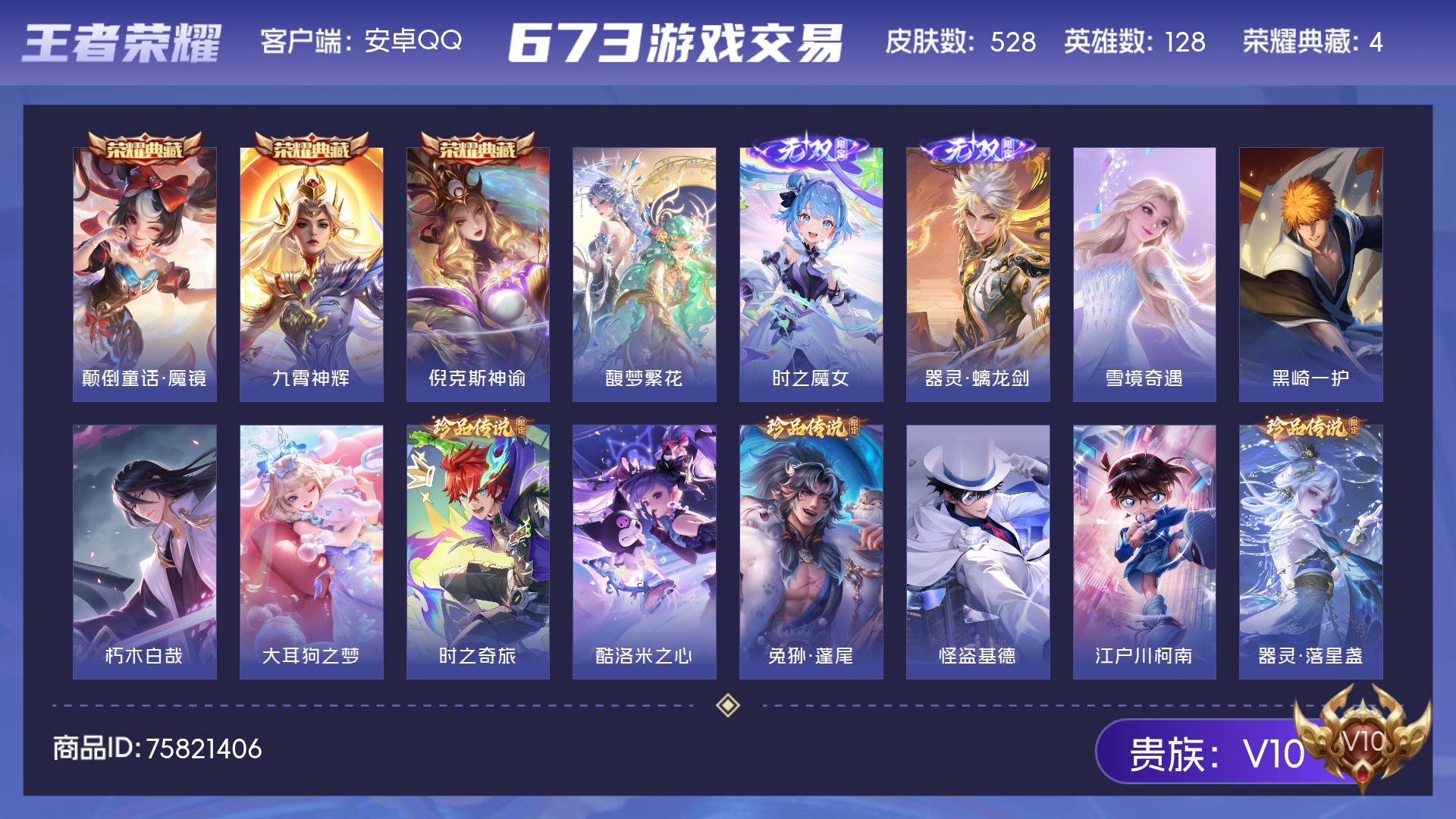 V10 皮肤528 英雄128 绝世王者 荣耀典藏4 珍品无双1 无双皮肤3 珍品传说9 传说59 其他皮肤460