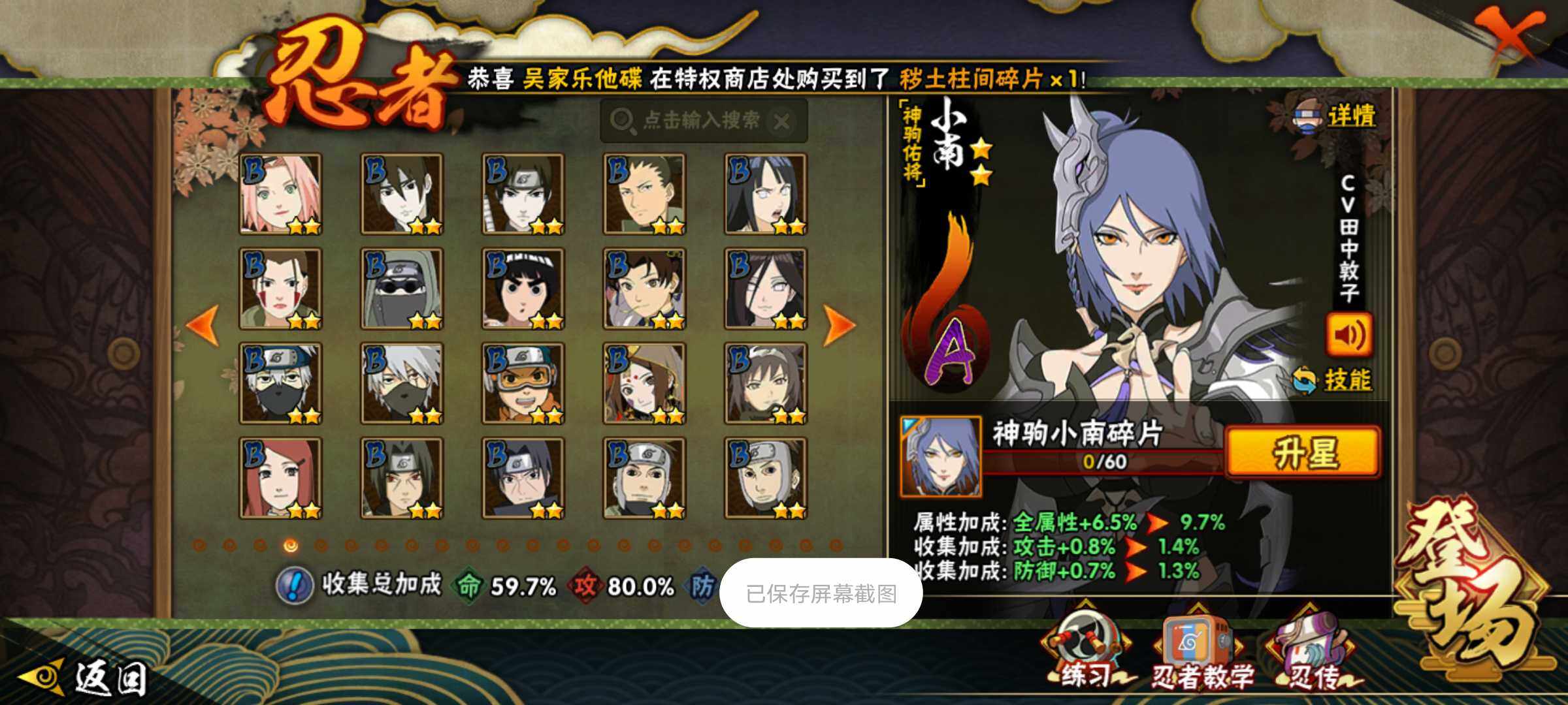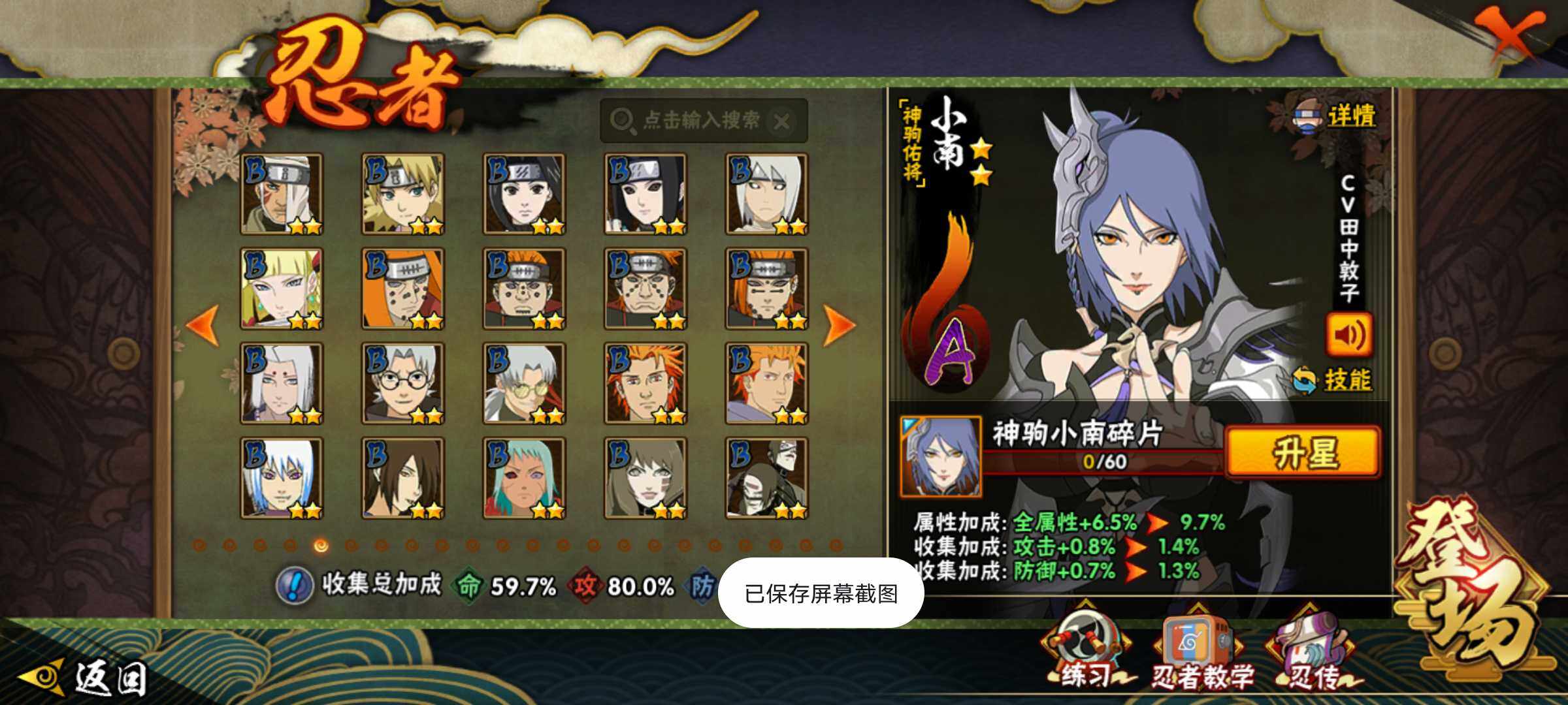 【S级忍者】:宇智波斑「秽土转生·解」(3星),艾「忍界大战」(3星),宇智波鼬「须佐能乎」(3星),旗木卡卡西「须佐能乎」(3星),自来也「舞之豪杰」(3星),自来也「传说中的三忍」(3星),波风水门(3星),佩恩「天道」(3星),波风水门「九喇嘛连结」(3星),漩涡鸣人·宇智波佐助(3星)