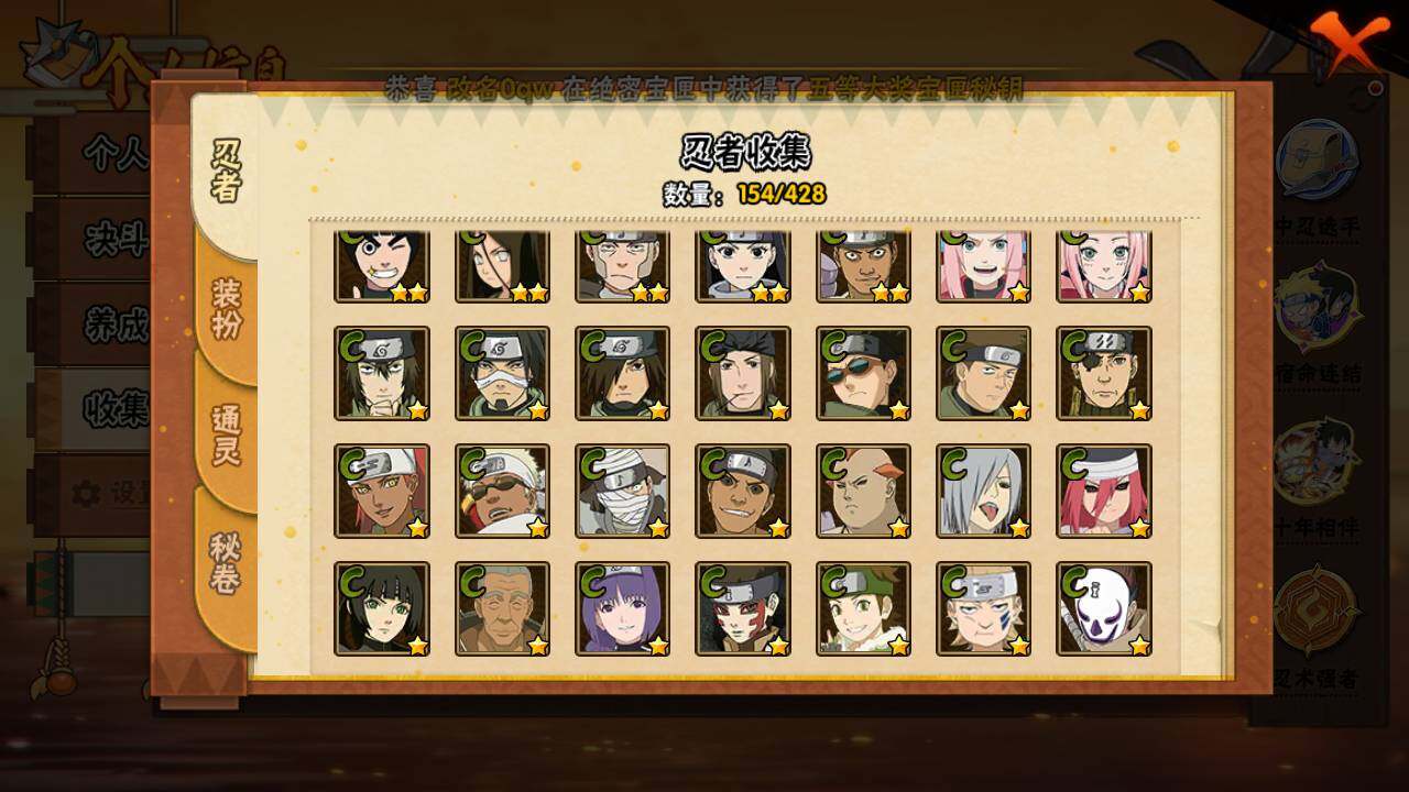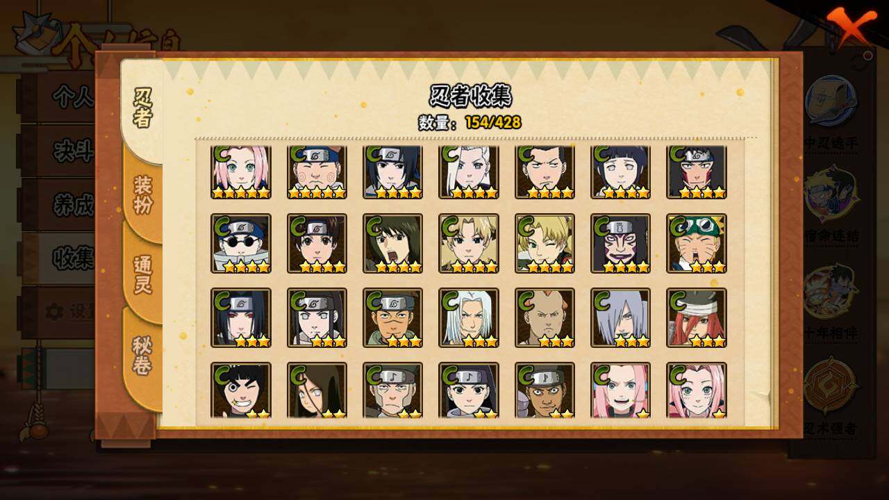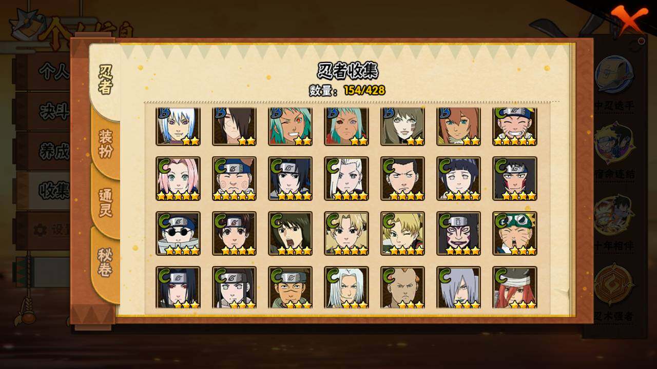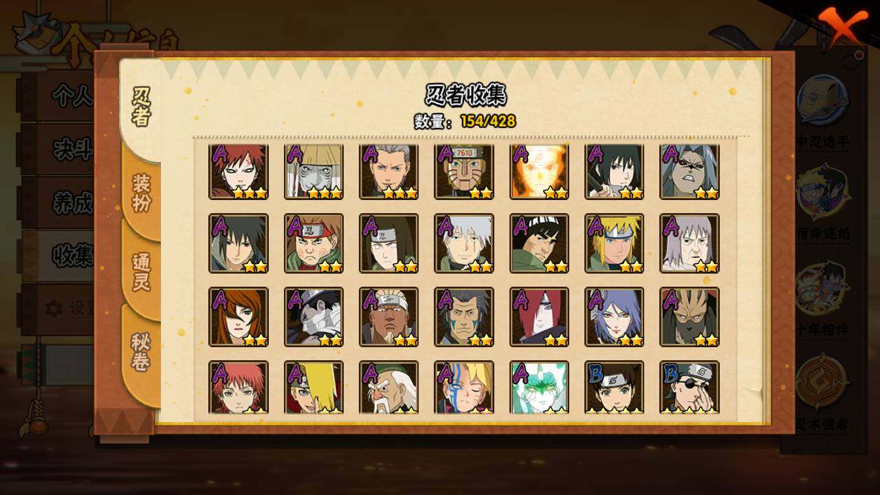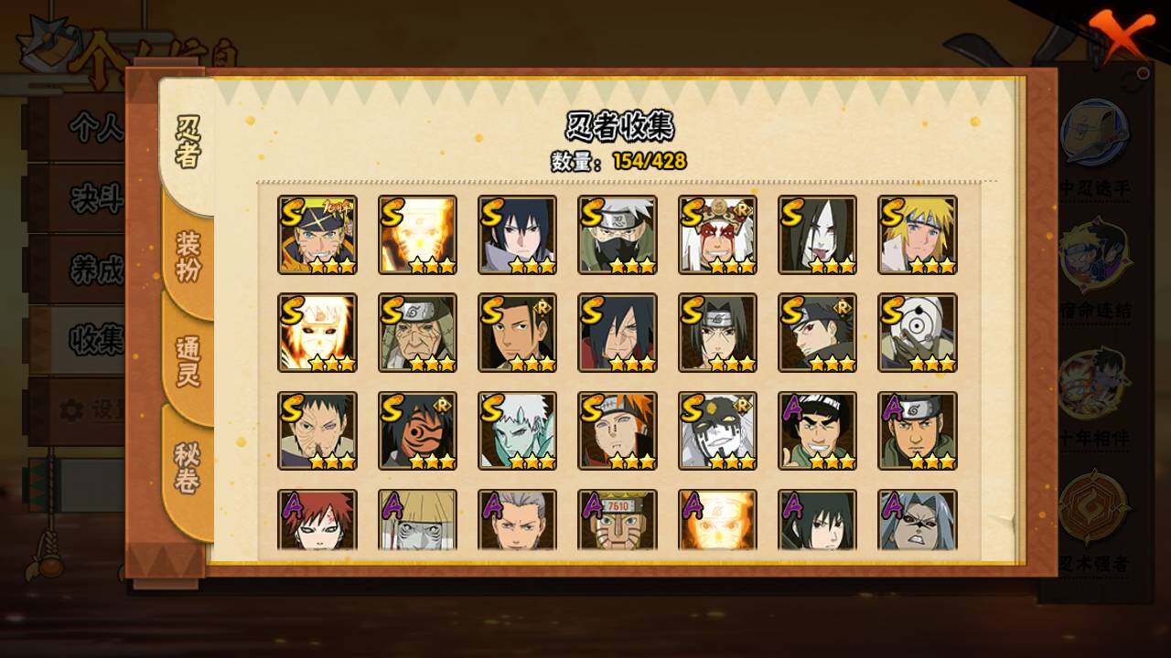 【S级忍者】:猿飞日斩「秽土转生」(3星),宇智波斑「秽土转生·解」(3星),宇智波带土「忍界大战」(3星),宇智波鼬「须佐能乎」(3星),宇智波止水「须佐能乎」(3星),旗木卡卡西「须佐能乎」(3星),千手柱间「木叶创立」(3星),自来也「舞之豪杰」(3星),大蛇丸(3星),波风水门(3星),神秘面具男「红夜之刃」(3星),漩涡鸣人「九喇嘛连结