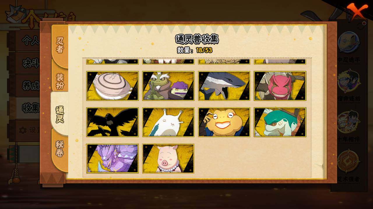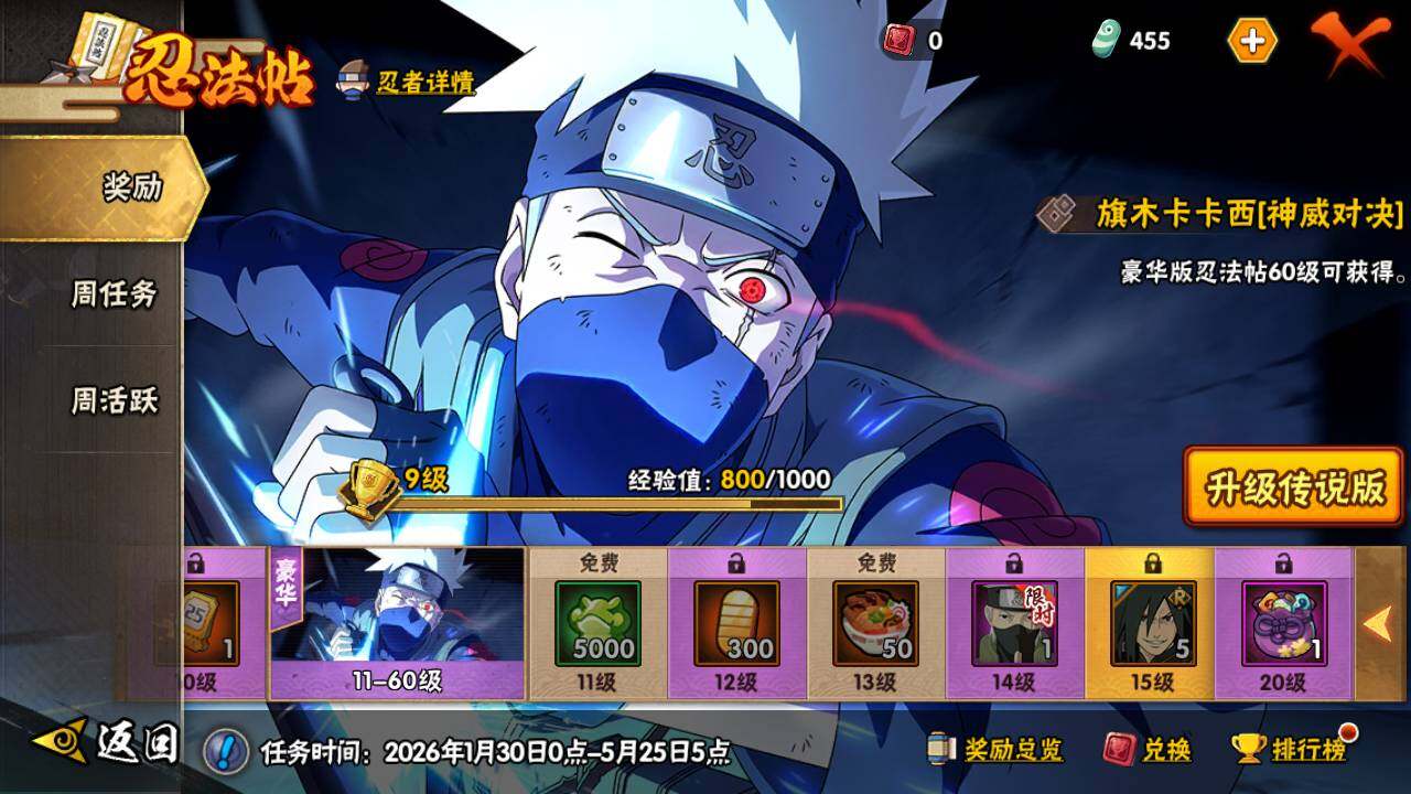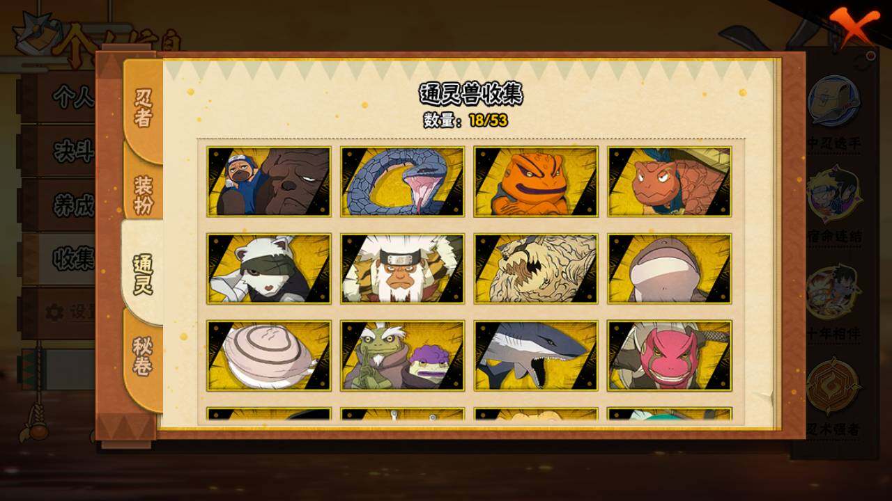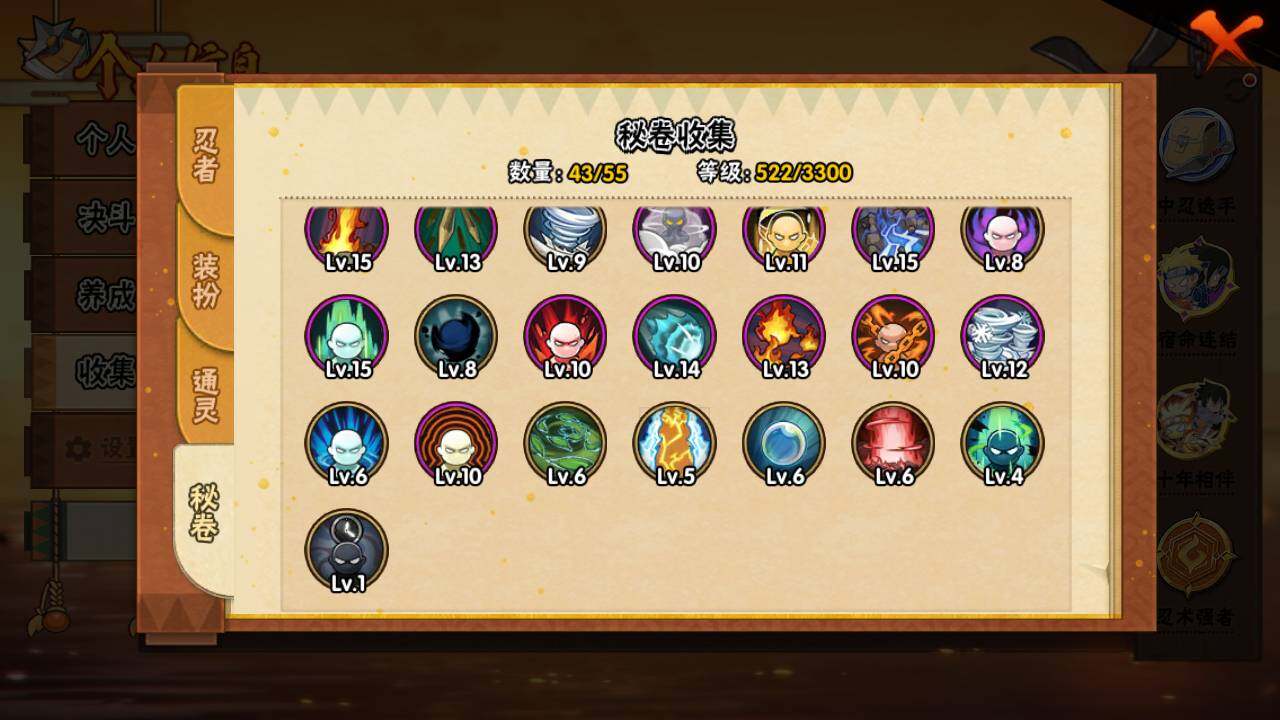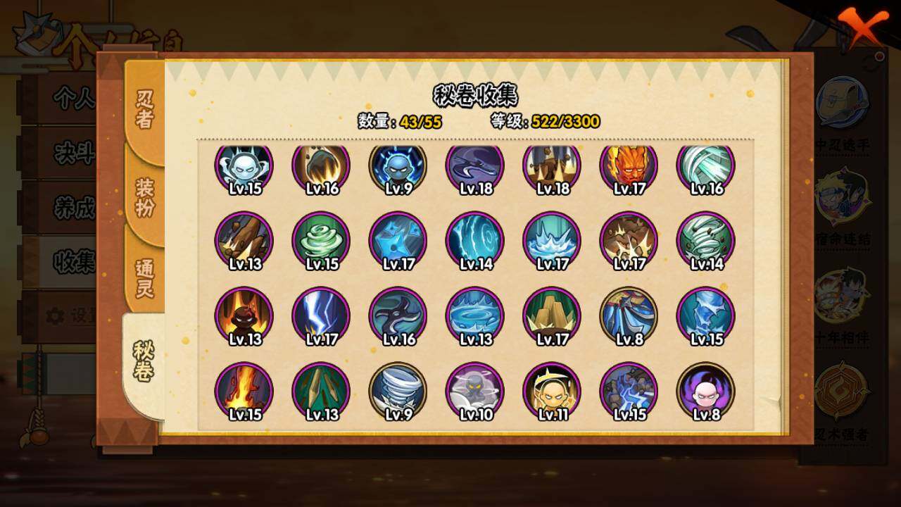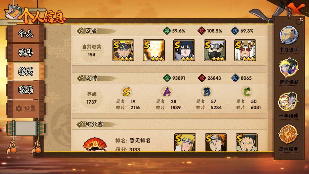 【S级忍者】:猿飞日斩「秽土转生」(3星),宇智波斑「秽土转生·解」(3星),宇智波带土「忍界大战」(3星),宇智波鼬「须佐能乎」(3星),宇智波止水「须佐能乎」(3星),旗木卡卡西「须佐能乎」(3星),千手柱间「木叶创立」(3星),自来也「舞之豪杰」(3星),大蛇丸(3星),波风水门(3星),神秘面具男「红夜之刃」(3星),漩涡鸣人「九喇嘛连结