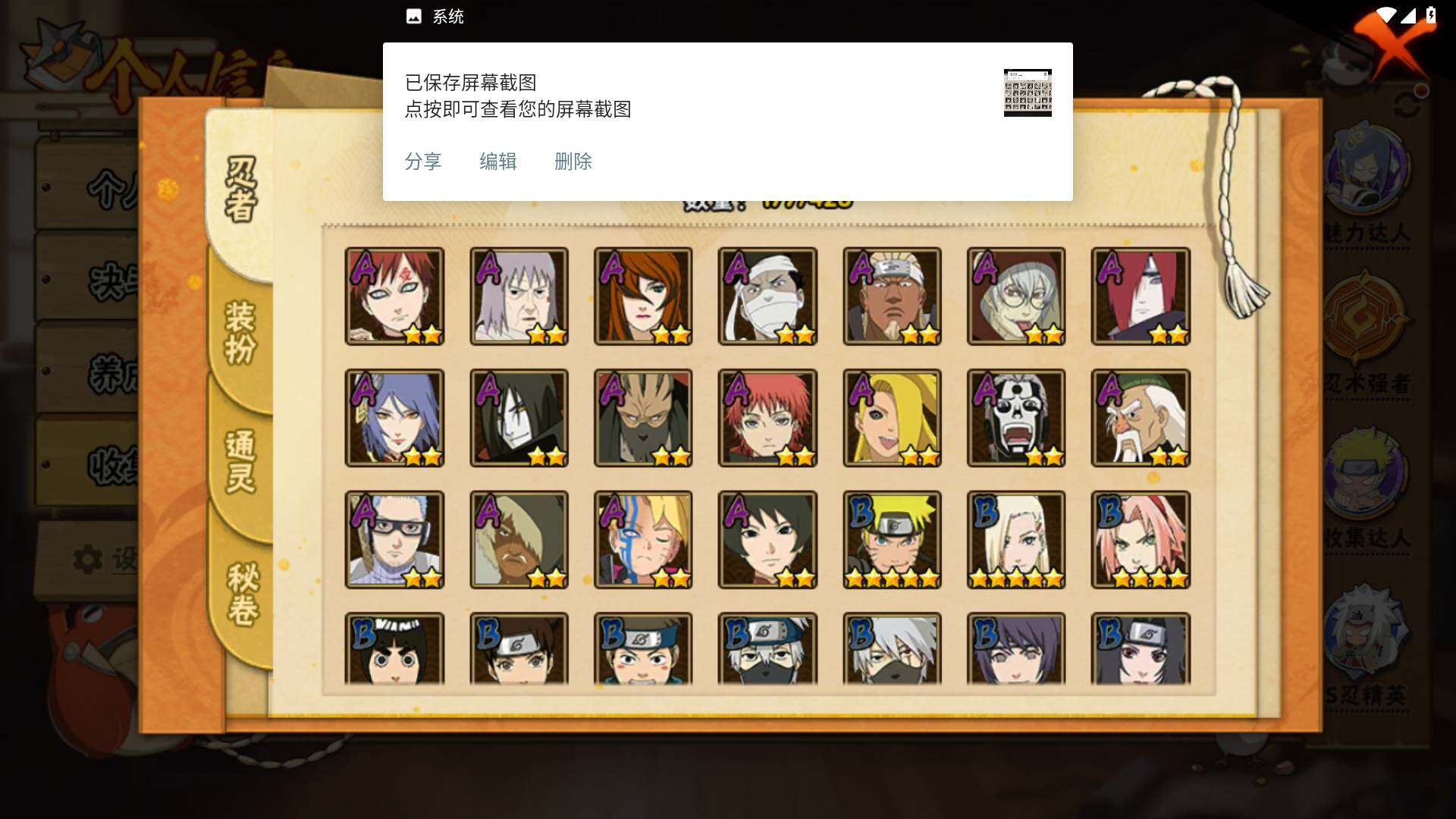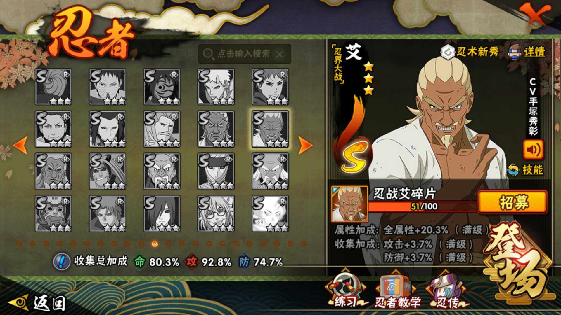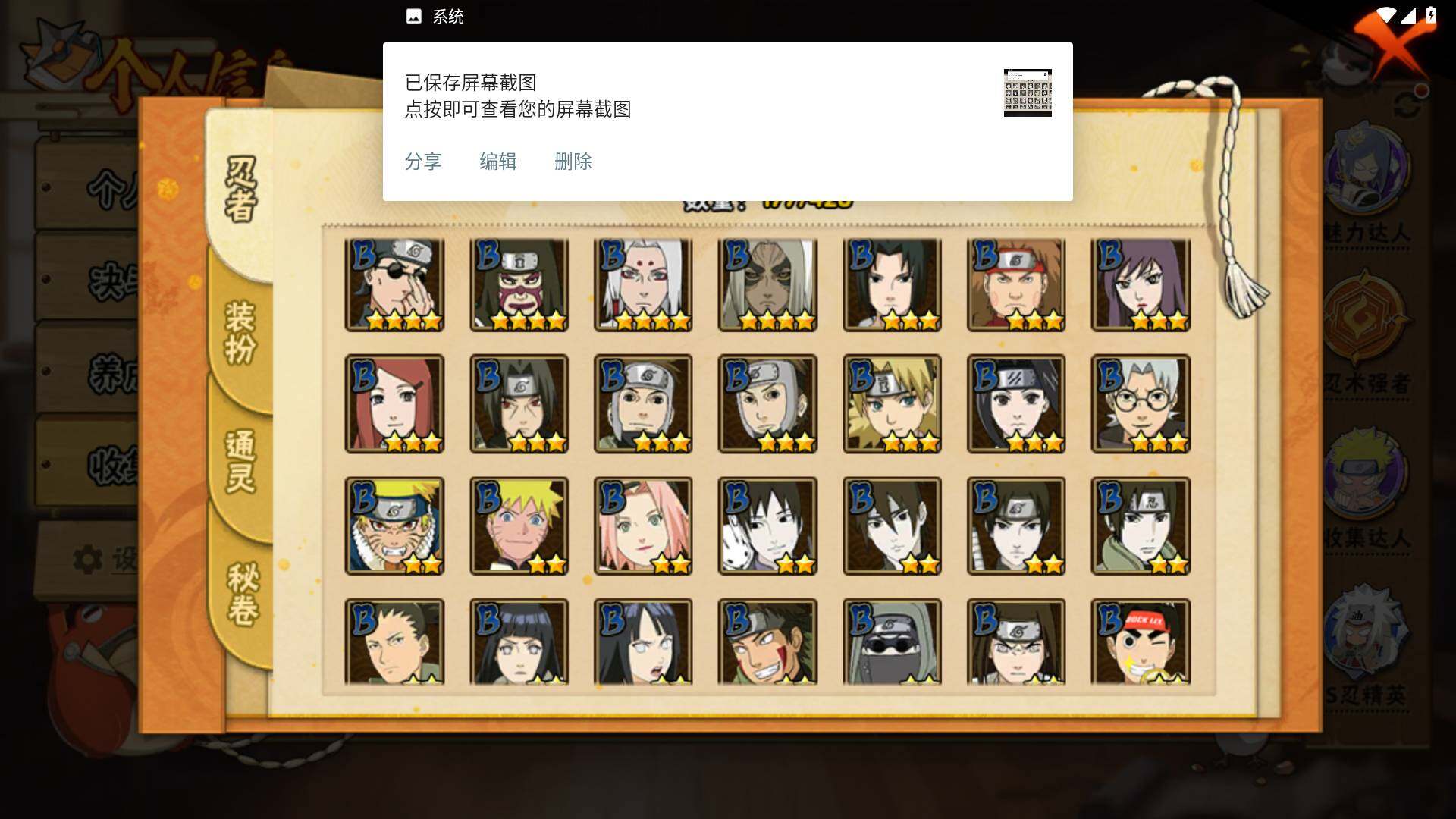 【S级忍者】:波风水门「秽土转生」(3星),千手扉间「秽土转生」(3星),宇智波鼬「秽土转生」(3星),宇智波斑「秽土转生·解」(3星),宇智波鼬「须佐能乎」(3星),自来也「舞之豪杰」(3星),大蛇丸(3星),纲手「百豪」(3星),波风水门(3星),佩恩「天道」(3星),宇智波佐助「永恒万花筒」(3星),漩涡鸣人·宇智