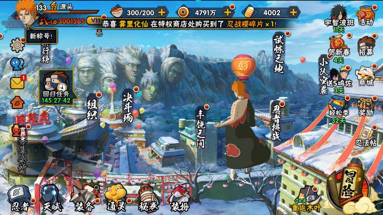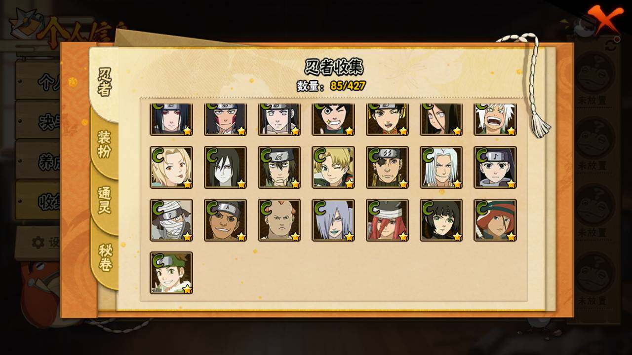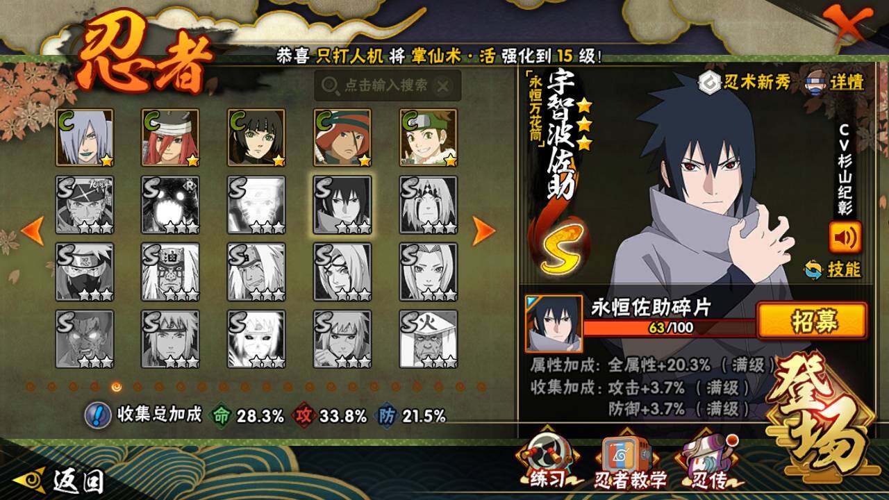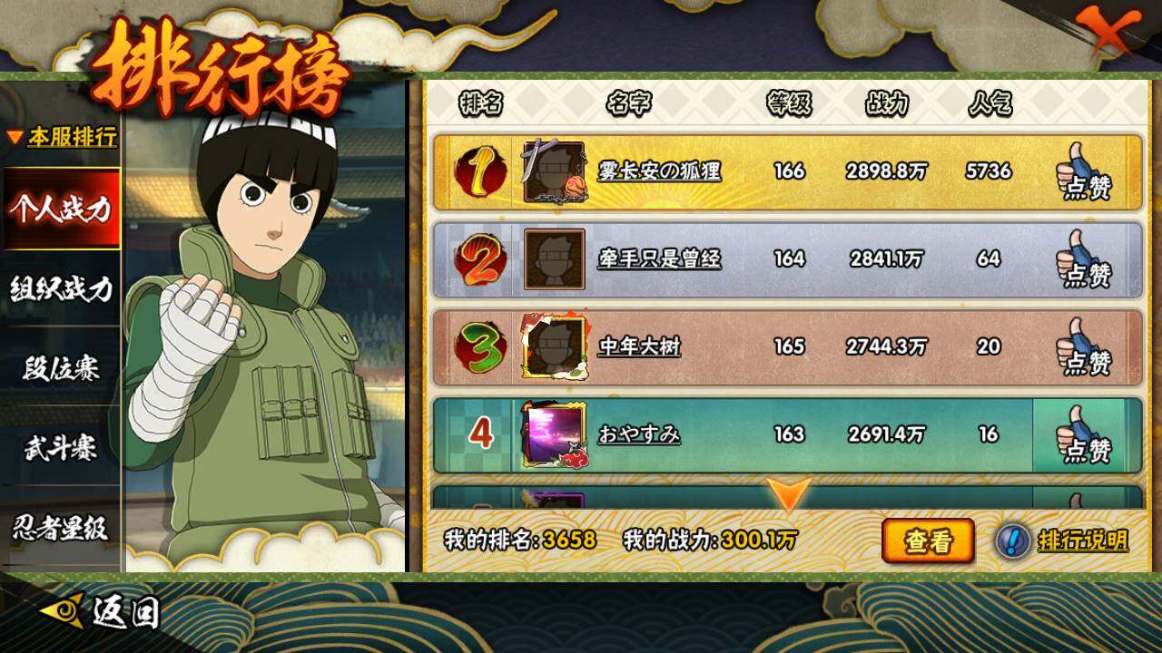 【S级忍者】:自来也(3星),自来也「舞之豪杰」(3星),大蛇丸(3星),佩恩·天道「超」(3星)