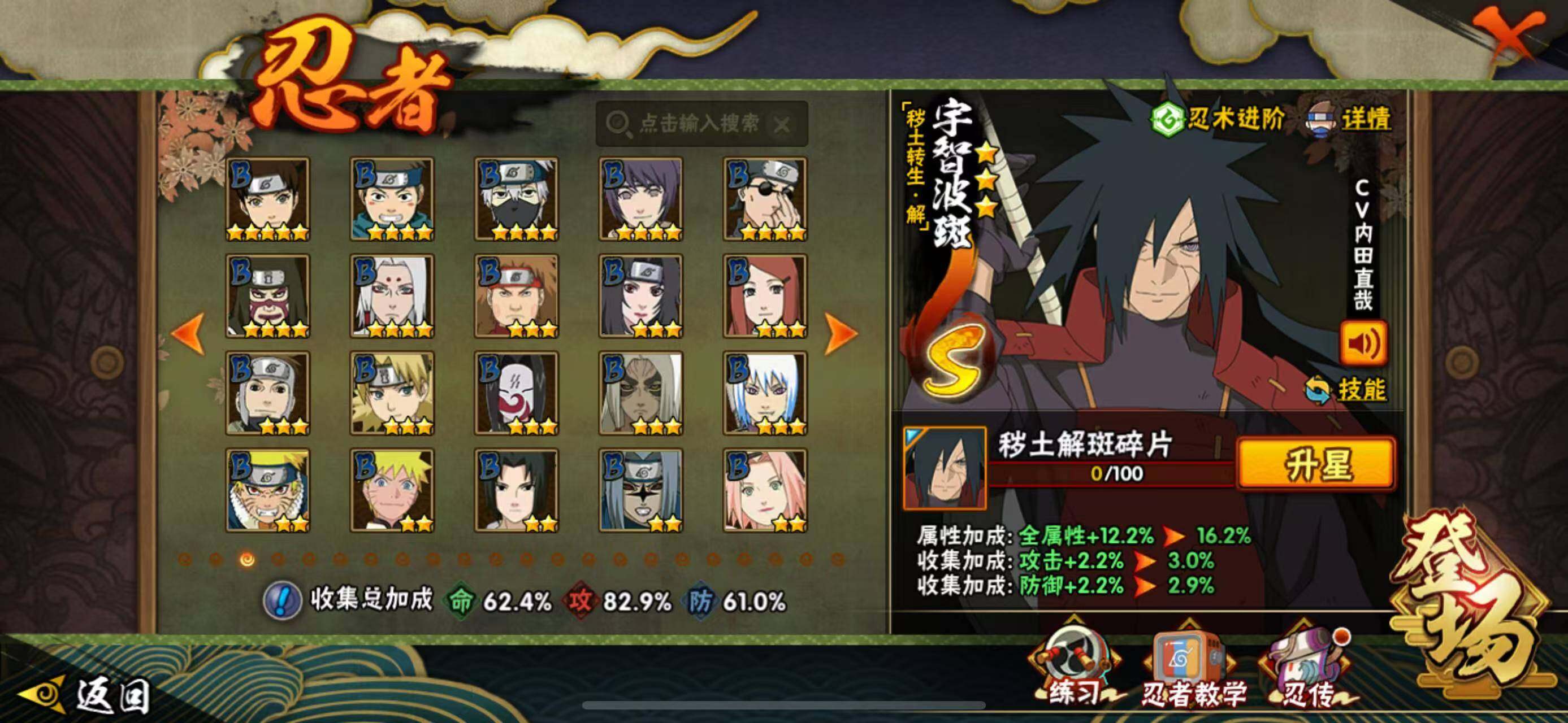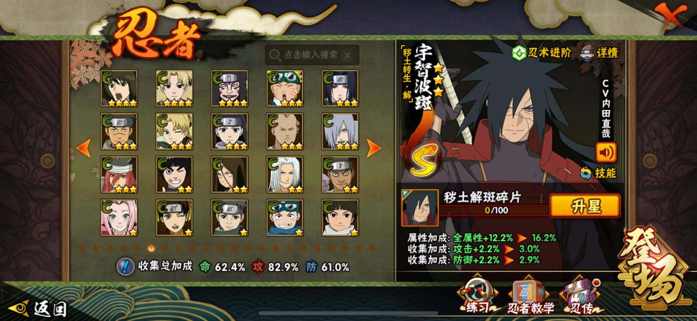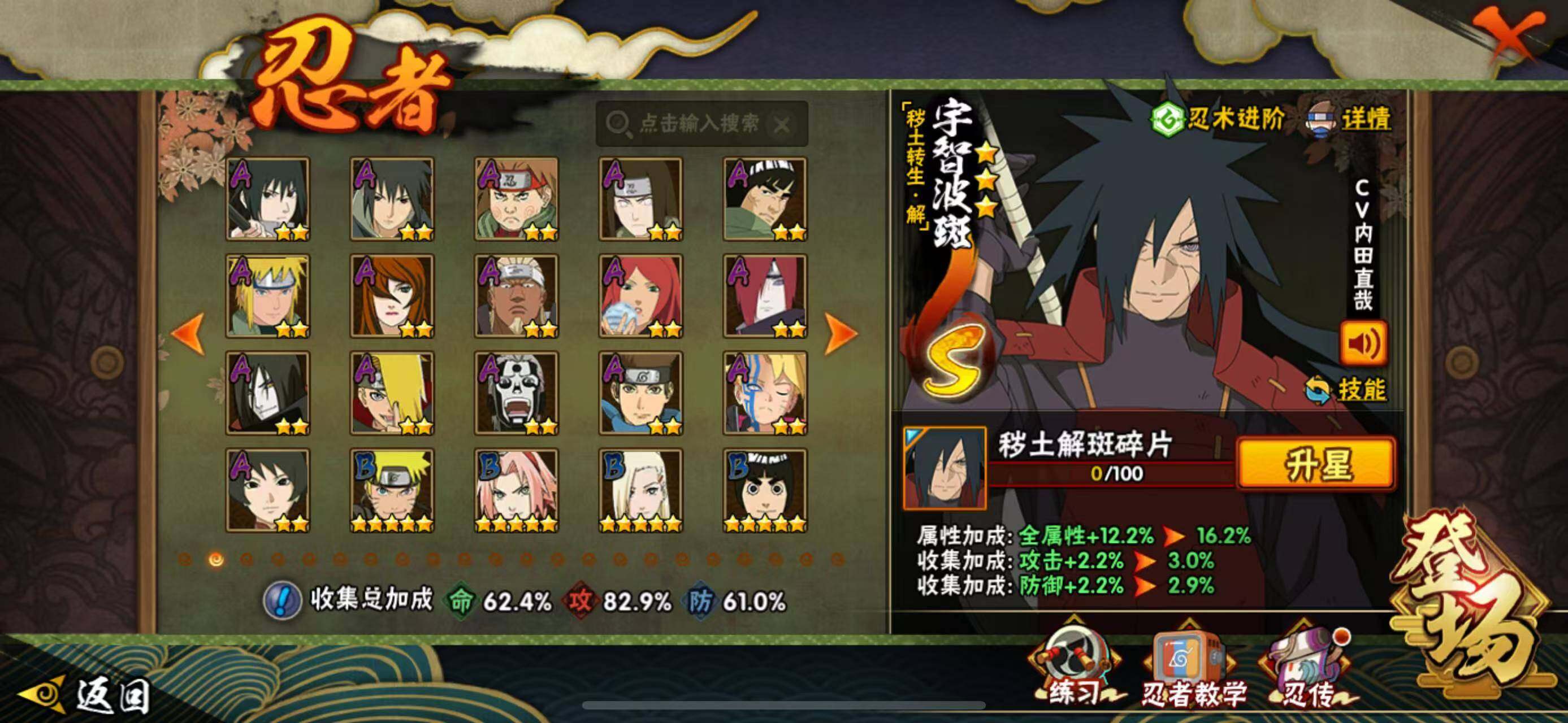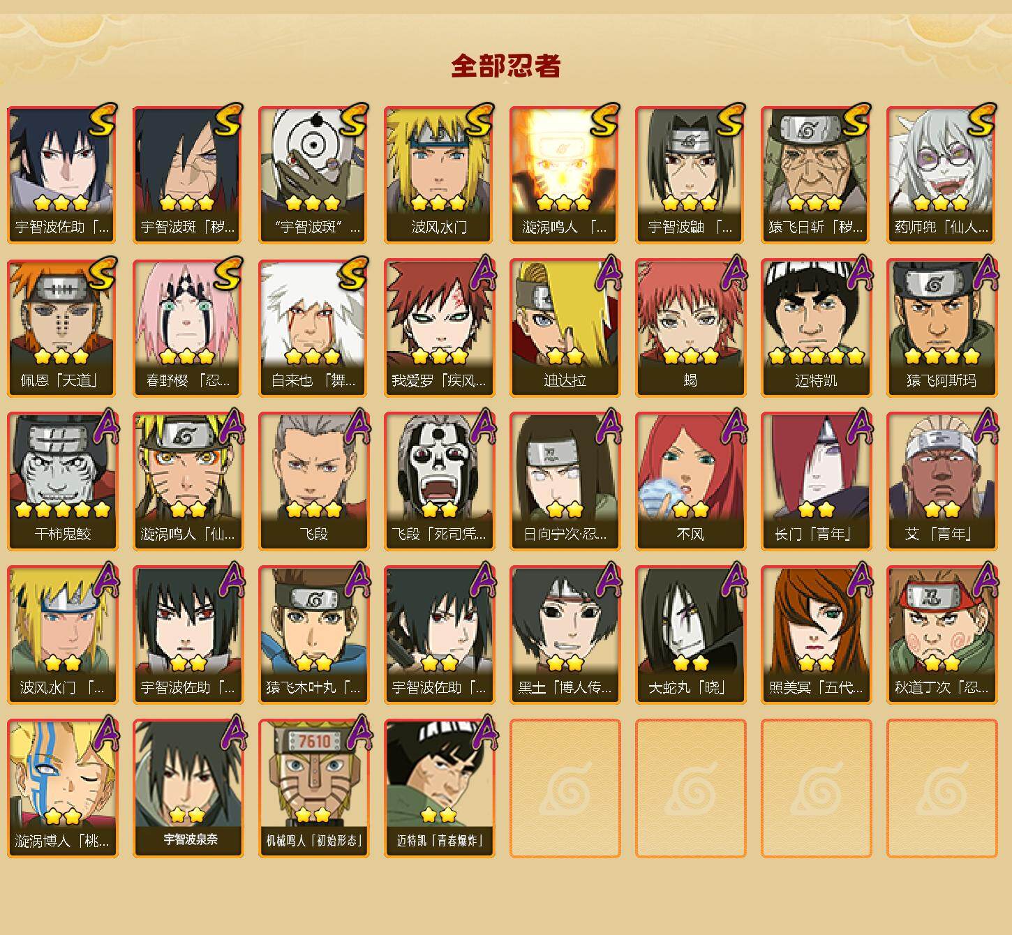 【S级忍者】:猿飞日斩「秽土转生」(3星),宇智波斑「秽土转生·解」(3星),春野樱「忍界大战」(3星),宇智波鼬「须佐能乎」(3星),自来也「舞之豪杰」(3星),波风水门(3星),药师兜「仙人模式」(3星),漩涡鸣人「九喇嘛连结」(3星),佩恩「天道」(3星),宇智波佐助「永恒万花筒」(3星),宇智波斑 「白面具」(3星宇智波斑「白面具」)