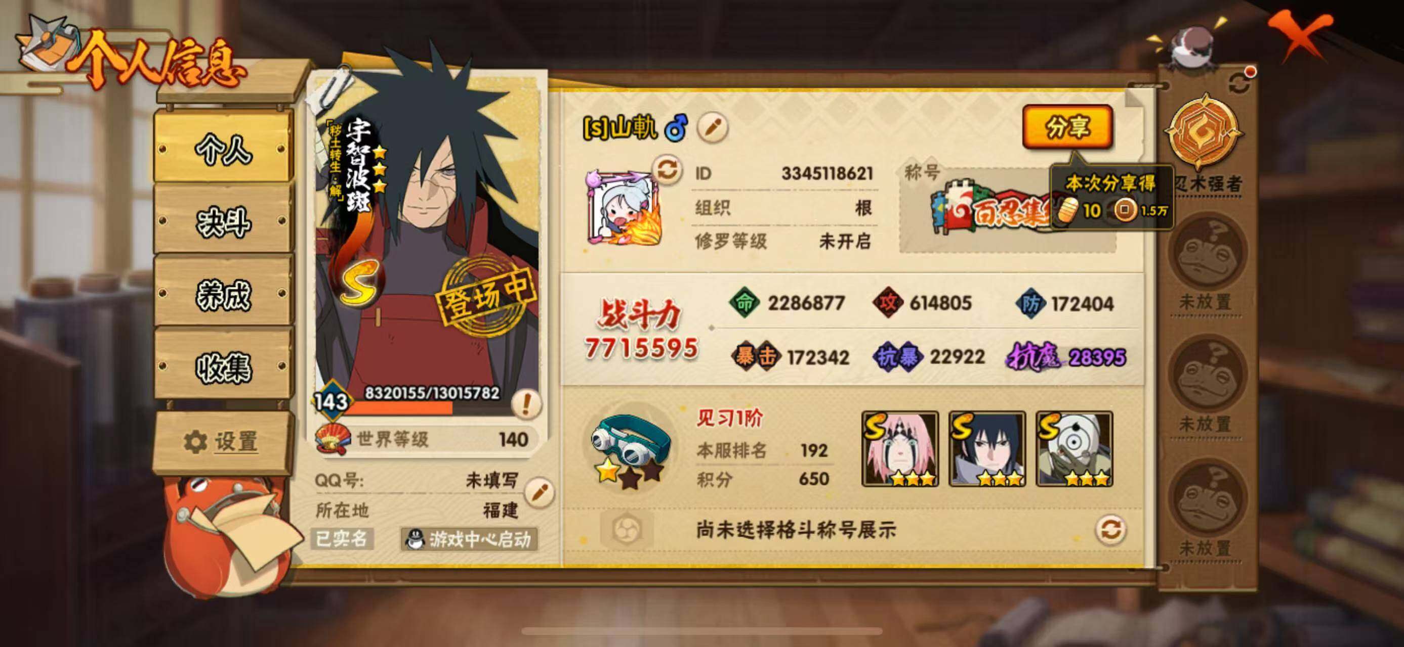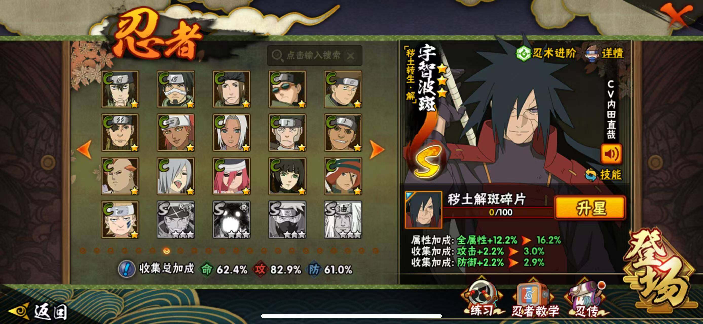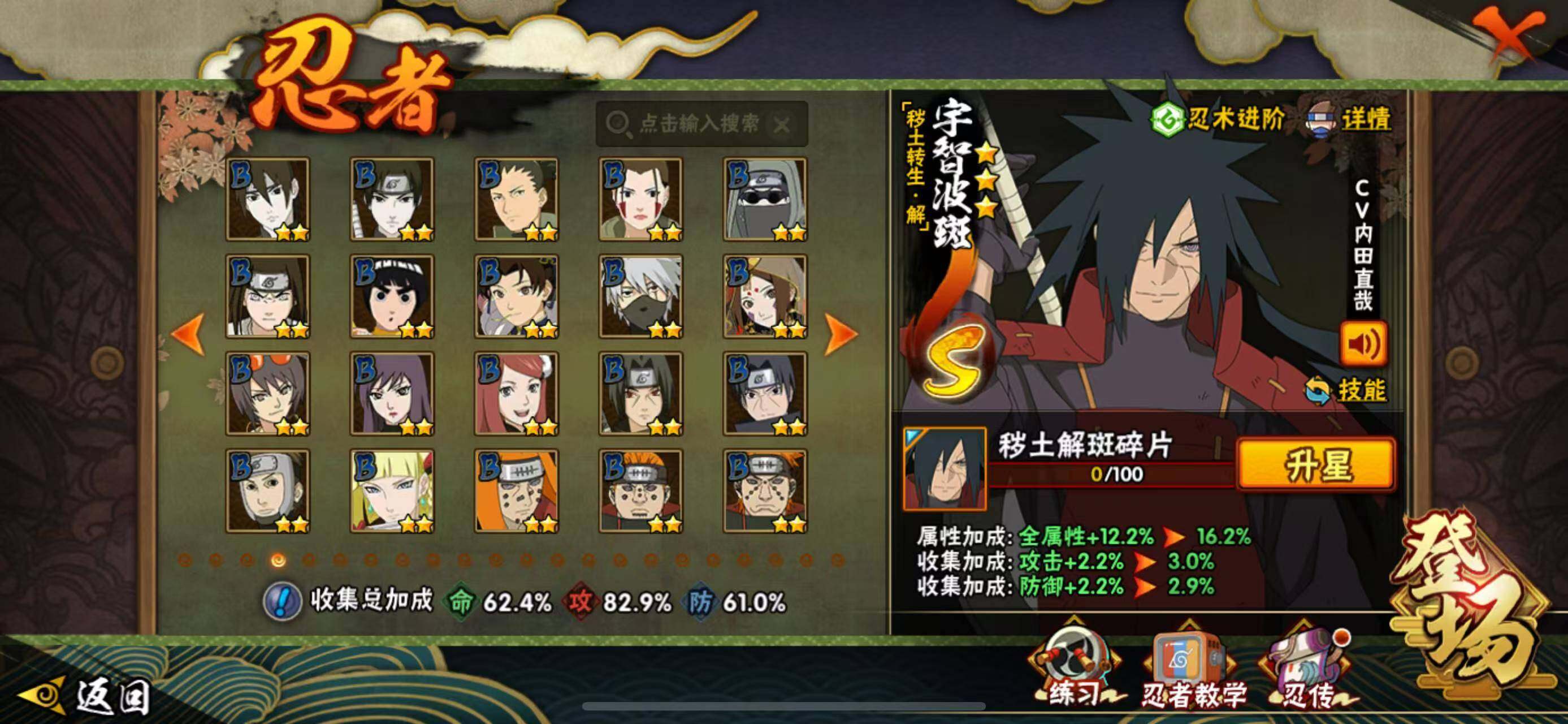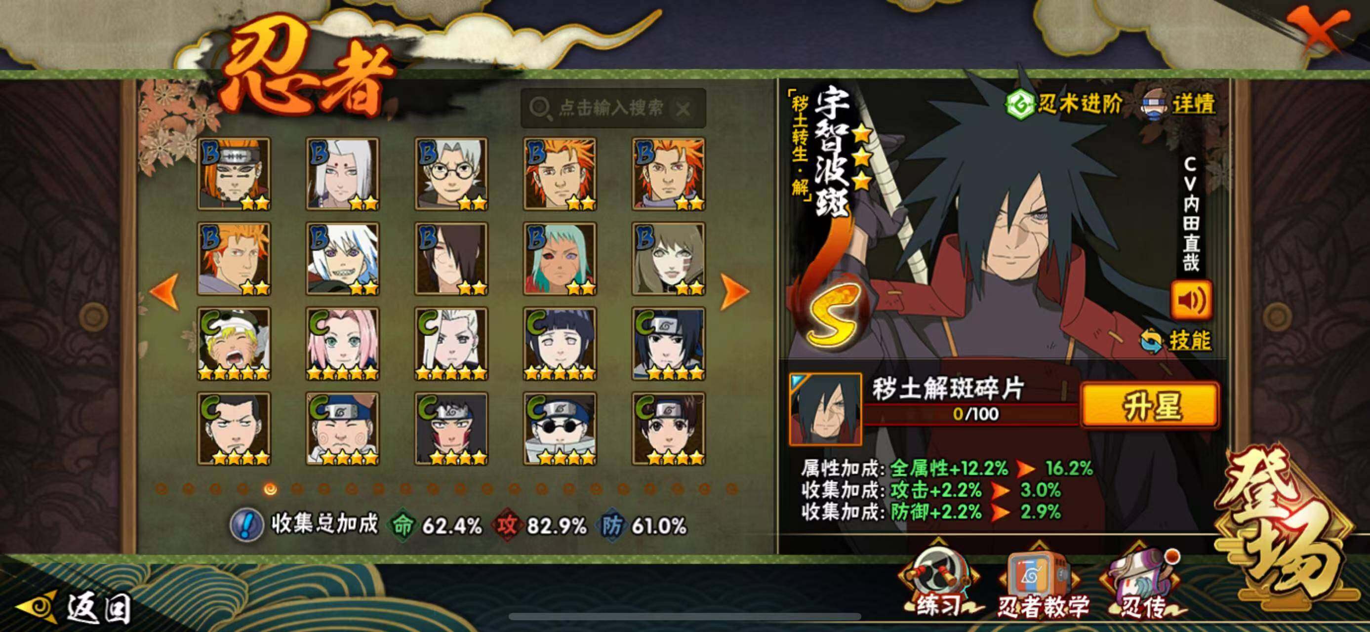 【S级忍者】:猿飞日斩「秽土转生」(3星),宇智波斑「秽土转生·解」(3星),春野樱「忍界大战」(3星),宇智波鼬「须佐能乎」(3星),自来也「舞之豪杰」(3星),波风水门(3星),药师兜「仙人模式」(3星),漩涡鸣人「九喇嘛连结」(3星),佩恩「天道」(3星),宇智波佐助「永恒万花筒」(3星),宇智波斑 「白面具」(3星宇智波斑「白面具」)