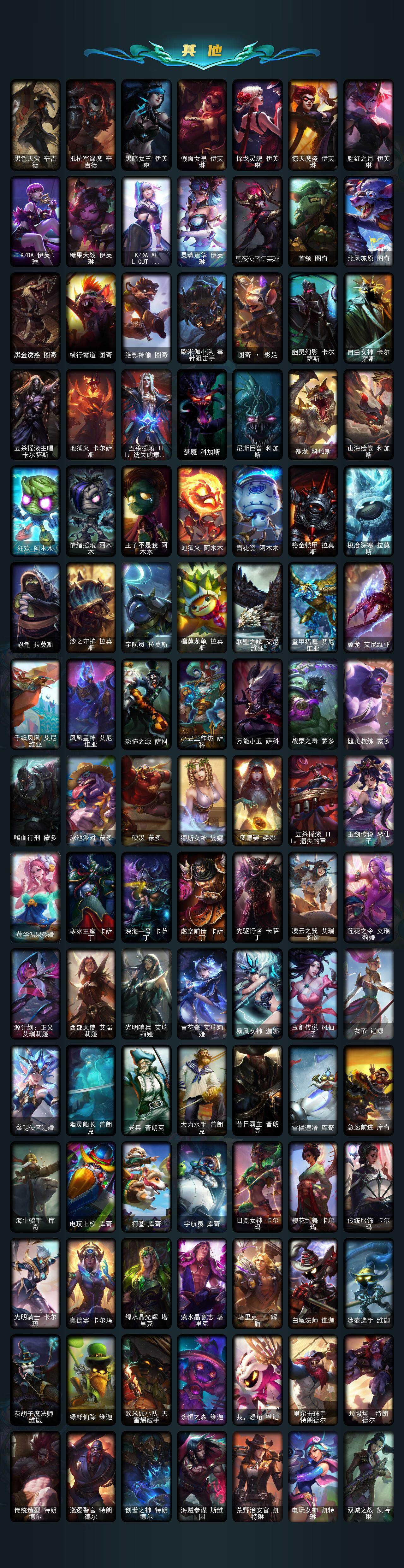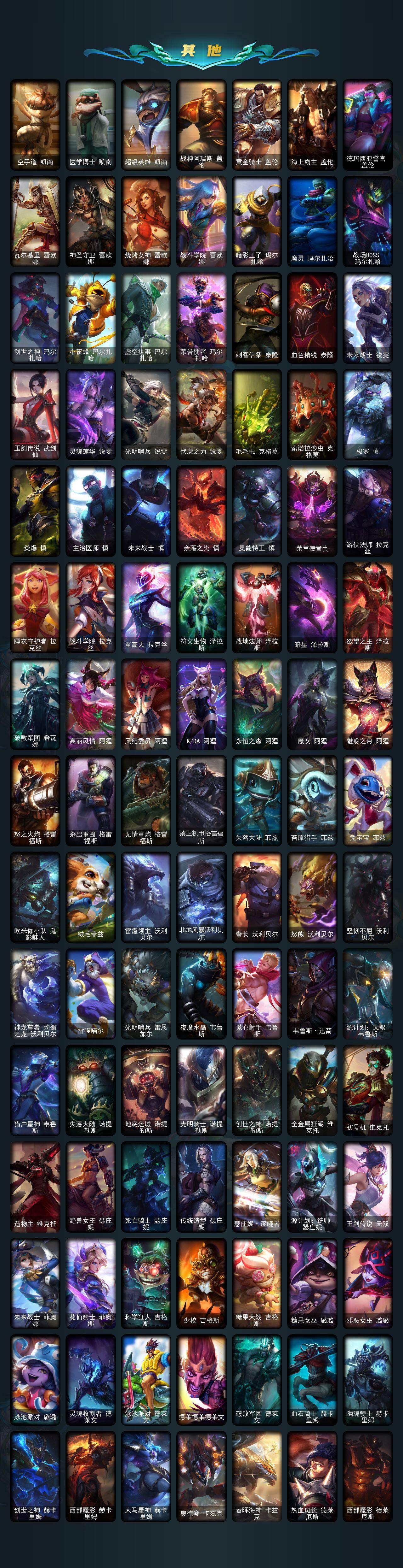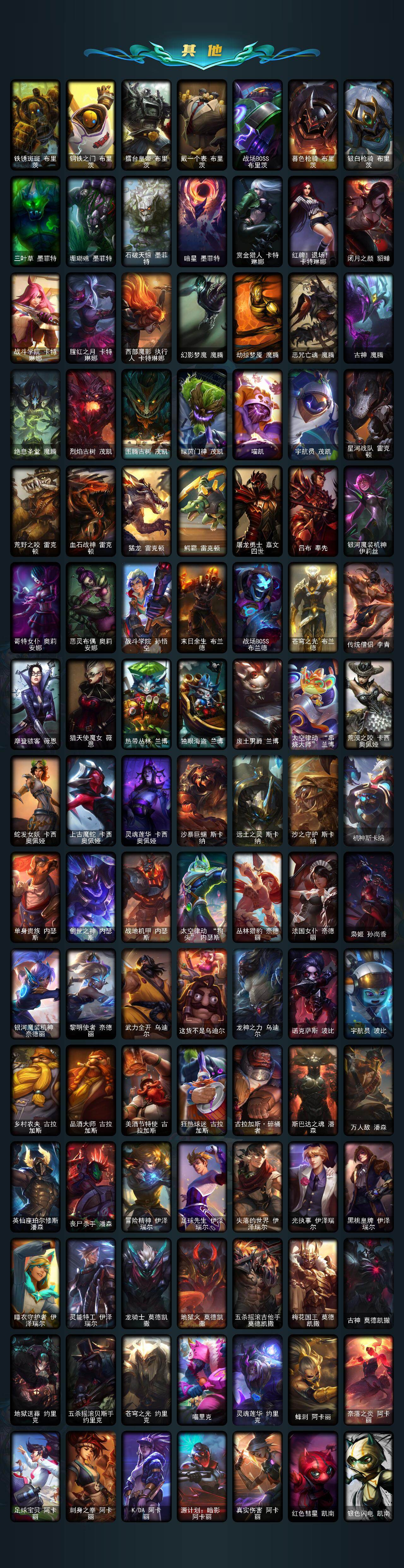 【神话皮肤】:十周年纪念安妮,源代码乐芙兰,殿堂传奇乐芙兰,十五周年纪念希维尔,暗星科加斯,神凰行者瑞羽圣凰艾尼维亚,殿堂传奇薇恩,超级音乐粉丝古拉加斯,灰烬征服者潘森,水晶圣骑蕾欧娜,水晶掠夺者卡兹克,海克斯科技阿木木,海克斯科技安妮,海克斯科技崔丝塔娜,海克斯科技嘉文四世,海克斯科技吉格斯,海克斯科技卡萨丁,海克斯科技拉莫斯,海克斯科技魔腾,海克斯科技瑟庄妮,海克斯科