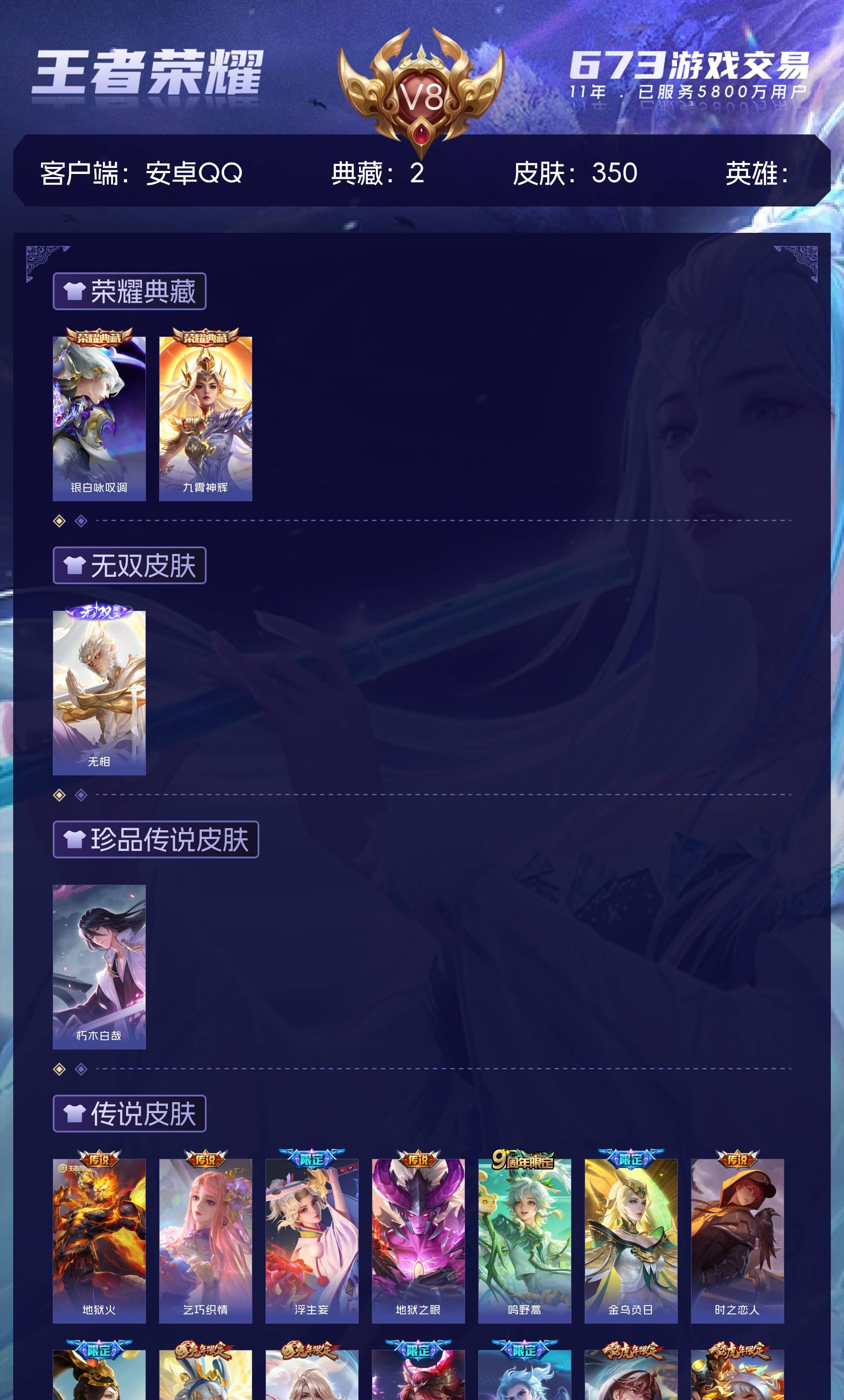 安卓QQ/至尊星耀/350皮肤/126英雄/2典藏/0珍品无双/1无双/1珍品传说/21传说/101