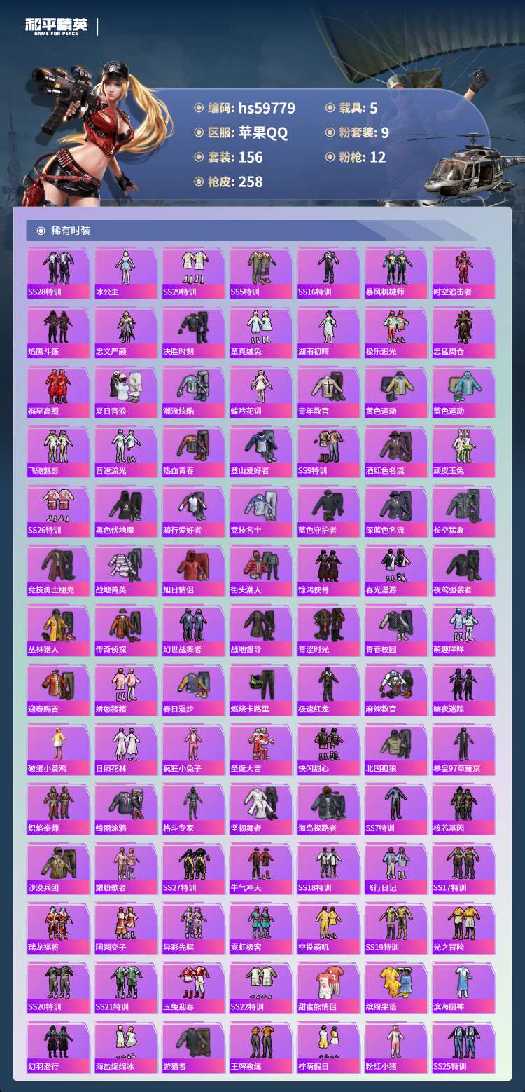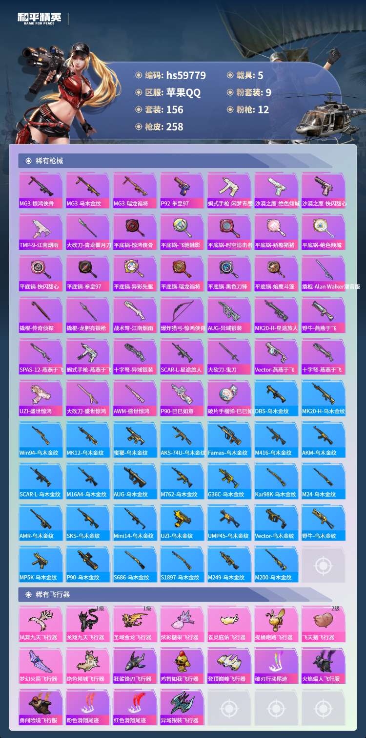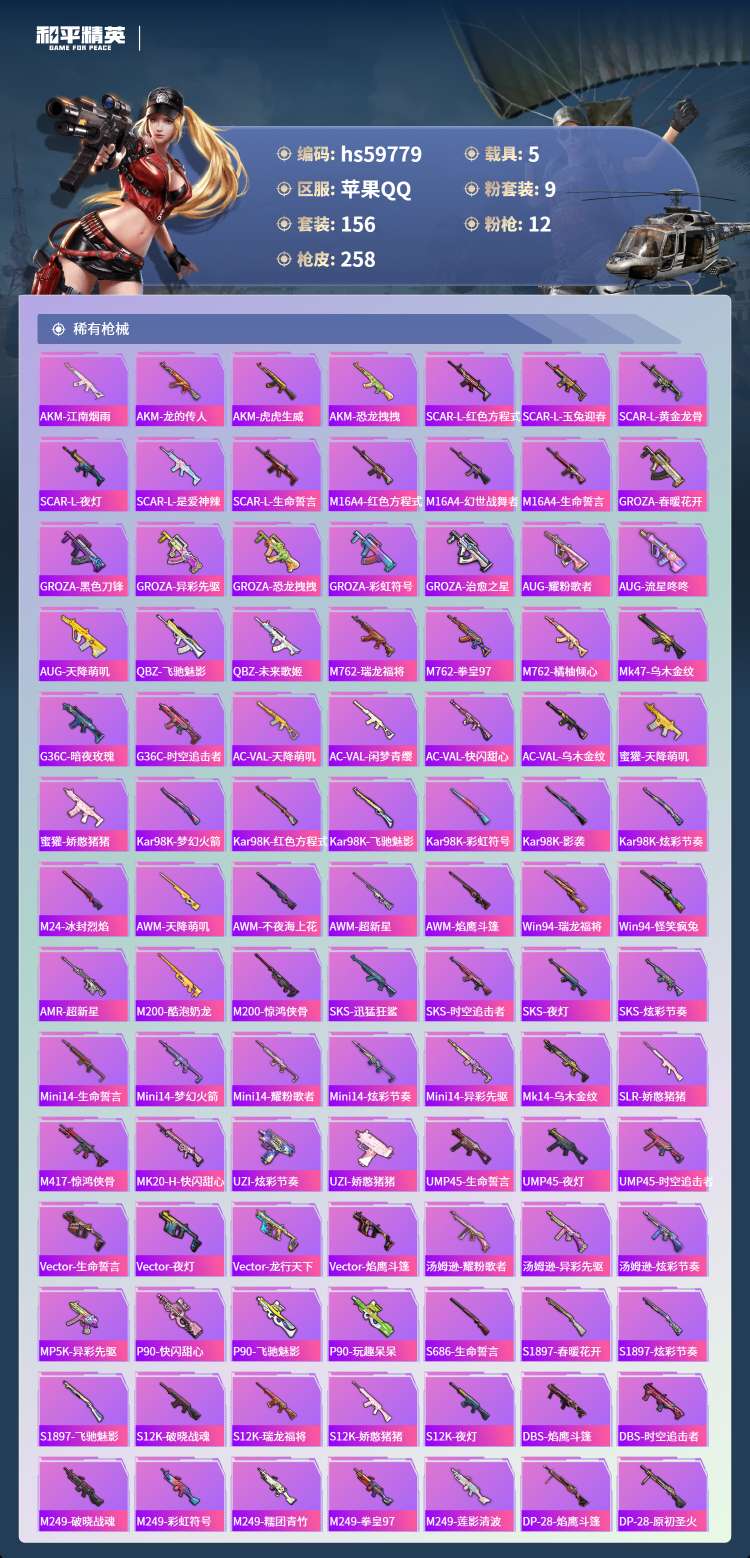 hs59779 苹果手Q-6王牌印记-1红装-9粉装-12特效枪-5载具-82875热力值-156套