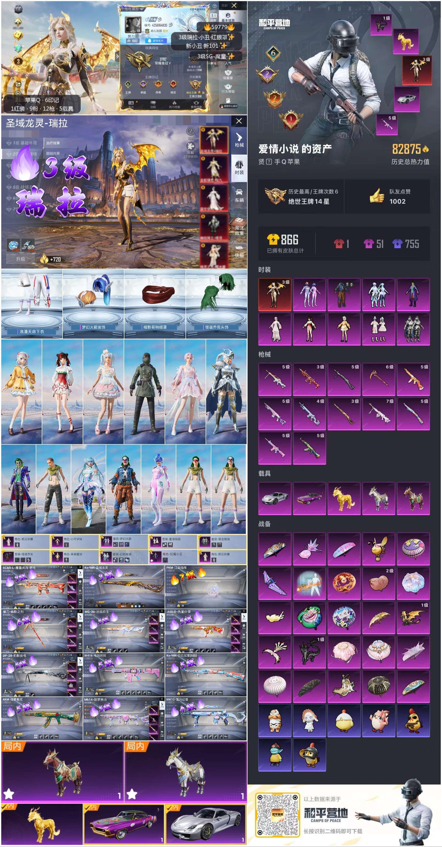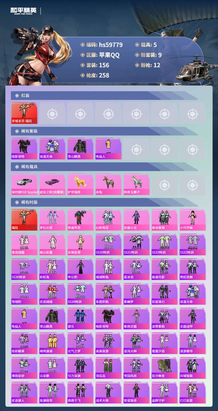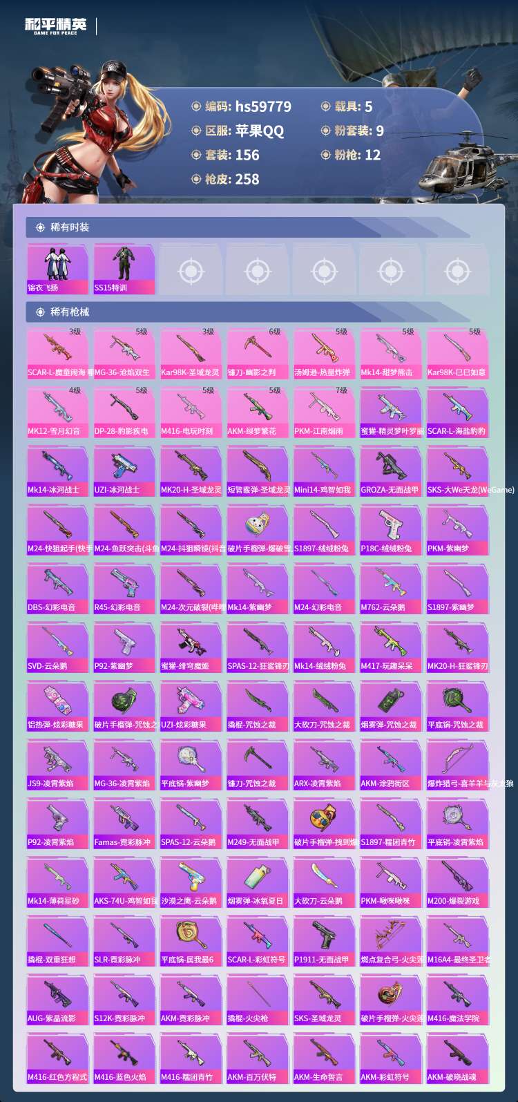 hs59779 苹果手Q-6王牌印记-1红装-9粉装-12特效枪-5载具-82875热力值-156套