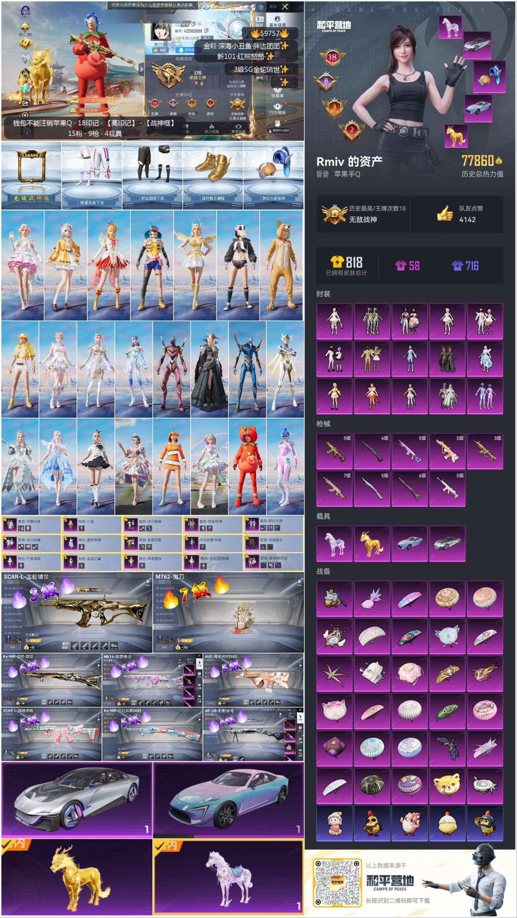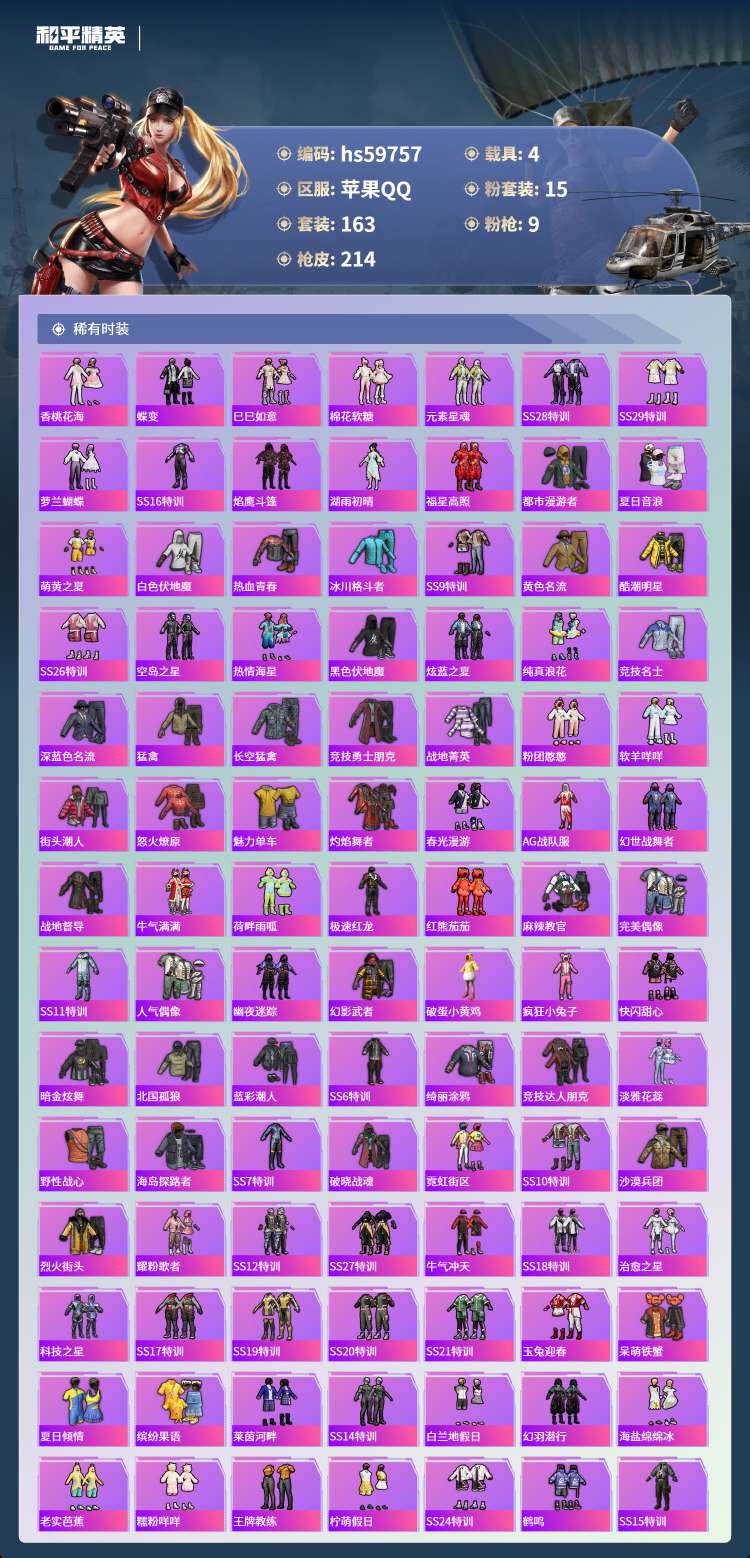 hs59757 苹果手Q-18王牌印记-有战神框-15粉装-9特效枪-4载具-77860热力值-16