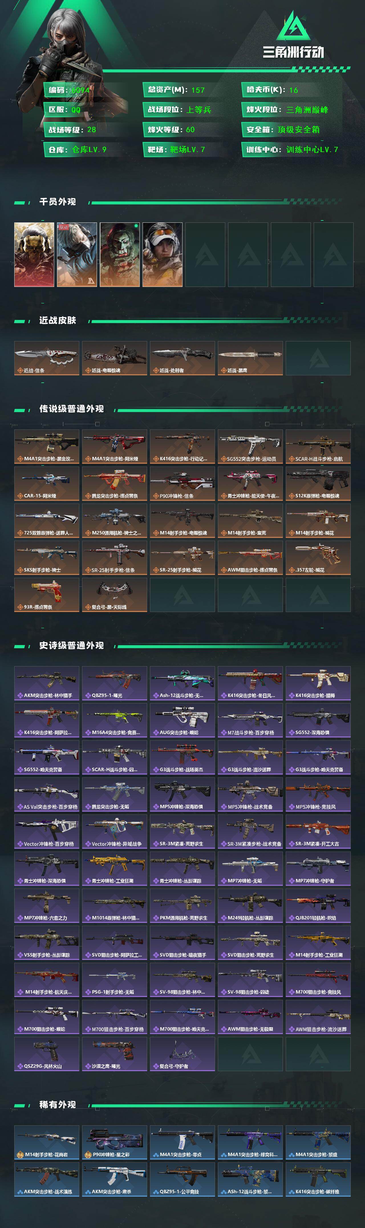 {特价出售}等级:60 总资产:157.3M 纯币 16199红皮:蚀金玫瑰 刀皮:信条,电锯惊魂特勤处:仓库9,训练7,靶场7 部门33333蜂医-送葬人·无题密令,红狼-电锯惊魂,露娜-金牌射手