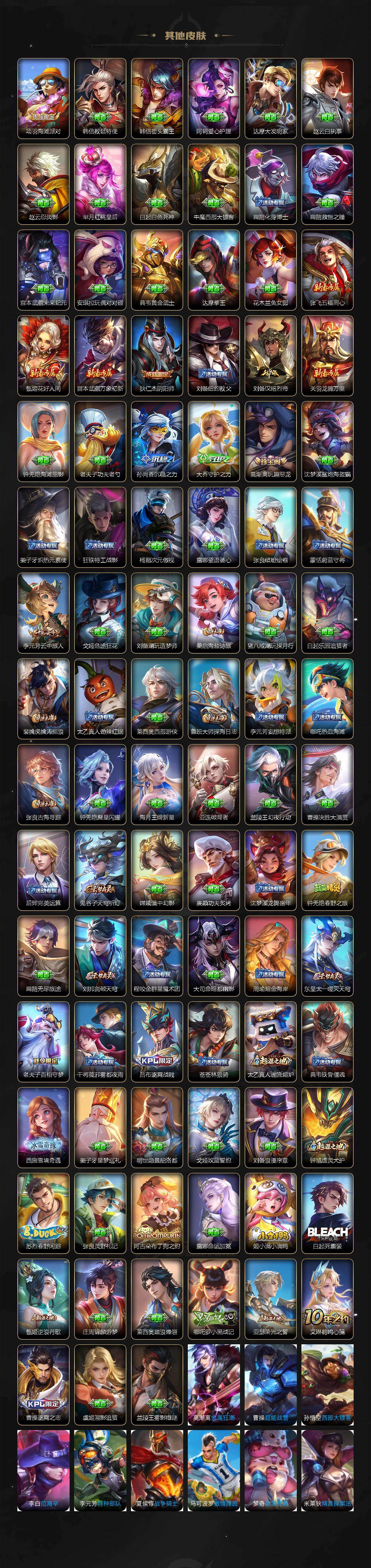 【限定皮肤】:狄仁杰阴阳师,高渐离玩趣恶龙,项羽海滩派对,李元芳云中旅人,鬼谷子五谷丰年,裴擒虎李小龙,裴擒虎擒涛扼浪,云中君纤云弄巧,嫦娥拒霜思,鲁班