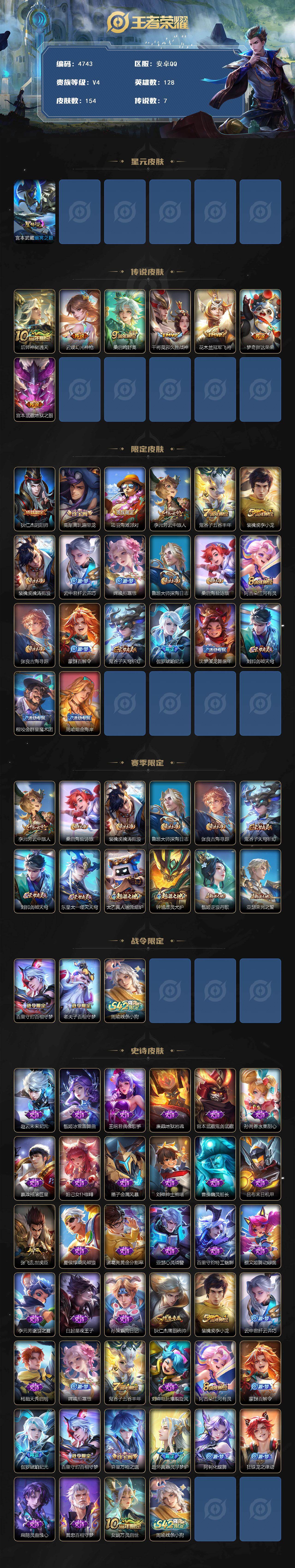 安卓Q-V4-最强王者段位-128英雄-154皮肤-7传说-39史诗