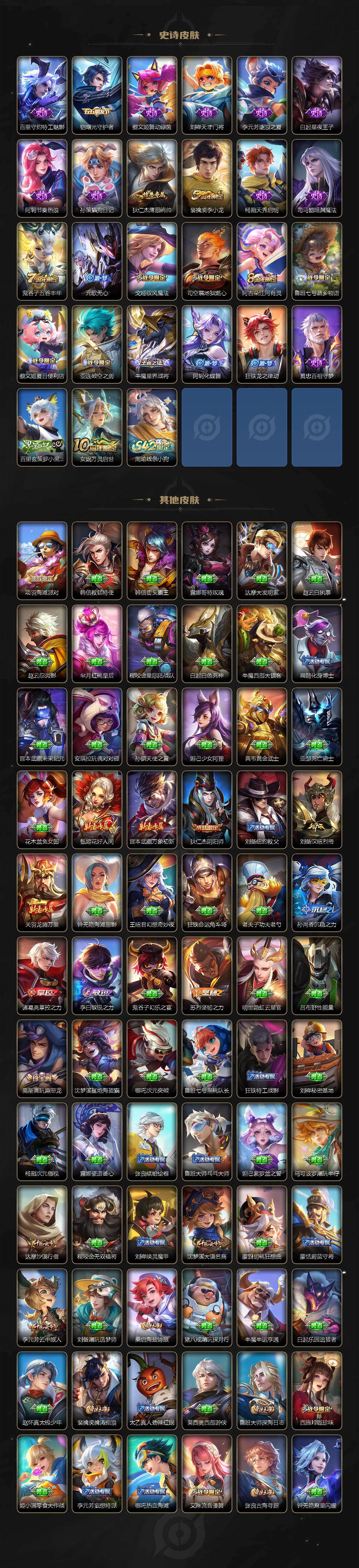 【限定皮肤】:蔡文姬夏日便利店,虞姬夏日便利店,姜子牙天穹之誓,狄仁杰阴阳师,赵云皇家上将,孙尚香蔷薇恋人,高渐离玩趣恶龙,元歌无心,狄仁杰魔术师,达摩沙漠行僧,项羽海滩派对,李