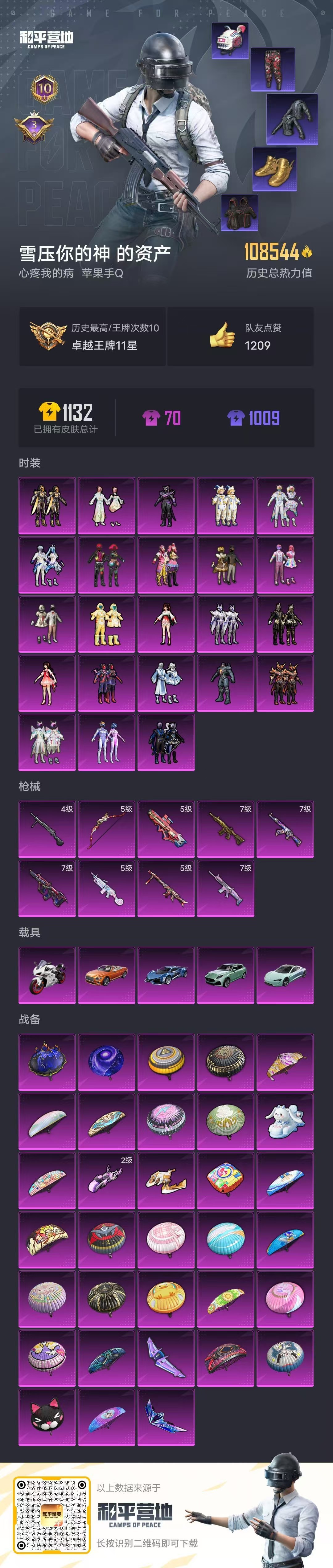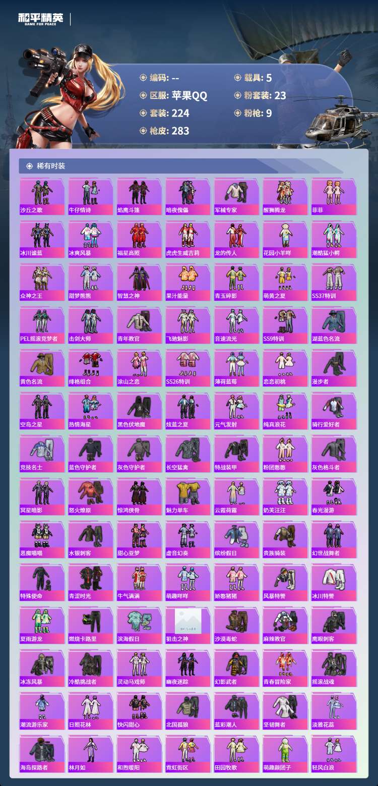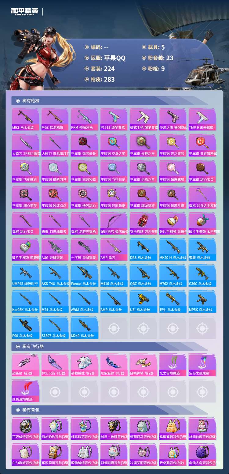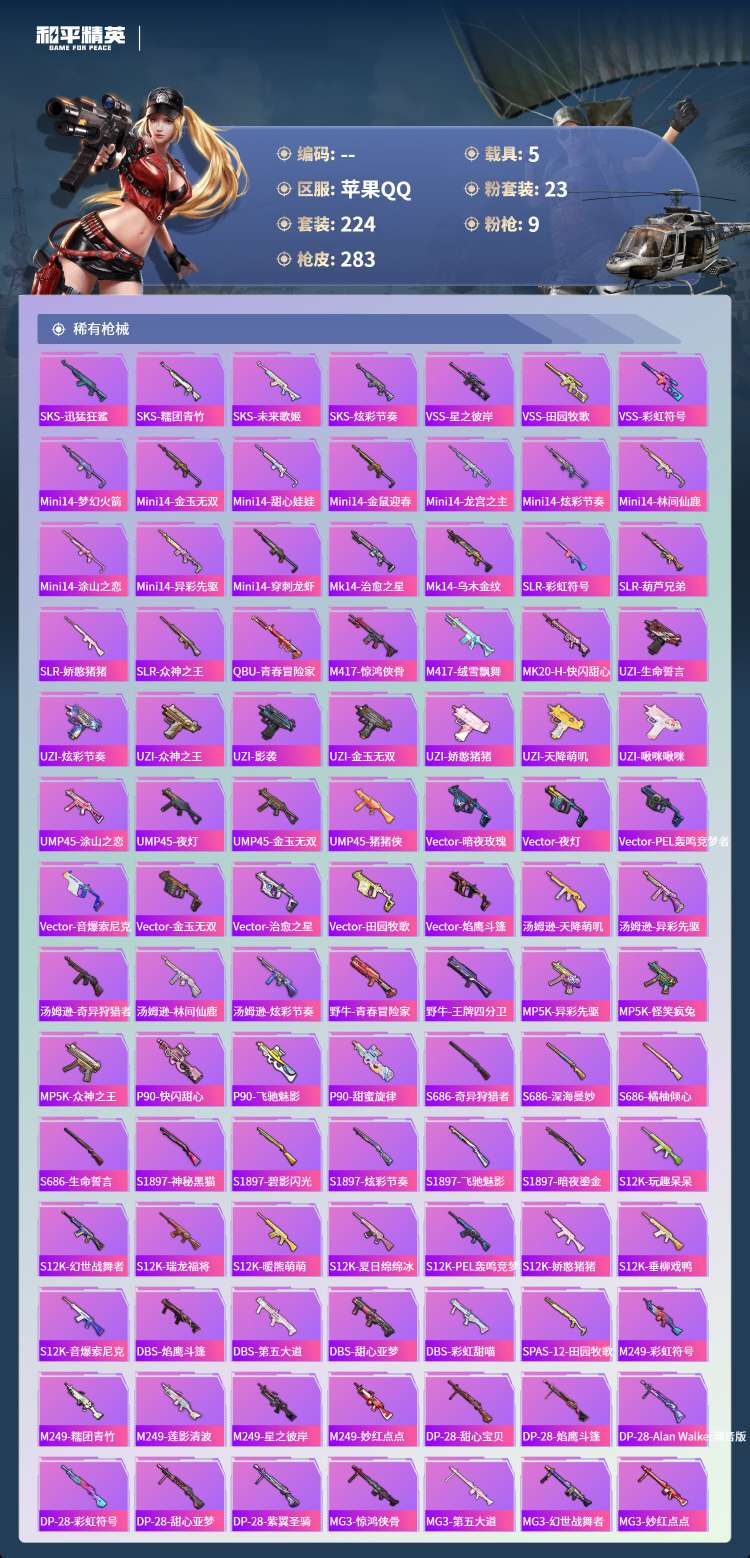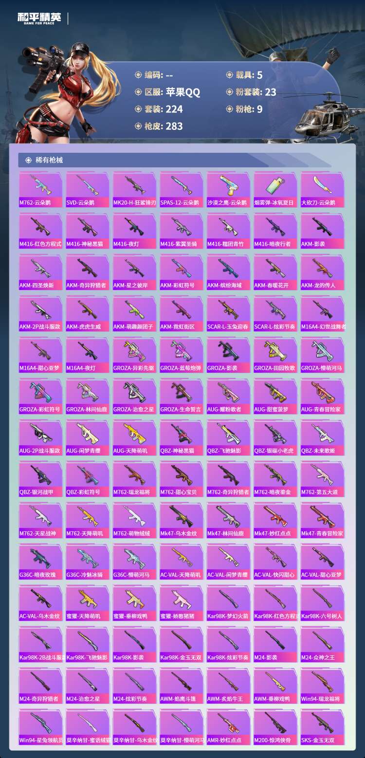 hs39067 苹果手Q-10王牌印记-23粉装-9特效枪-5载具-108557热力值-224套装-