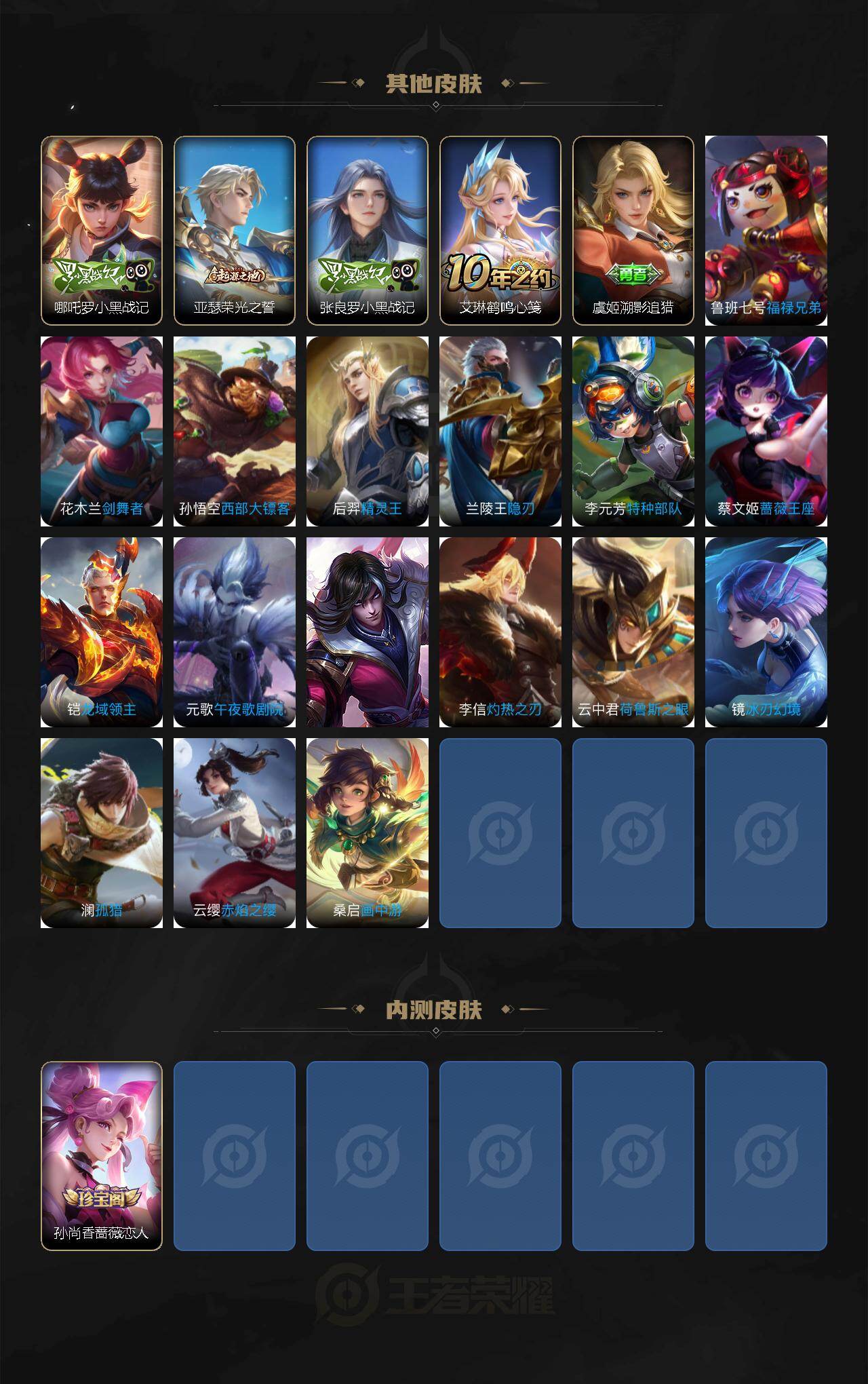【限定皮肤】:蒙犽顽岩魄,姜子牙天穹之誓,狄仁杰阴阳师,孙尚香蔷薇恋人,项羽海滩派对,裴擒虎擒涛扼浪,鲁班大师探海日志,桑启海盐诗旅,张良古海寻踪,鬼谷子天穹祈灯,程咬金群星魔术团,周瑜熔金海岸