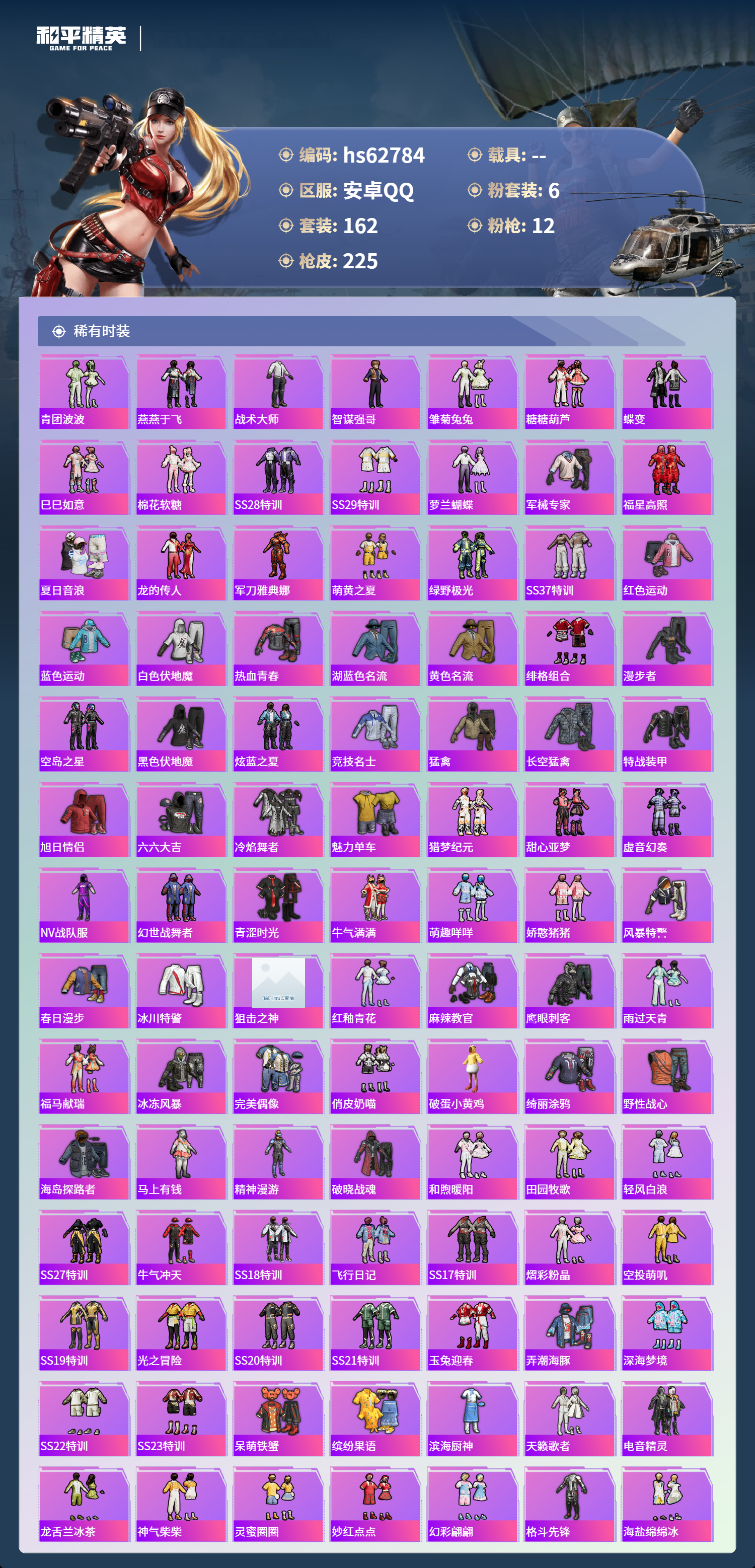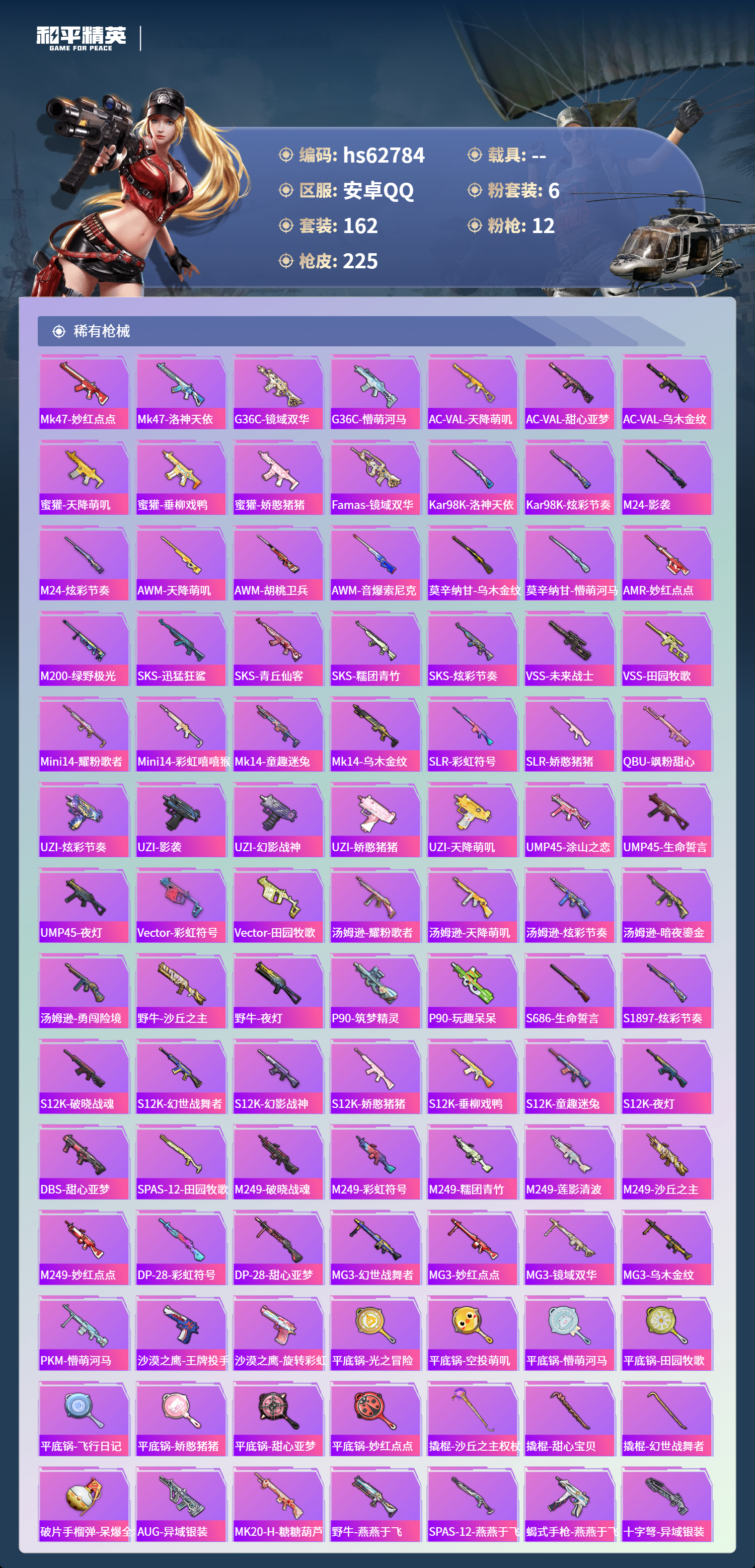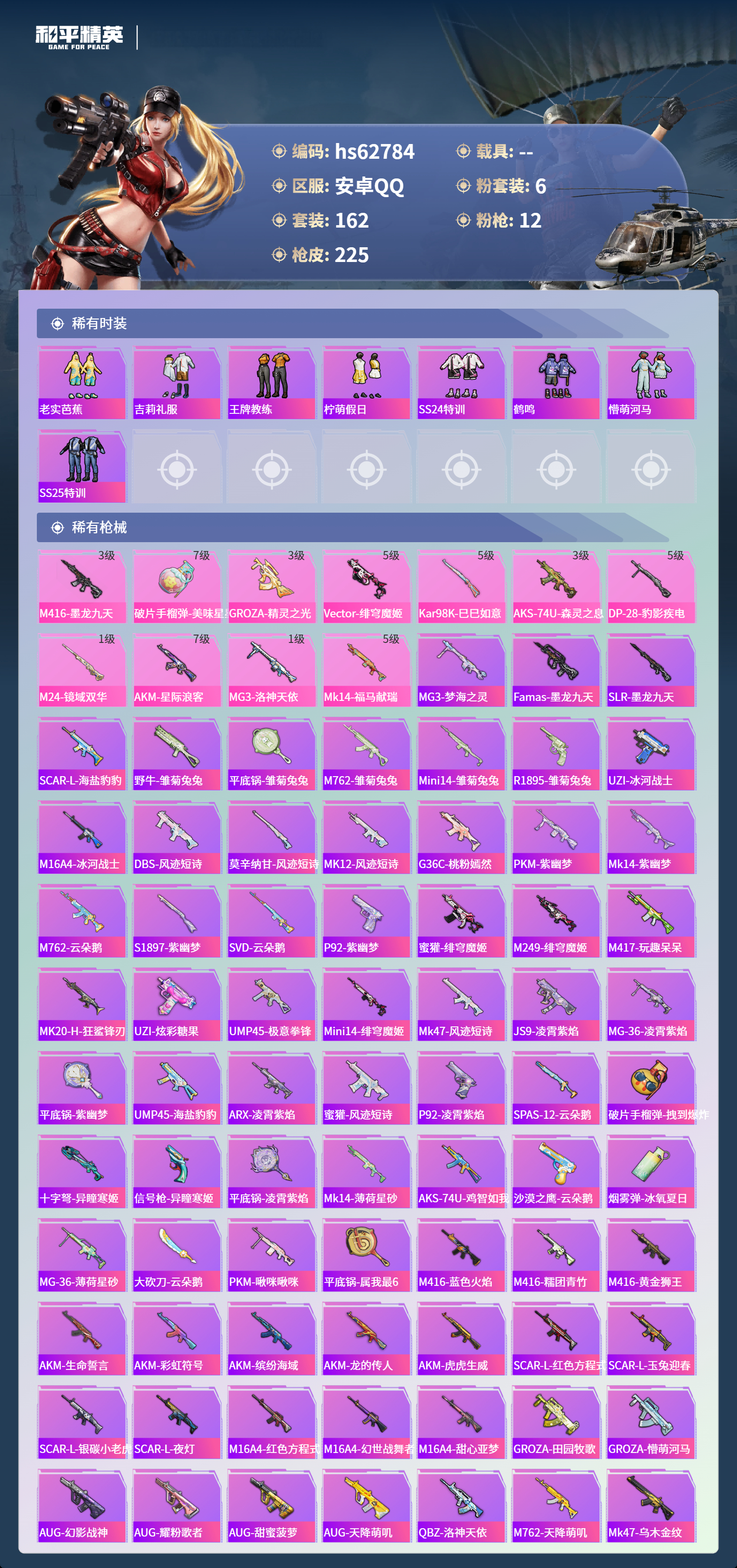 hs62784 安卓手Q-12王牌印记-1红装-6粉装-12特效枪-76647热力值-162套装-225枪皮-3卓越印记