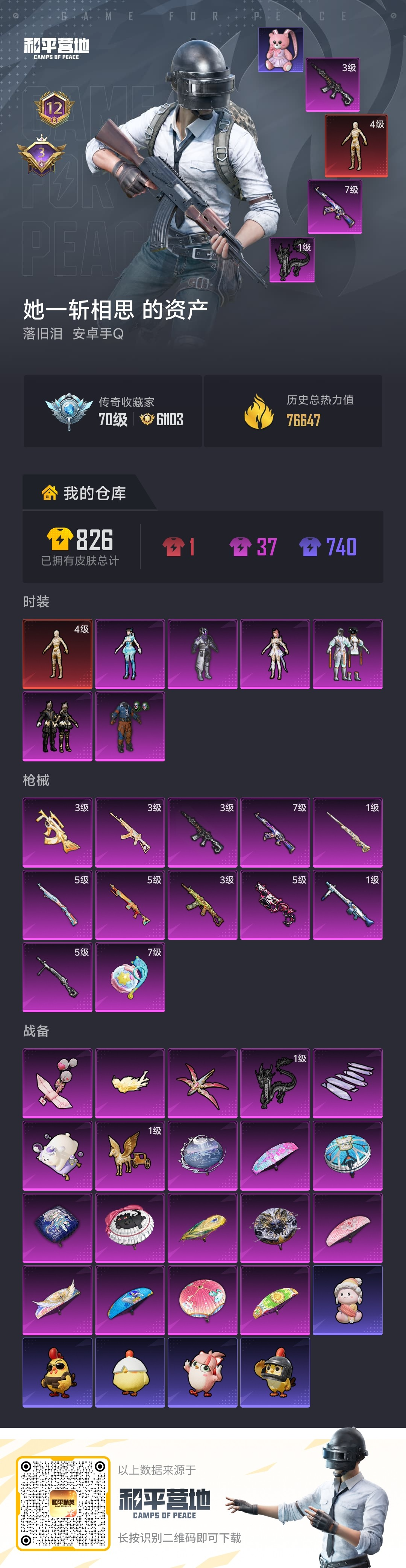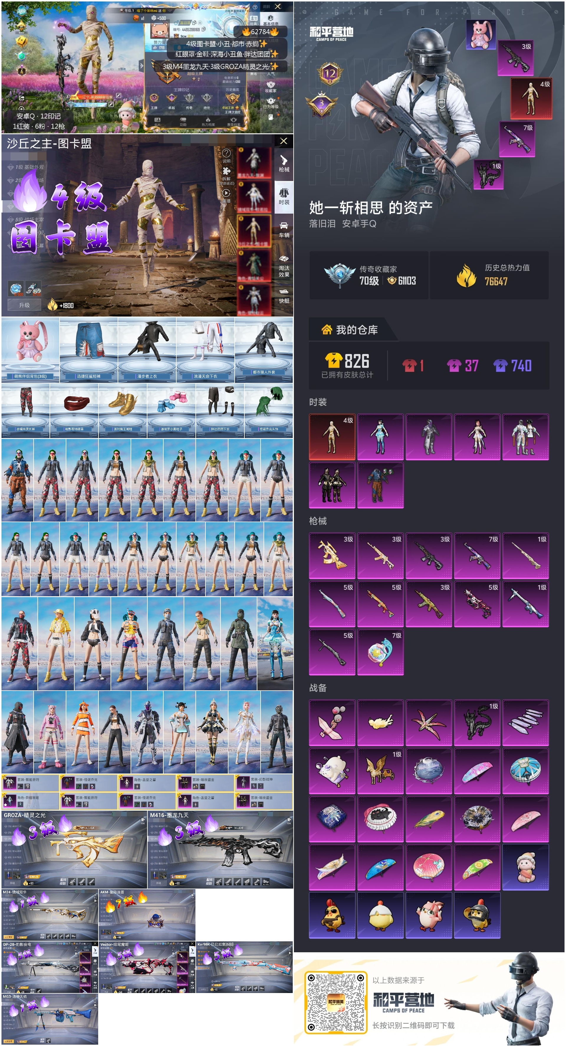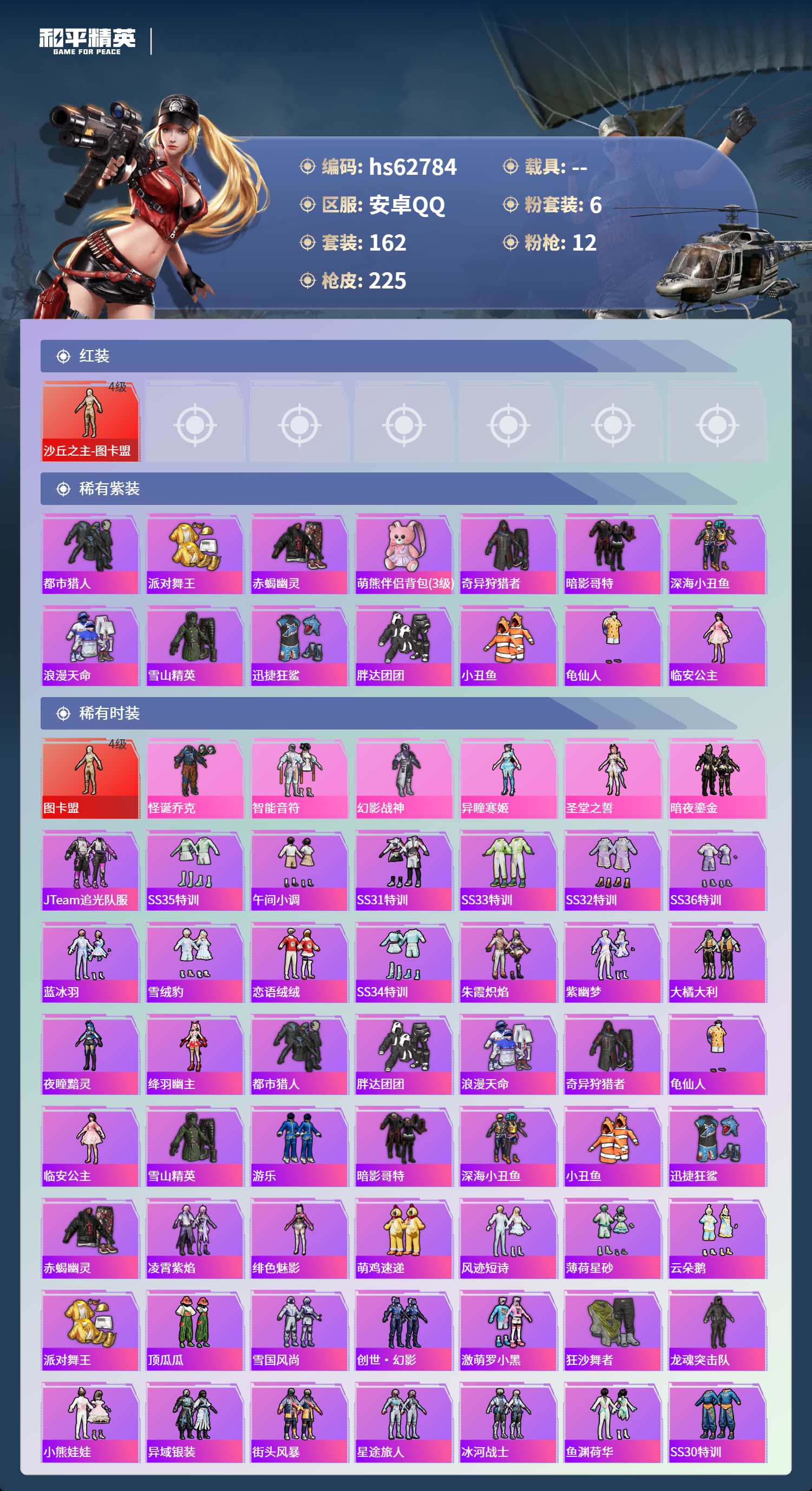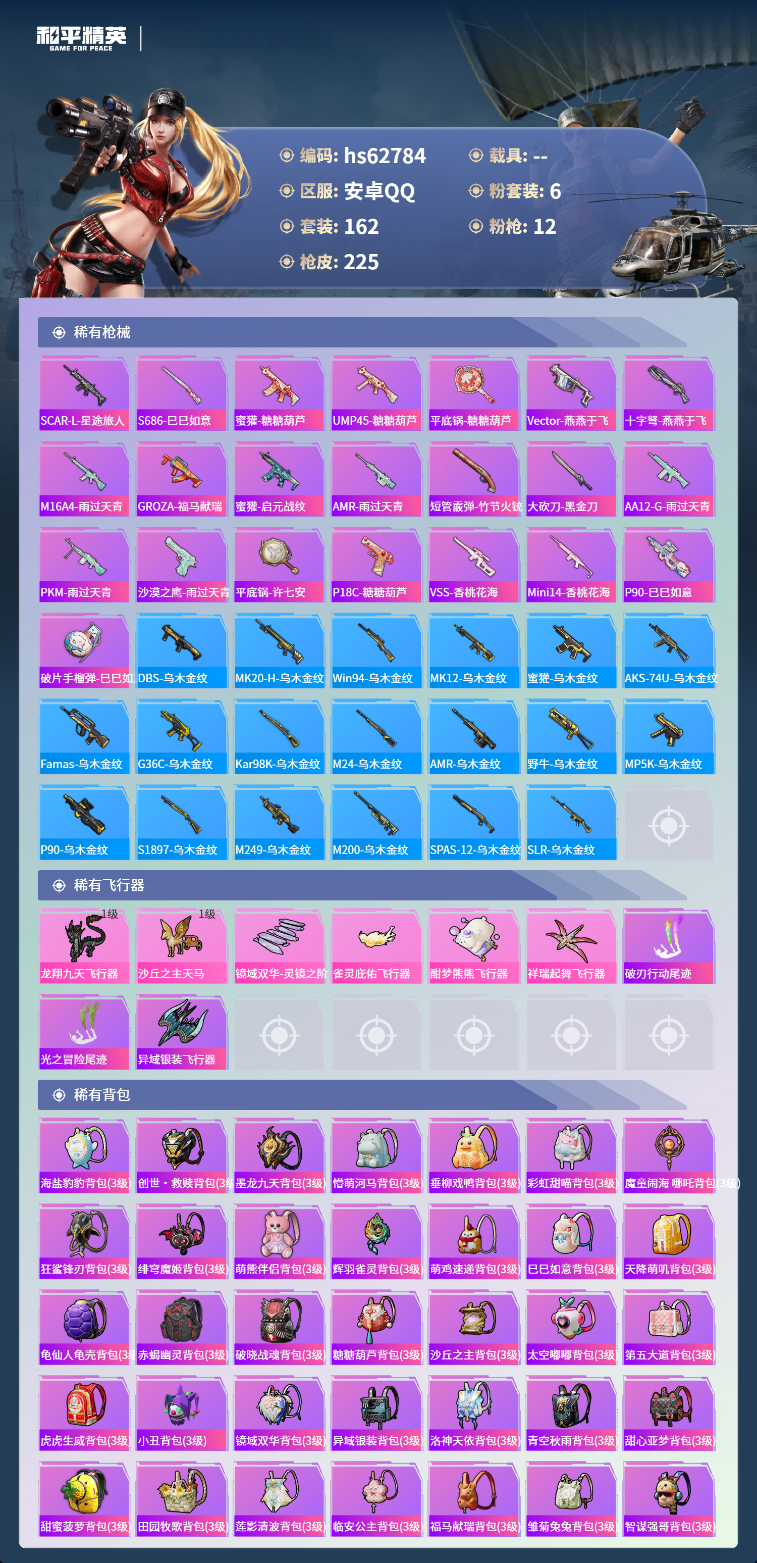hs62784 安卓手Q-12王牌印记-1红装-6粉装-12特效枪-76647热力值-162套装-225枪皮-3卓越印记