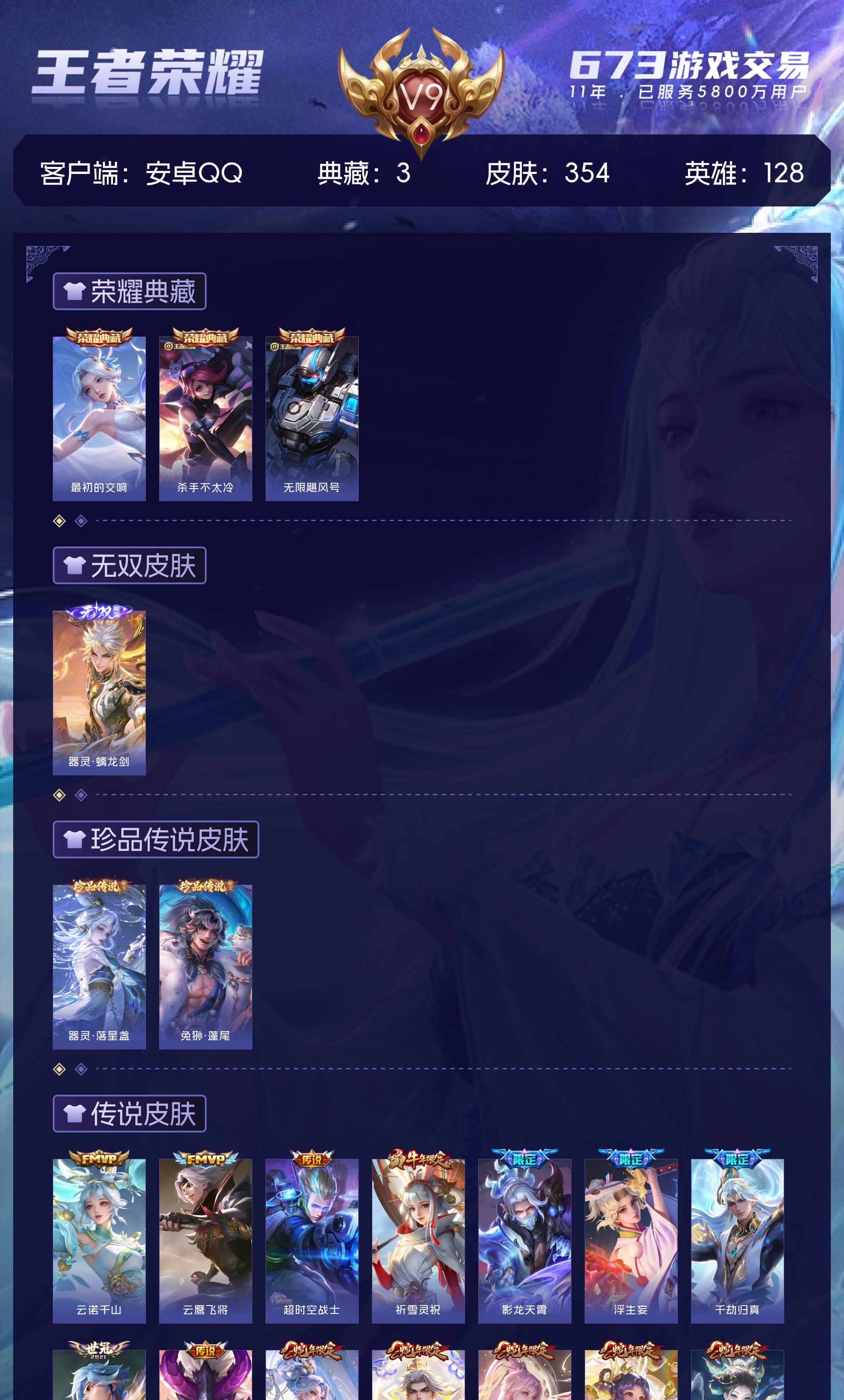 V9 皮肤354 英雄128 无双王者 荣耀典藏3 无双皮肤1 珍品传说2 传说33 其他皮肤322