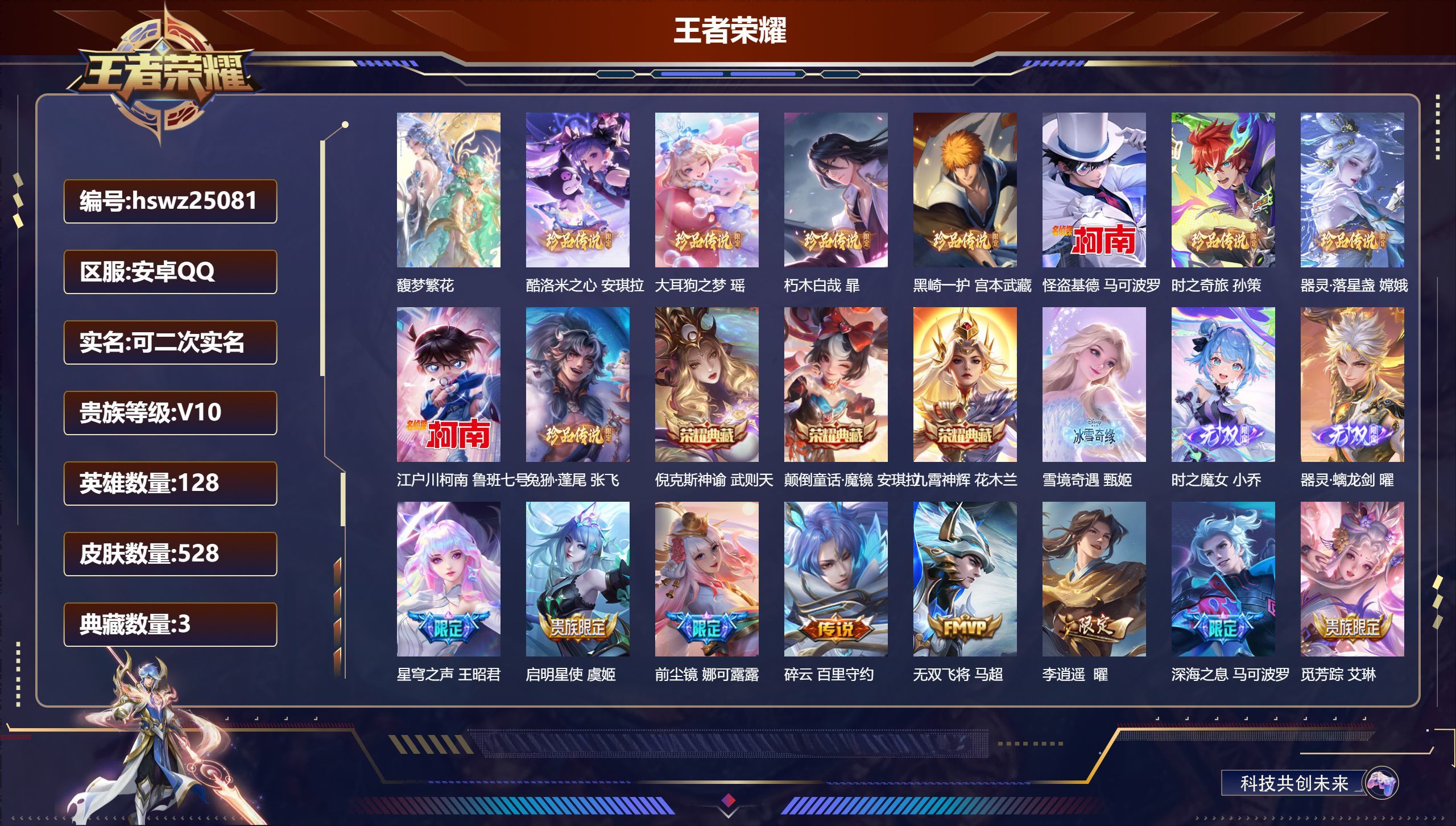 安卓QQ/绝世王者/528皮肤/128英雄/3典藏/1珍品无双/3无双/9珍品传说/58传说/179