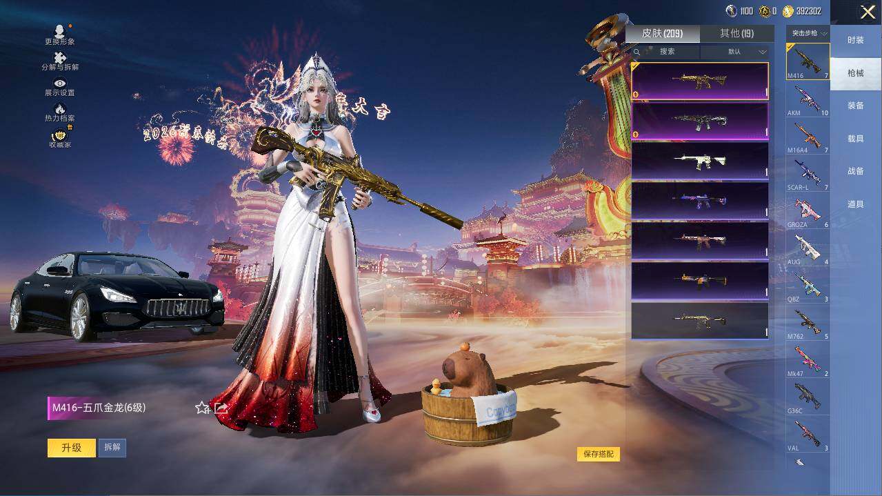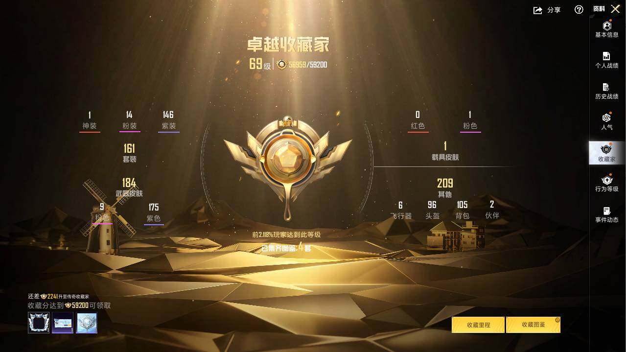 1神装-14粉装-9特效枪-1载具-3粉色飞行器-71123热力值-7王牌印记-161套装-209枪皮