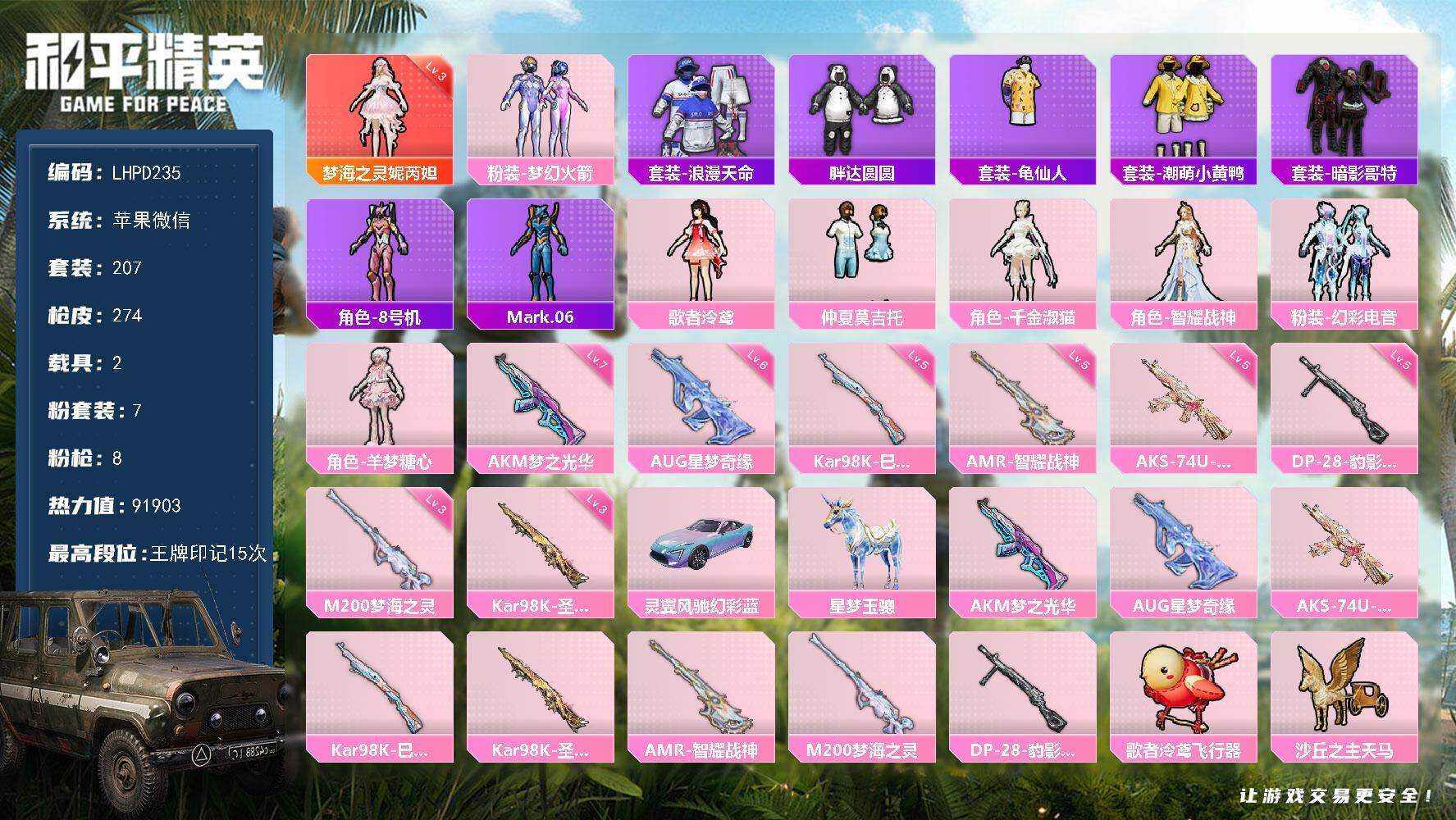【特价出售/店主推荐】苹果 微信-1神装-7粉装-8特效枪-2载具-10粉色飞行器-91903热力值-15王牌印记-207套装-274枪皮【红色神装等级】:梦海之灵-妮芮妲(三级)【红色角色神装】:梦海之灵-妮芮妲【热门品类】:粉装-梦幻火箭,套装-浪漫天命,套装-胖达圆圆,套装-龟仙人,套装-潮萌小黄鸭,套装-暗影哥特,角色-8号机,角色-Mark.06【粉色套装】:粉装-梦幻火箭,角色-歌者泠鸢,粉装-仲夏莫吉托,角色-千金淑猫,角色-智耀战神,粉装-幻彩电音,角色-羊梦糖心【粉色枪皮等级】