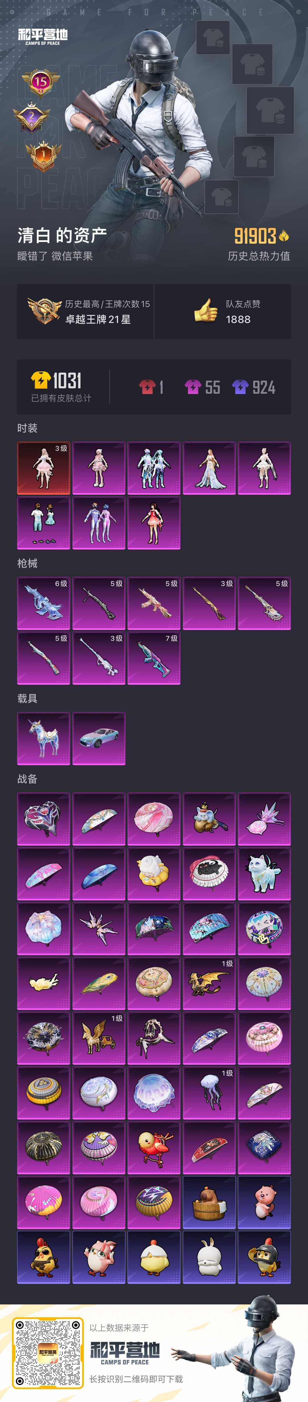 1神装-7粉装-8特效枪-2载具-10粉色飞行器-91903热力值-15王牌印记-207套装-274枪皮