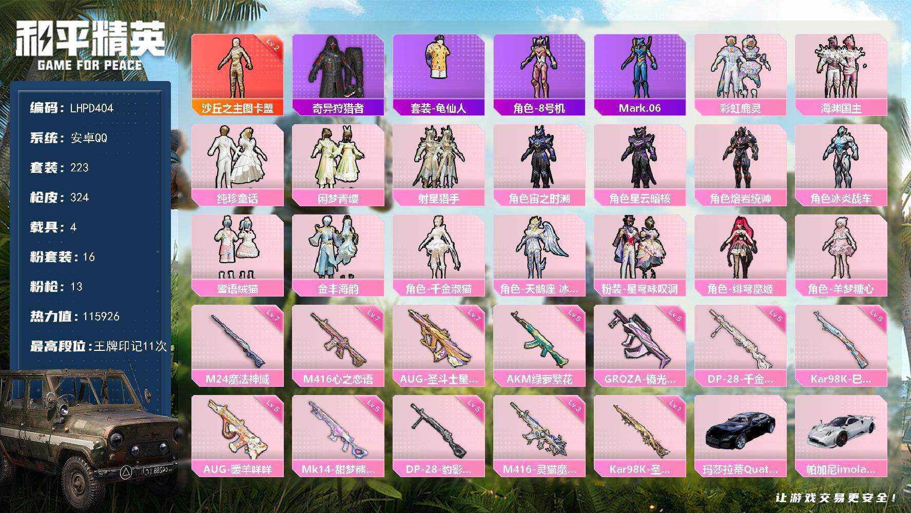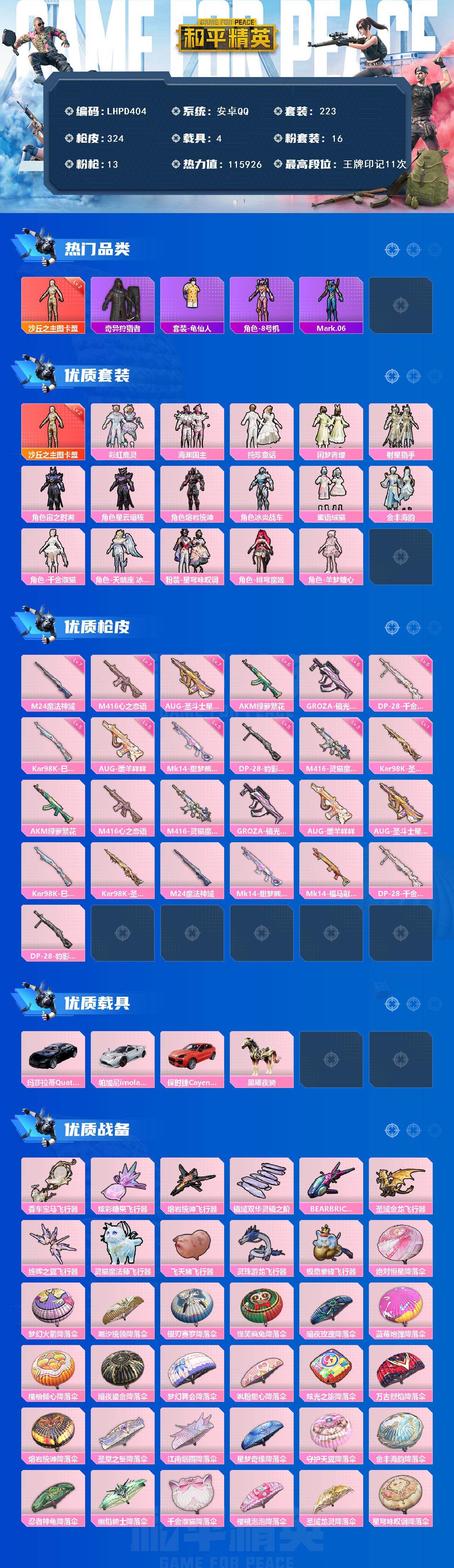 【店主推荐捡漏号!可直接换绑】安卓 手Q-1神装-16粉装-13特效枪-4载具-11粉色飞行器-115926热力值-11王牌印记-223套装-324枪皮【红色神装等级】:沙丘之主-图卡盟(二级)【红色角色神装】:沙丘之主-图卡盟【热门品类】:套装-奇异狩猎者,套装-龟仙人,角色-8号机,角色-Mark.06【粉色套装】:粉装-彩虹鹿灵,粉装-海渊国主,粉装-纯珍童话,粉装-闲梦青缨,粉装-射星猎手,角色-宙之时溯,角色-星云暗核,角色-熔岩统帅,角色-冰炎战车,粉装-蜜语绒猫,粉装-金丰海韵,角