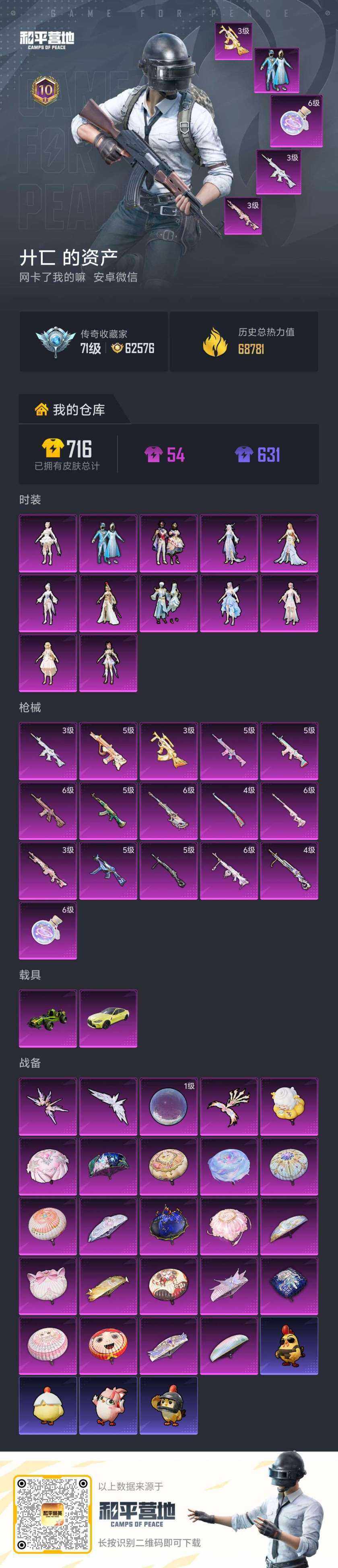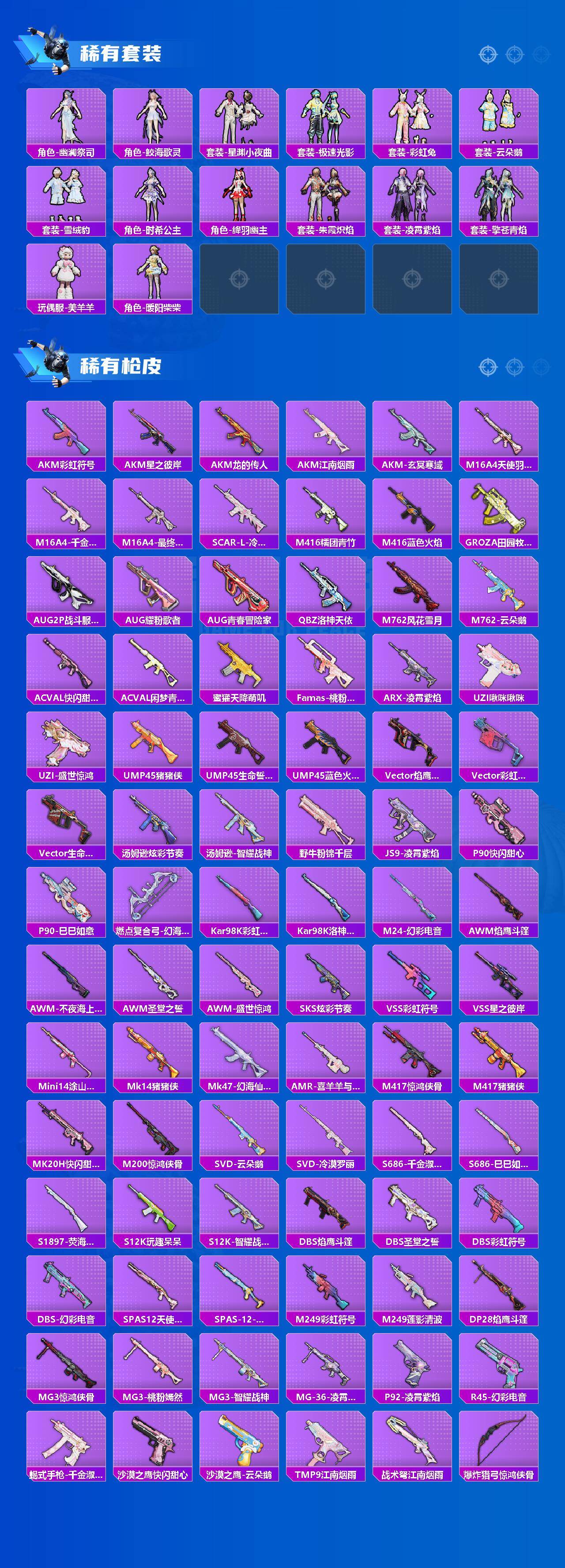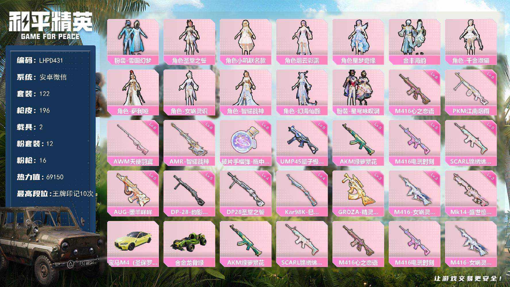 【特价出售/店主推荐】安卓 微信-12粉装-16特效枪-2载具-4粉色飞行器-69150热力值-10王牌印记-122套装-196枪皮【热门品类】:粉装-雪国幻梦【粉色套装】:粉装-雪国幻梦,角色-圣堂之誓,角色-小叽联名款,角色-烟云彩露,角色-星梦奇缘,粉装-金丰海韵,角色-千金淑猫,角色-萨利娅,角色-女娲灵识,角色-智耀战神,角色-幻海仙踪,粉装-星穹咏叹调【粉色枪皮等级】:AKM-绿萝繁花(五级),SCAR-L-锦绣绵绵(五级),M416-心之恋语(六级),M416-电玩时刻(五级),M