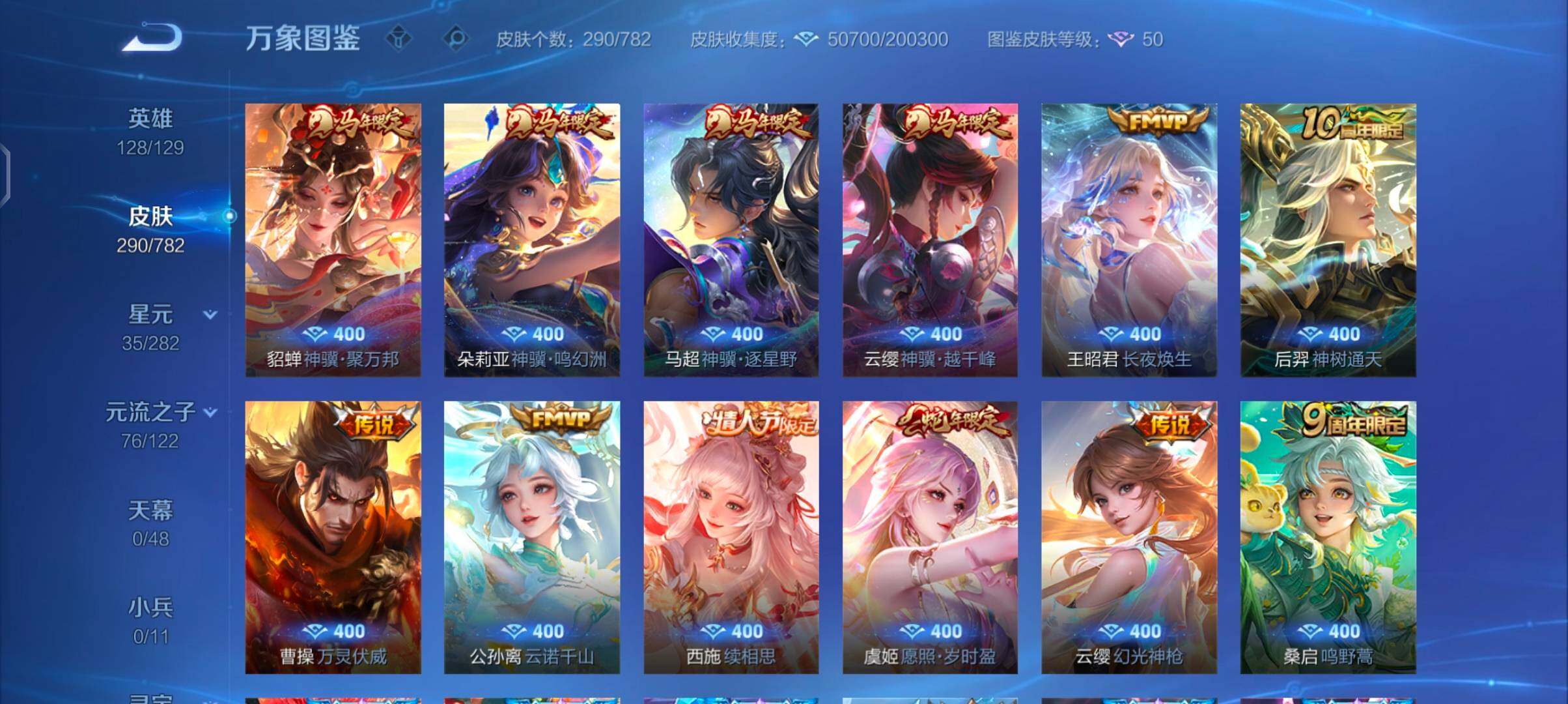 128英雄-290皮肤-7王者印记-300铭文-贵族积分10w