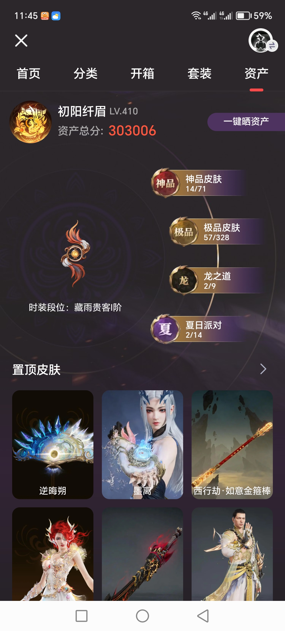 MYJ420【14红 57金 2龙之道 锦鲤玉扇 如意金箍棒 飞将戟】【游戏等级】410【大区】国服【神品皮肤】龙雀 锦鲤玉扇 苍穹之光 飞将戟 赤皓新囍 墨离 西行劫·如意金箍棒 少阳剑 逆晦朔 泣珠龙纱 狼主 绝代风华 化生明王 熛怒炼火【极品皮肤】夏日派对·高校水着 斗罗大陆·唐三 藏雨阁主 观山海·冬神玄冥 夏日派·半夏晚风 观山海·青鸟 绮云衫 巨鲸客 观山海·秋神蓐收 司天命 西行劫·神君印 神机袍·缤纷 织锦衫·缤纷 决战平安京·朔夜 新魔杰·斩魔天将 新魔杰·伏龙尊者 武道无穷