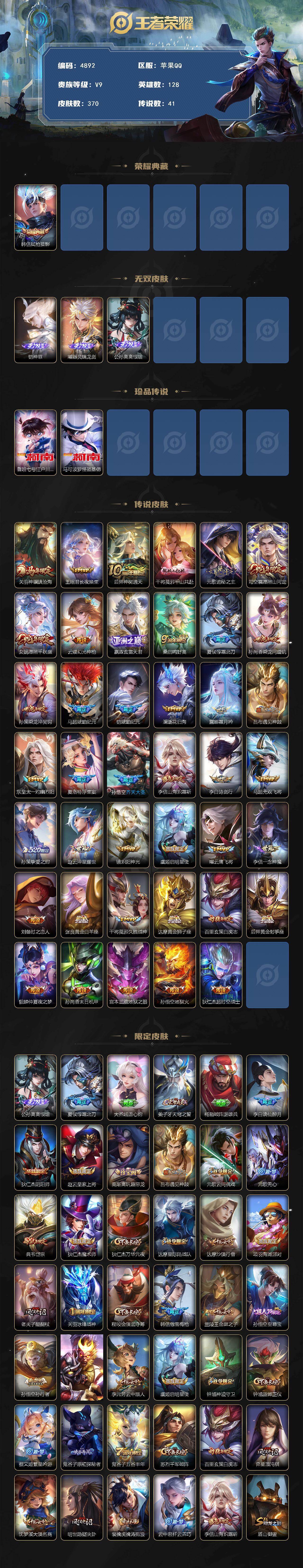 672-[17239590]幽冥眼 香香机甲 金色貂蝉 幽冥火苹果手Q123区370皮1典藏41传说3无双2珍品传说V9 营地ID544908952非凡王者【珍品传说皮肤】:怪盗基德,江户川柯南【无双皮肤】:神罪,器灵·螭龙剑,离恨烟【荣耀典藏】:弑枪猎影【优质限定皮肤】:神骥·镇沧海,白虎志,山海·炽霜斩,至尊宝,无双飞将【传说皮肤】:神骥·镇沧海,白虎志,灼幽烈阳,黄金射手座,长夜焕生,仲夏夜之梦,霜北刀,乘龙·问璇玑,神树通天,千山共赴,诡秘之主,霜月吟,浮生妄,黄金白羊座,愿照