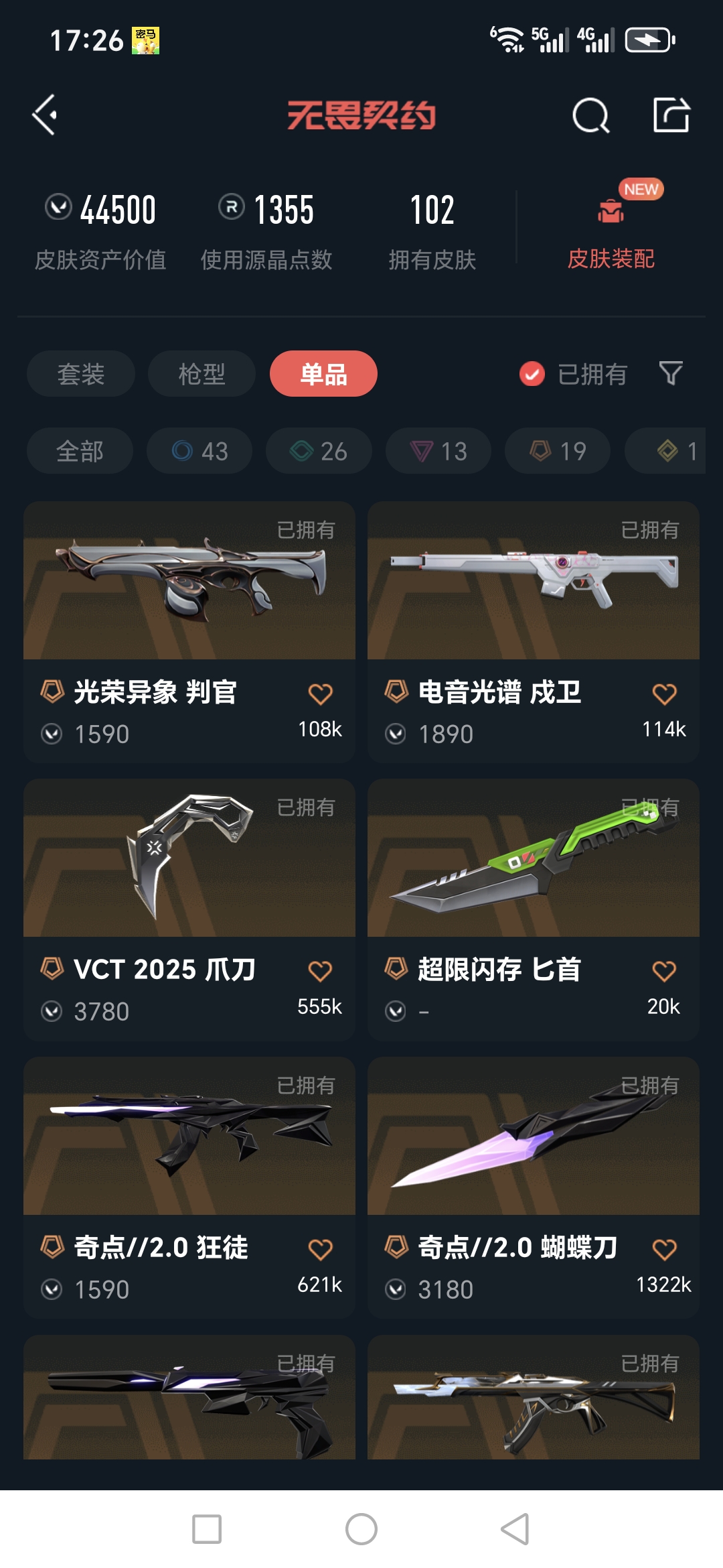 MWW538【奇点2.0套装 堕天遗武套装 VCT25爪刀】【游戏等级】Lv349 【段位】 黄金I 【R点】1,355 【皮肤总价值】44,500 【英雄数量】28 【皮肤数量】102 【挂饰数量】116 【卡面数量】169 【喷漆数量】144 【鬼魅】鬼魅-幻心猎手 鬼魅-诡秘蛇影 鬼魅-星云暗涌 鬼魅-宿怨 鬼魅-模拟赫兹 鬼魅-奇点//2.0 鬼魅-流星兵团 鬼魅-天界神兵 鬼魅-光导纤维 鬼魅-胡桃狂想 【标配】标配-星际猎兵 标配-阿特拉斯指挥部 标配-浮光跃金 标配-超能偶像 标