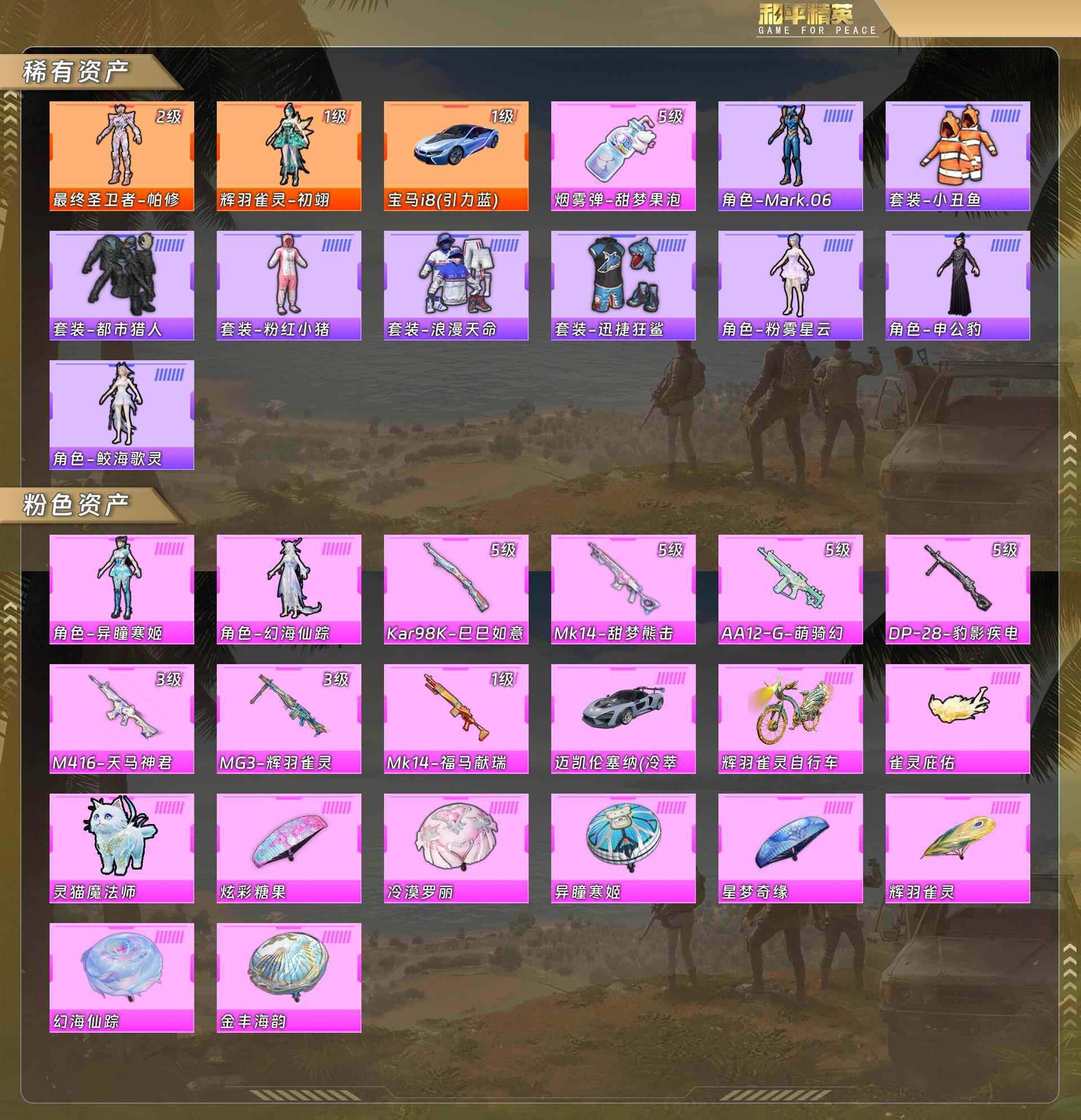 素材号-帕修斯2级/初翊1级/宝马i8(引力蓝)1级/烟雾弹甜梦果泡5级/蓝螳螂/小丑鱼/都市猎人/粉红小猪/浪漫天命/迅捷狂鲨/粉雾星云/申公豹/鲛海歌灵/异瞳寒姬/幻海仙踪/迈凯伦塞纳(蓝)/辉羽雀灵自行车 (2神装-2粉装-8粉枪-3载具)没战神框 HP6282-2粉色飞行器-37769热力值-4王牌印记-74套装-102枪皮