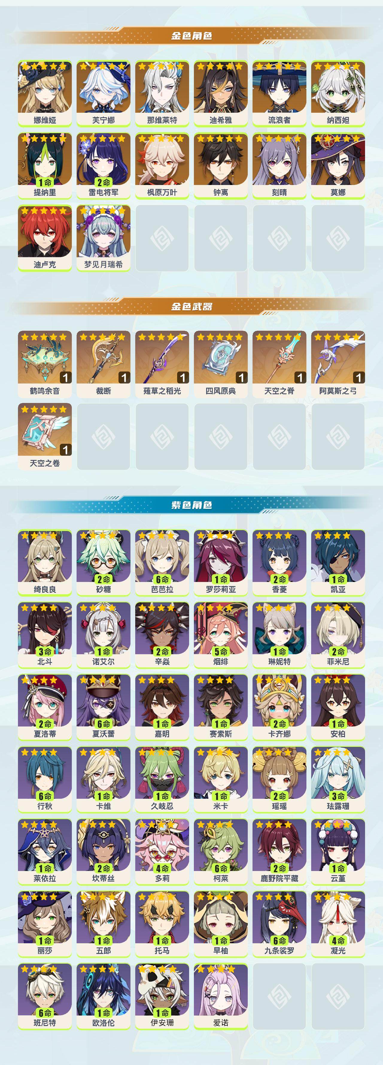 【YSYT384】57级/女主/15个五星角色/梦见月瑞希/娜维娅/芙宁娜/那维莱特/迪希雅/流浪者/纳西妲/1命提纳里/2命雷电将军/枫原万叶/钟离/刻晴/迪卢克/莫娜/鹤鸣余音/裁断/薙草之稻光/天空之卷/四风原典/阿莫斯之弓/天空之脊/0命爱诺/1命伊安珊/0命欧洛伦/2命卡齐娜/赛索斯/1命嘉明/满命夏沃蕾/2命夏洛蒂/2命菲米尼/1命琳妮特/绮良良/卡维/米卡/2命瑶瑶/3命珐露珊/1命莱依拉/2命坎蒂丝/4命多莉/满命柯莱/2命鹿野院平藏/1命久岐忍/云堇/1命五郎/0命托马/满命九