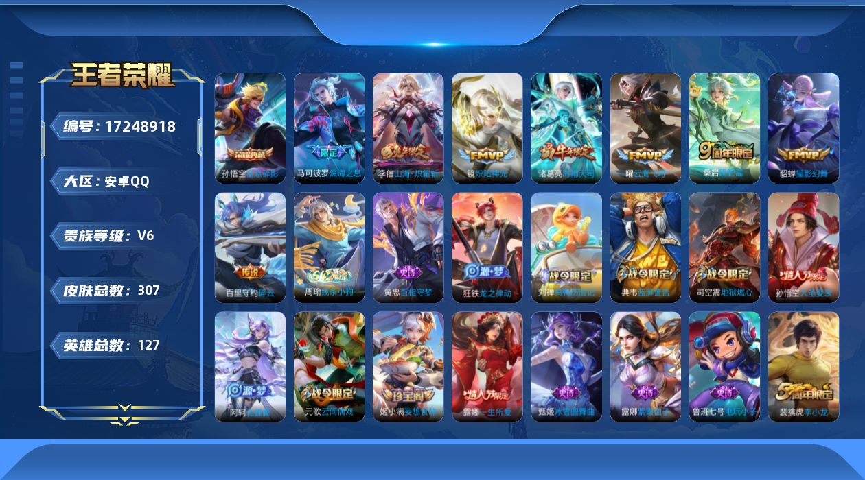 116-[17248918]贵族7-贵族积分32660-307皮-1典藏-8传说-2全皮英雄-1改名卡 安卓手Q104区 营地ID438737450至尊星耀II【荣耀典藏】:全息碎影【优质限定皮肤】:山海·炽霜斩【传说皮肤】:鸣野蒿,深海之息,炽阳神光,猫影幻舞,山海·炽霜斩,碎云,云鹰飞将,时雨天司【史诗皮肤】:暗夜贵公子,百相守梦,青蛇,鸭鸭历险记,星界战将,妄想食味,龙之律动,龙骑士,化蝶舞,乐园奇幻夜,茶境仙,猫狗日记,绅士熊喵,原初追逐者,舞动绿茵,月团寄思,箭羽风息,百相守梦,特工魅