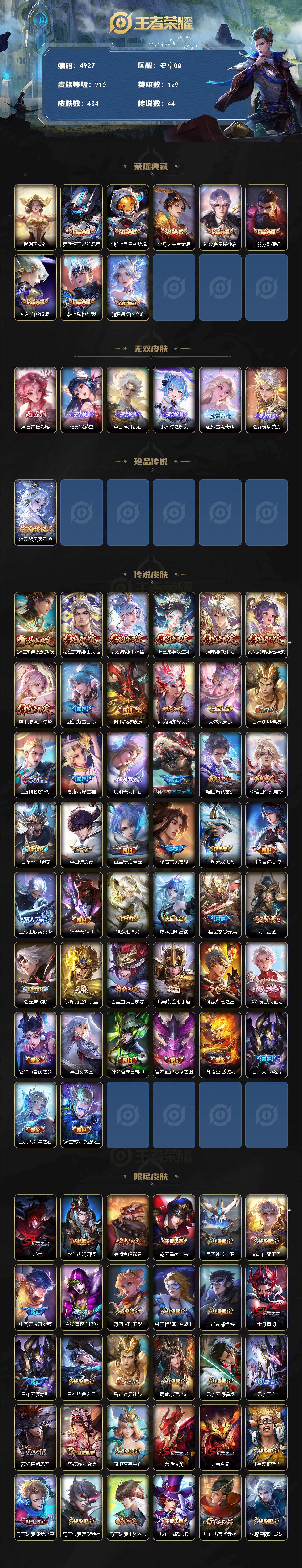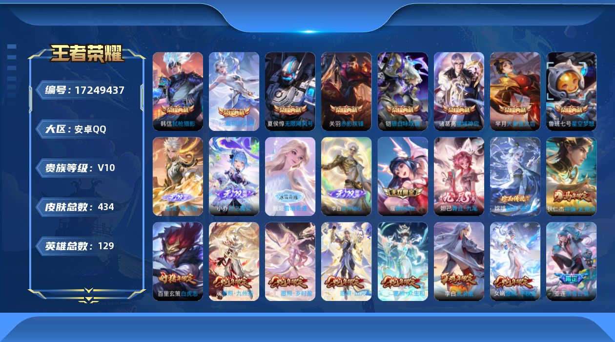 192-[17249437]可二次 九位数QQ 皇冠号 背包一颗荣耀水晶 春韵弦音天幕 贵族10-流光积分3717-贵族积分263022-434皮8典藏44传说6无双1珍品传说 安卓手Q509区434皮8典藏44传说6无双1珍品传说V10 营地ID340386106非凡王者【珍品传说皮肤】:器灵·落星盏【无双皮肤】:器灵·螭龙剑,瑶真我赫兹,雪境奇遇,时之魔女,碎月剑心,青丘·九尾【荣耀典藏】:最初的交响,无限飓风号,星空梦想,赤影疾锋,大秦宣太后,弑枪猎影,星域神启,