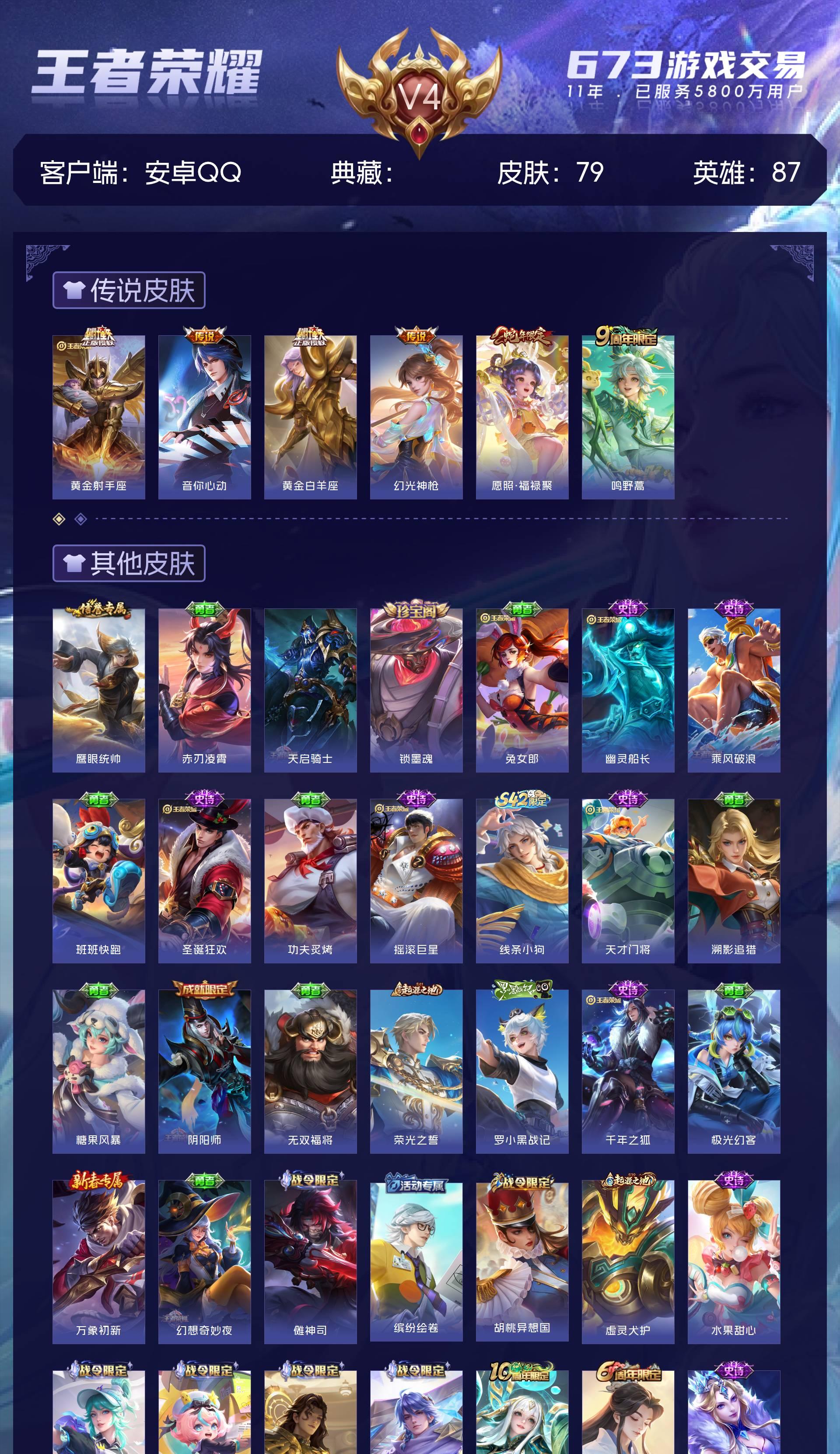 V4 皮肤79 英雄87 永恒钻石 传说6 其他皮肤77