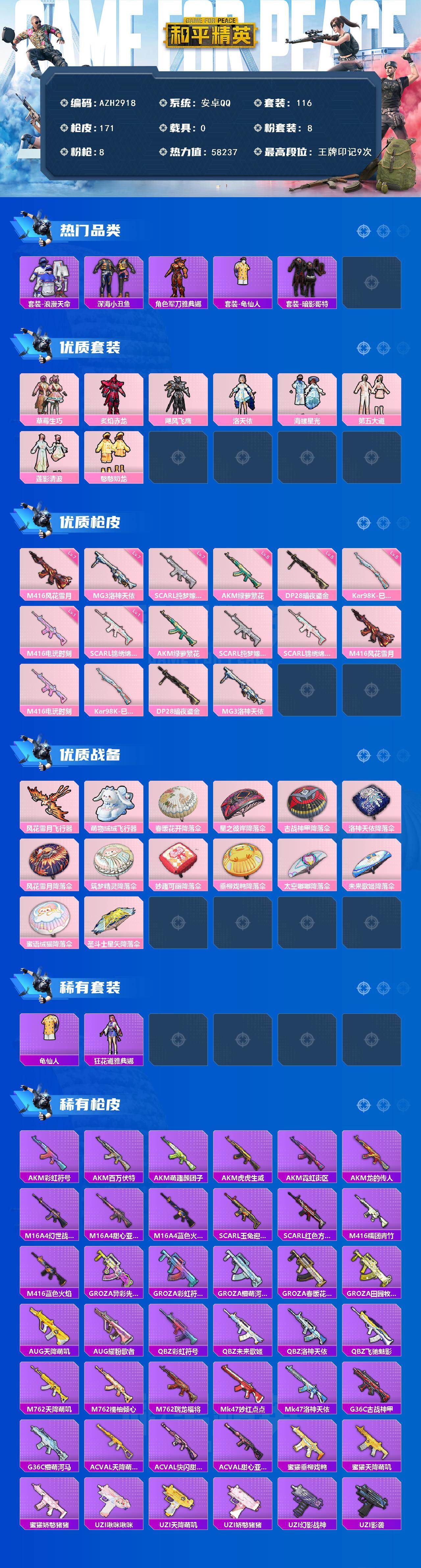 【AZH2918】安卓 手Q【洛天依第五大道草莓生巧 深海小丑鱼暗影哥特 满级纯梦嫁纱SCAR-L 满级风花雪月M416 满级洛神天依MG3】8粉装-8特效枪-0载具-2粉色飞行器-58237热力值-9王牌印记-116套装-171枪皮