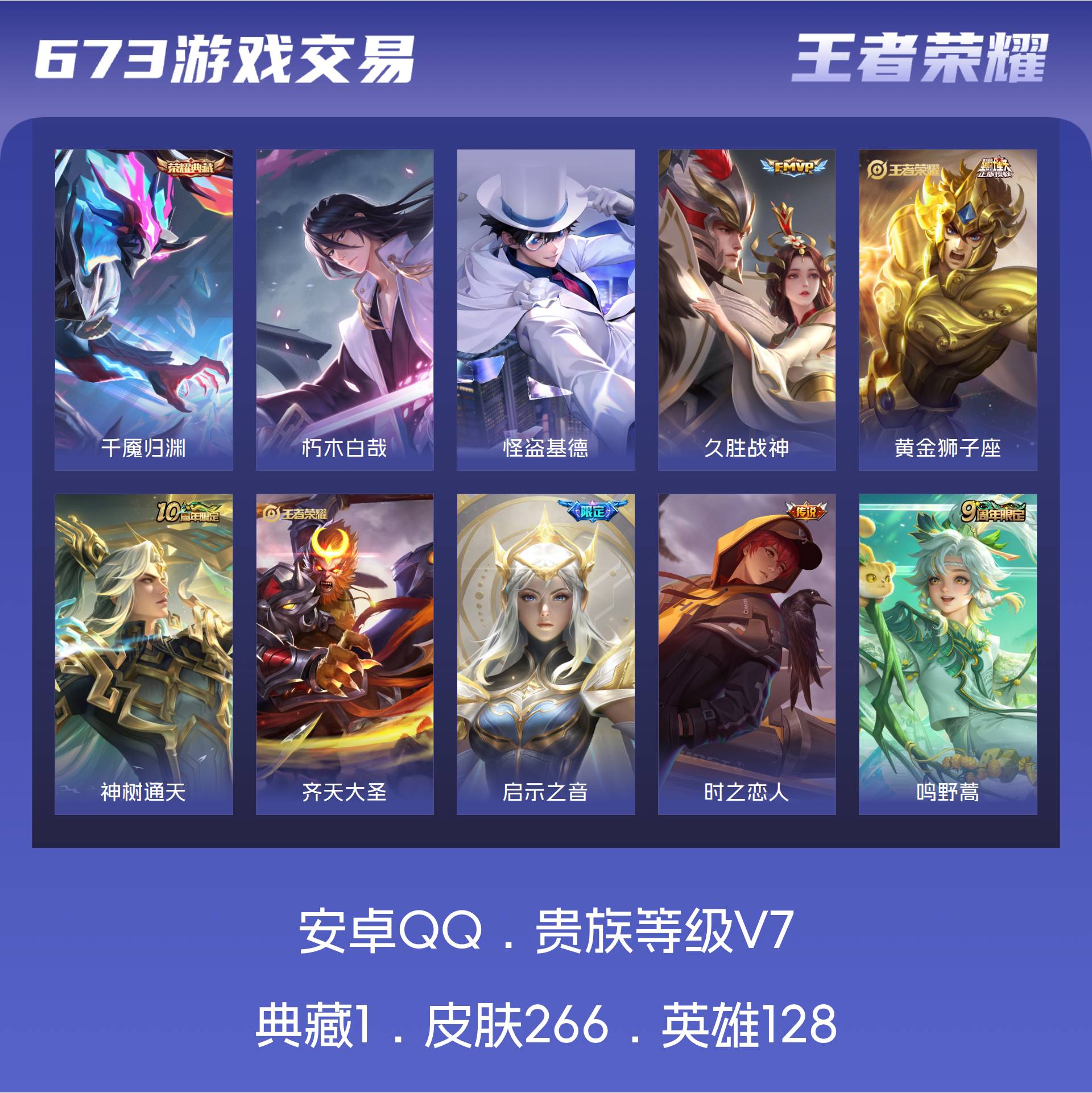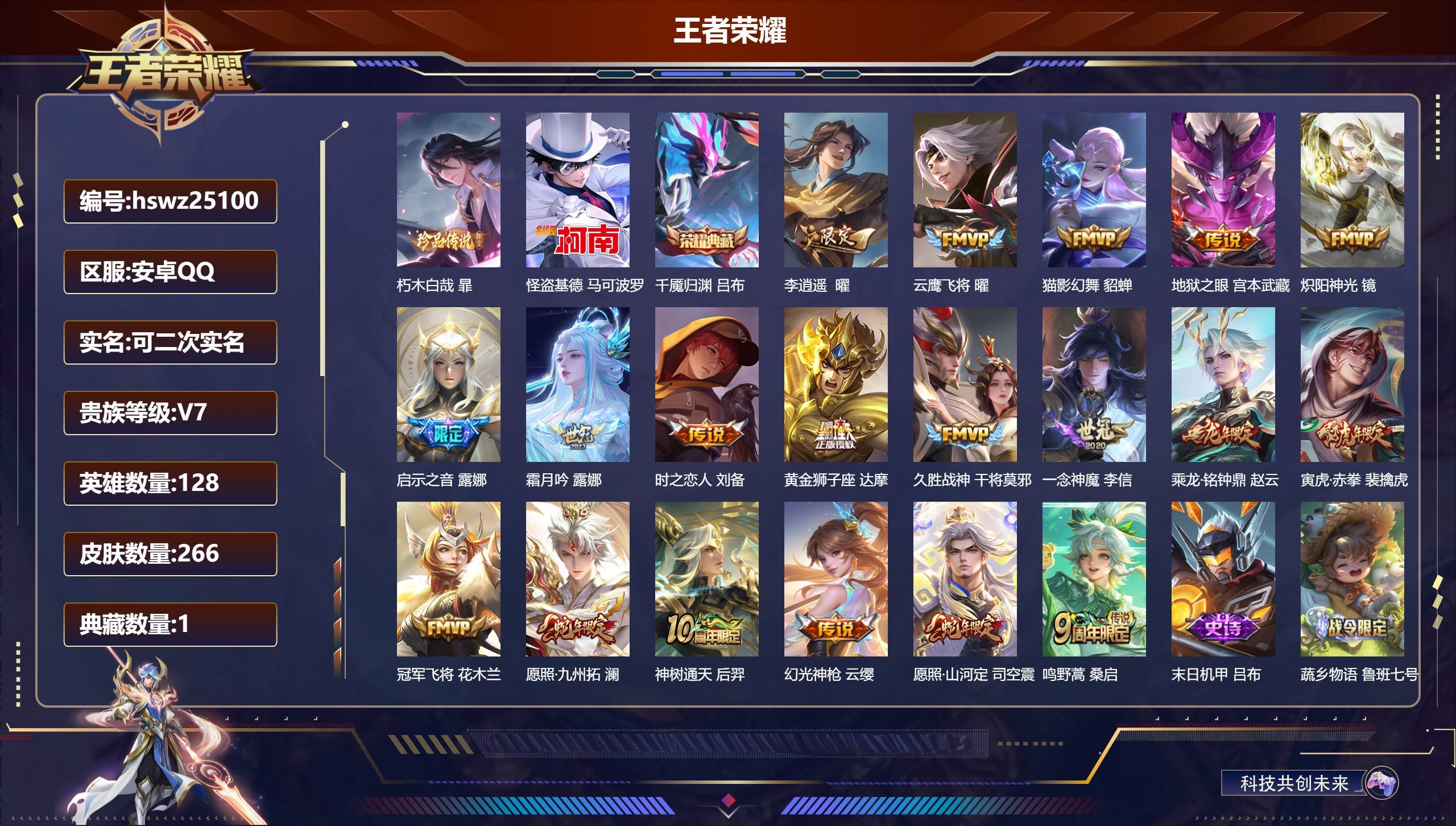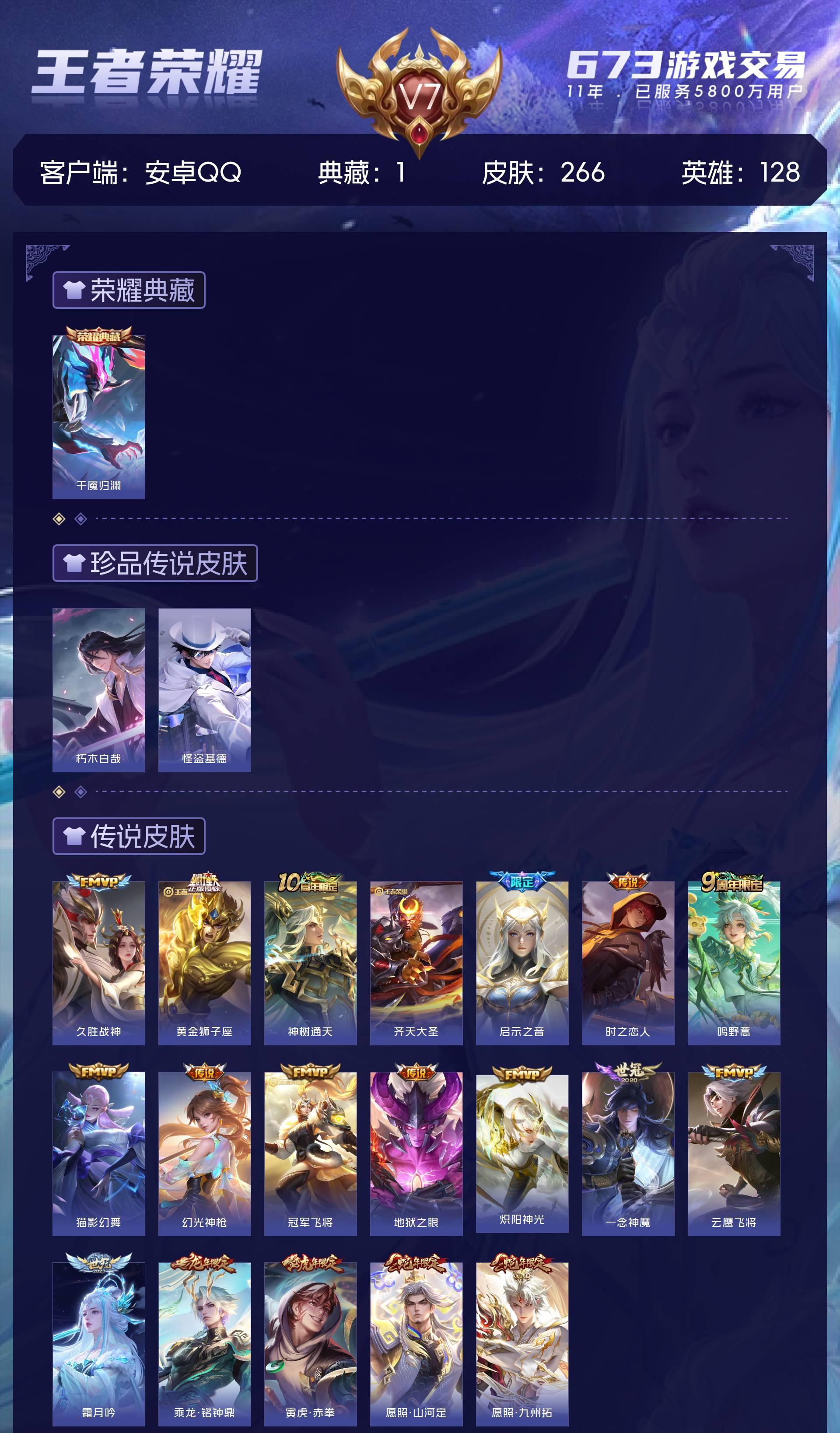 安卓QQ/最强王者/266皮肤/128英雄/1典藏/0珍品无双/0无双/2珍品传说/19传说/80史